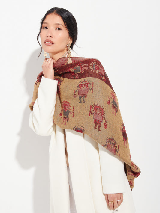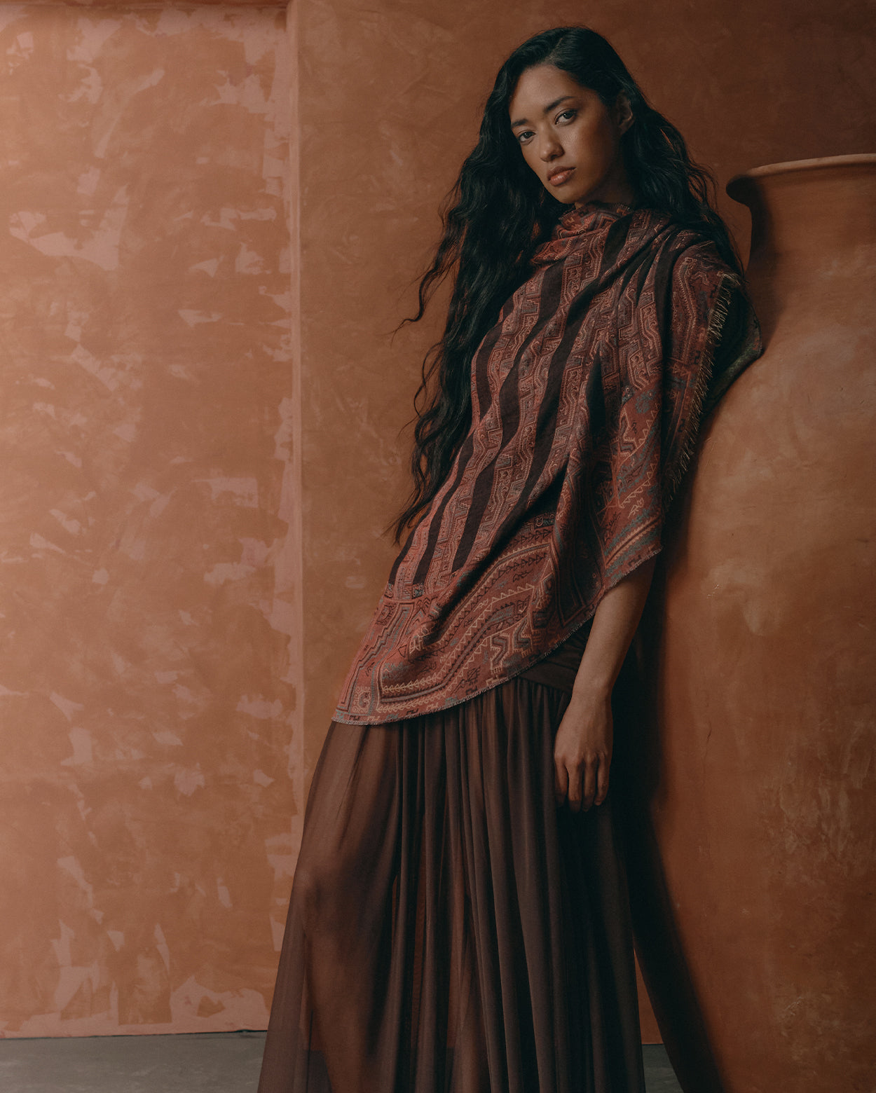 Estola Nazca 53 en tonalidad rojo, confeccionada en 70% baby alpaca y 30% seda, trabajada...