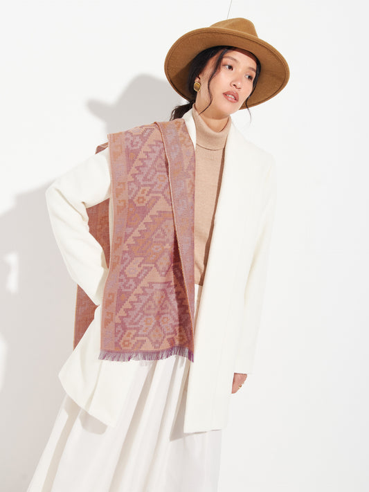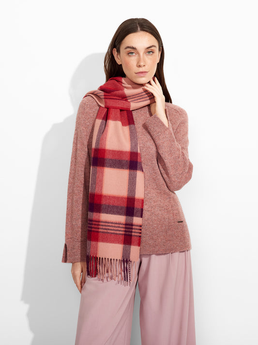 Chalina Ratti en tonalidad rosado, con diseño de patrón de cuadros. Los bordes con flecos...