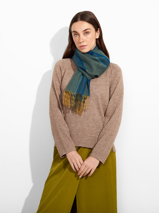 Chalina Zagoni en tonalidad verde, con diseño de rayas irregulares. Los bordes con flecos finos...