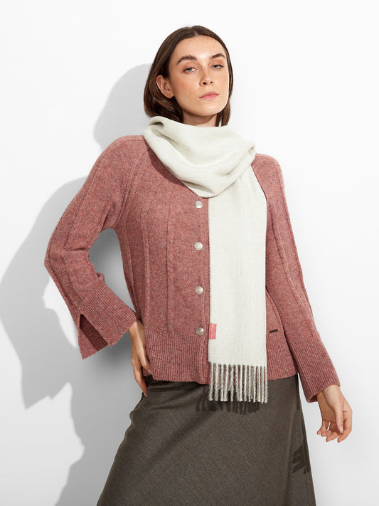 Chalina Zeta en tonalidad beige, de diseño de color entero con bordes terminados en flecos...