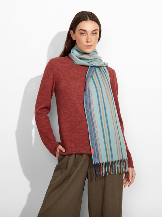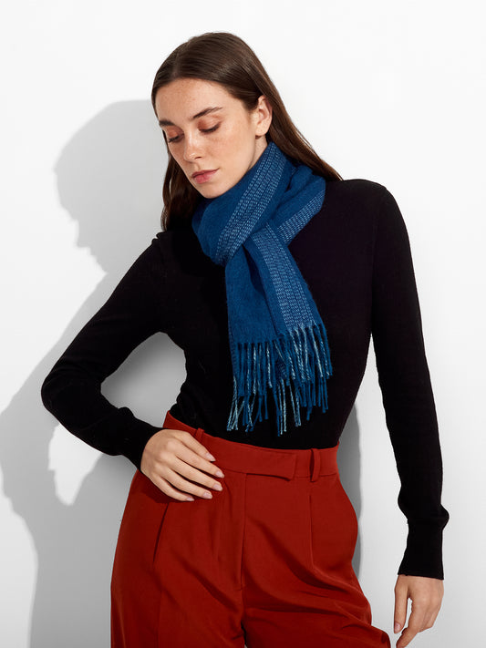 Chalina Zarick en tonalidad azul, con diseño de rayas verticales anchas. Los bordes presentan flecos...