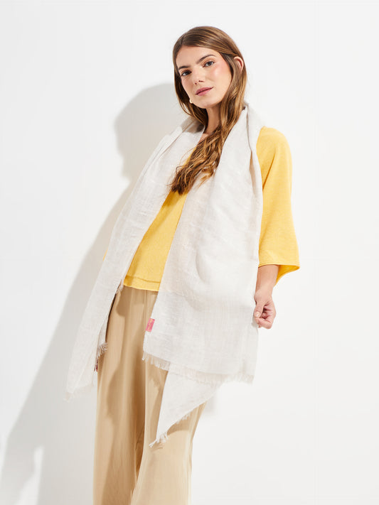 Estola Rum en tonalidad ecru, con bloques de color estrechos en los laterales, presenta bordes...