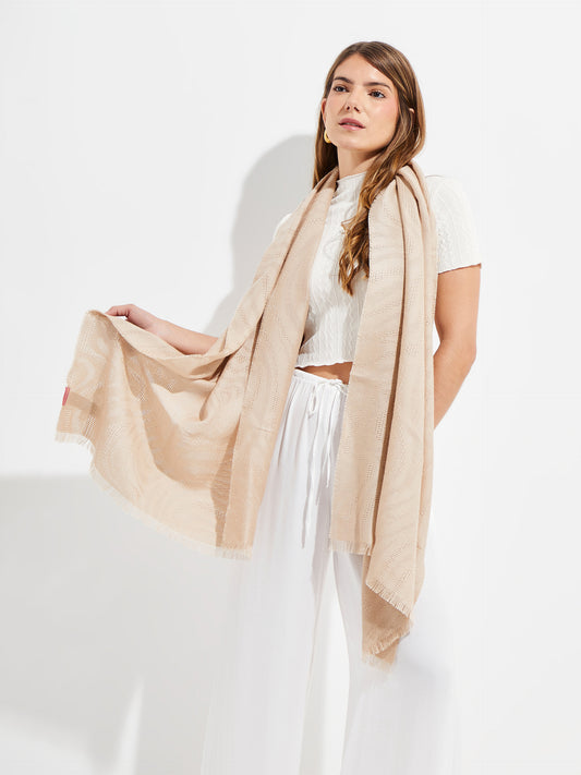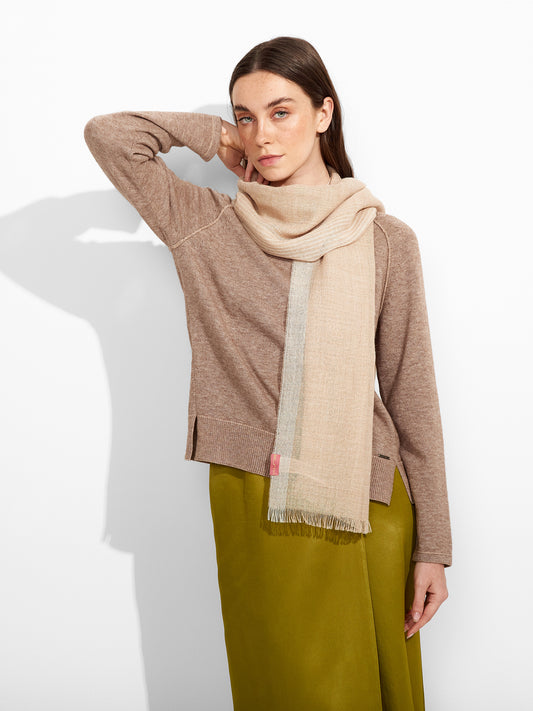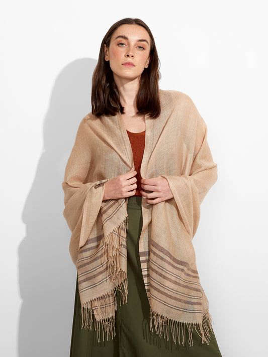 Estola Rum en tonalidad beige, con lineas contraste en los laterales, presenta bordes con flecos...