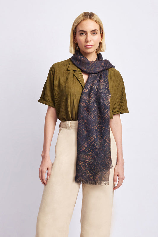Estola Wicht en tonalidad marrón, con diseño de bloques de color verticales, presenta bordes con...