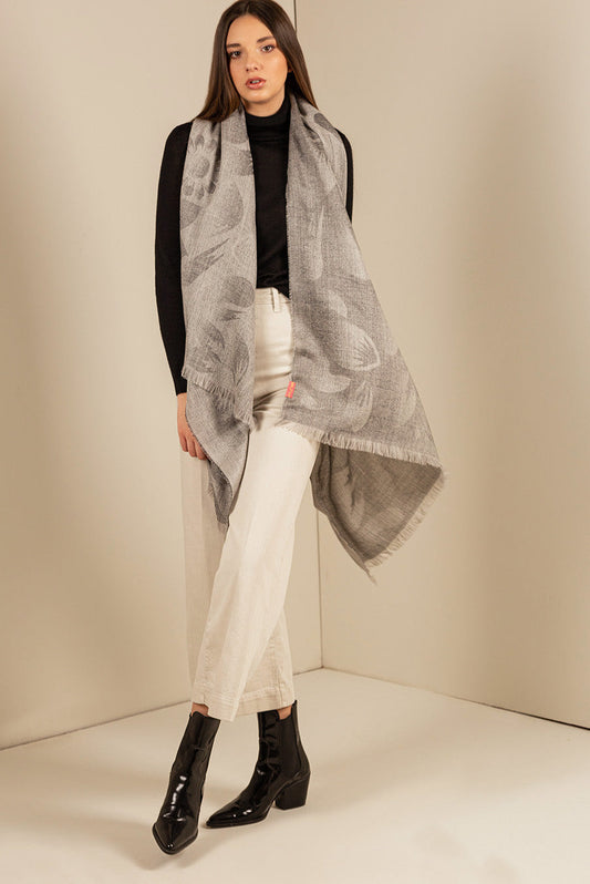 Estola Zulma en tonalidad gris, con un diseño de colores degradados, presenta bordes con flecos...