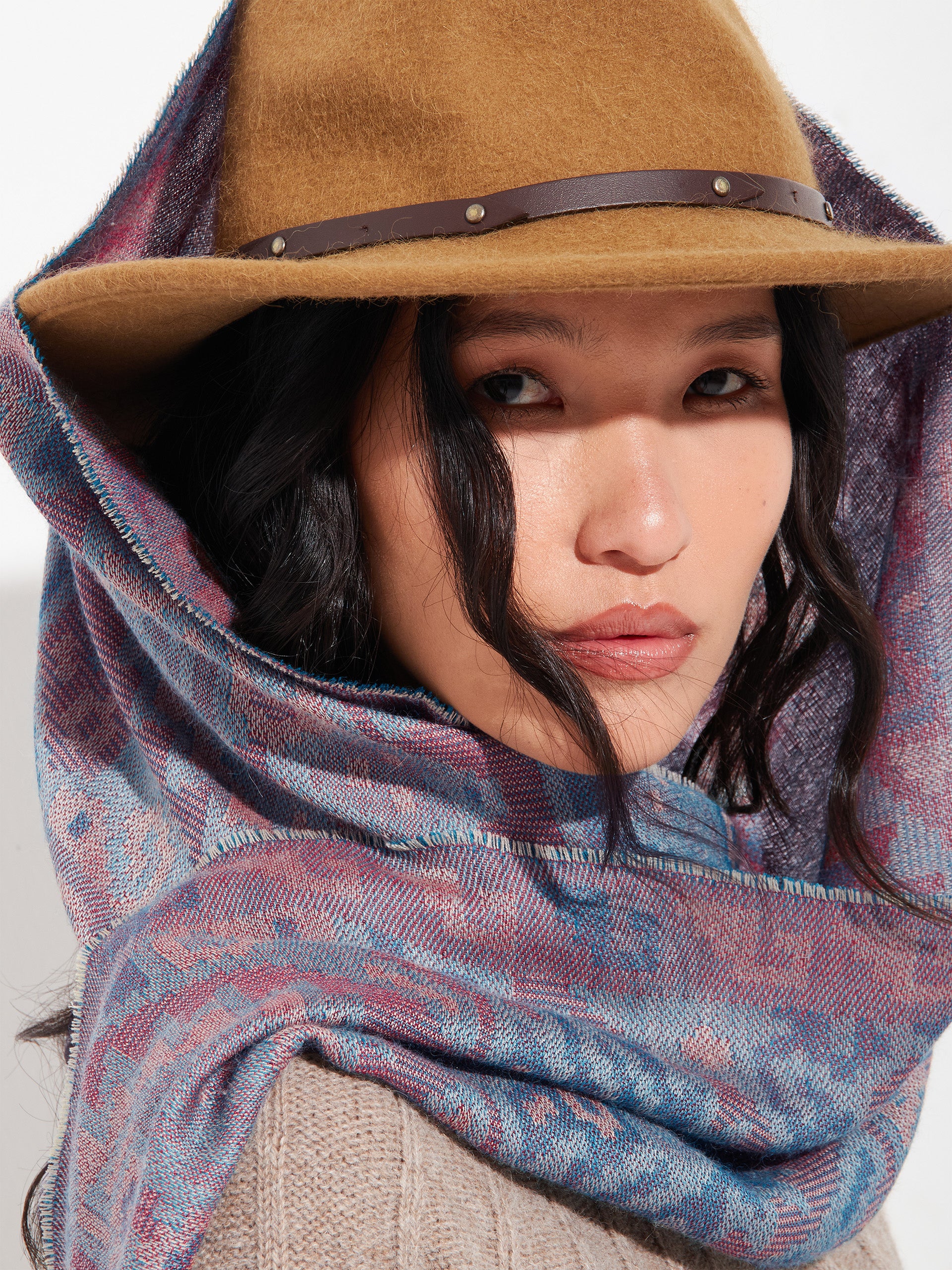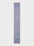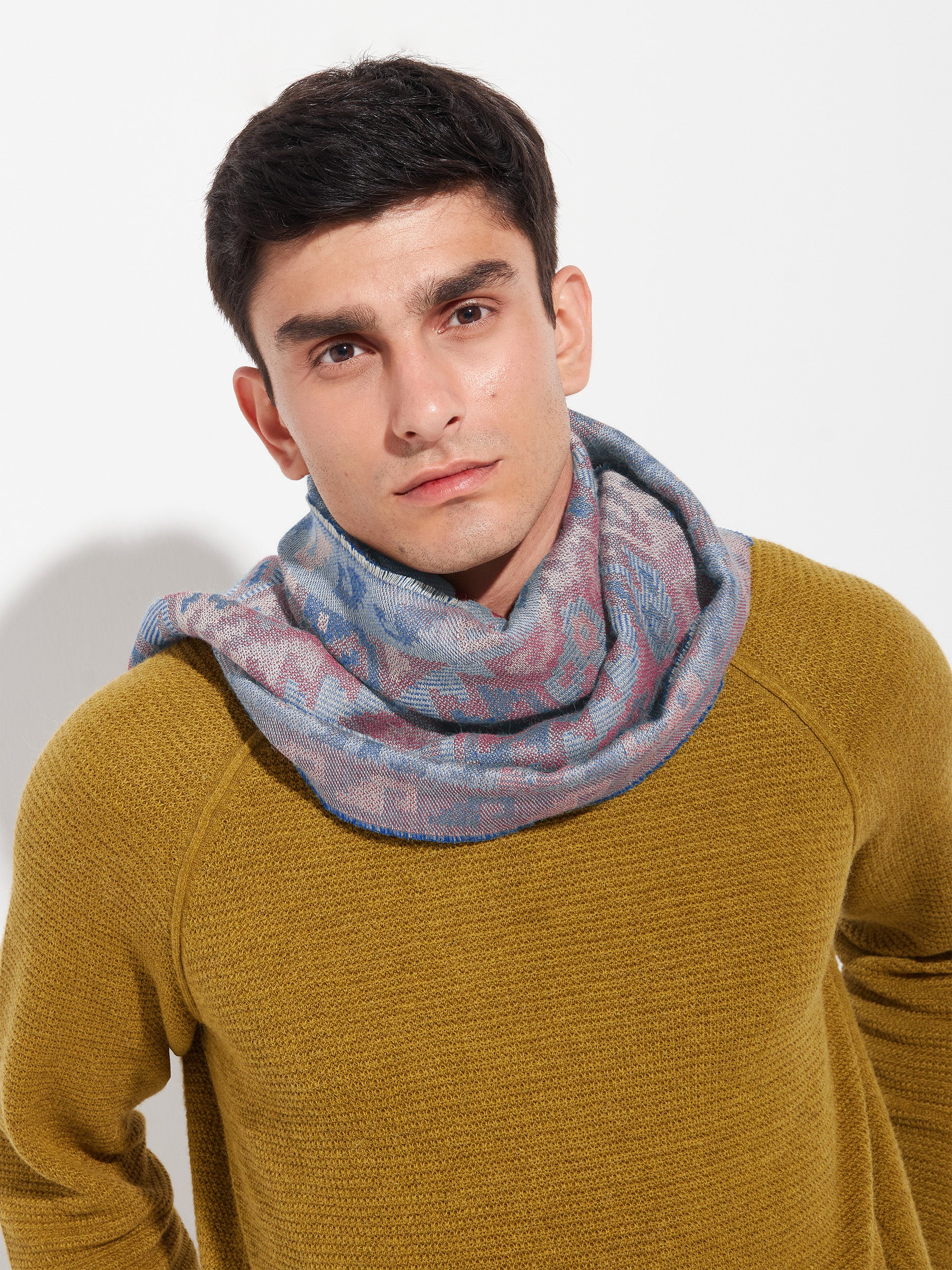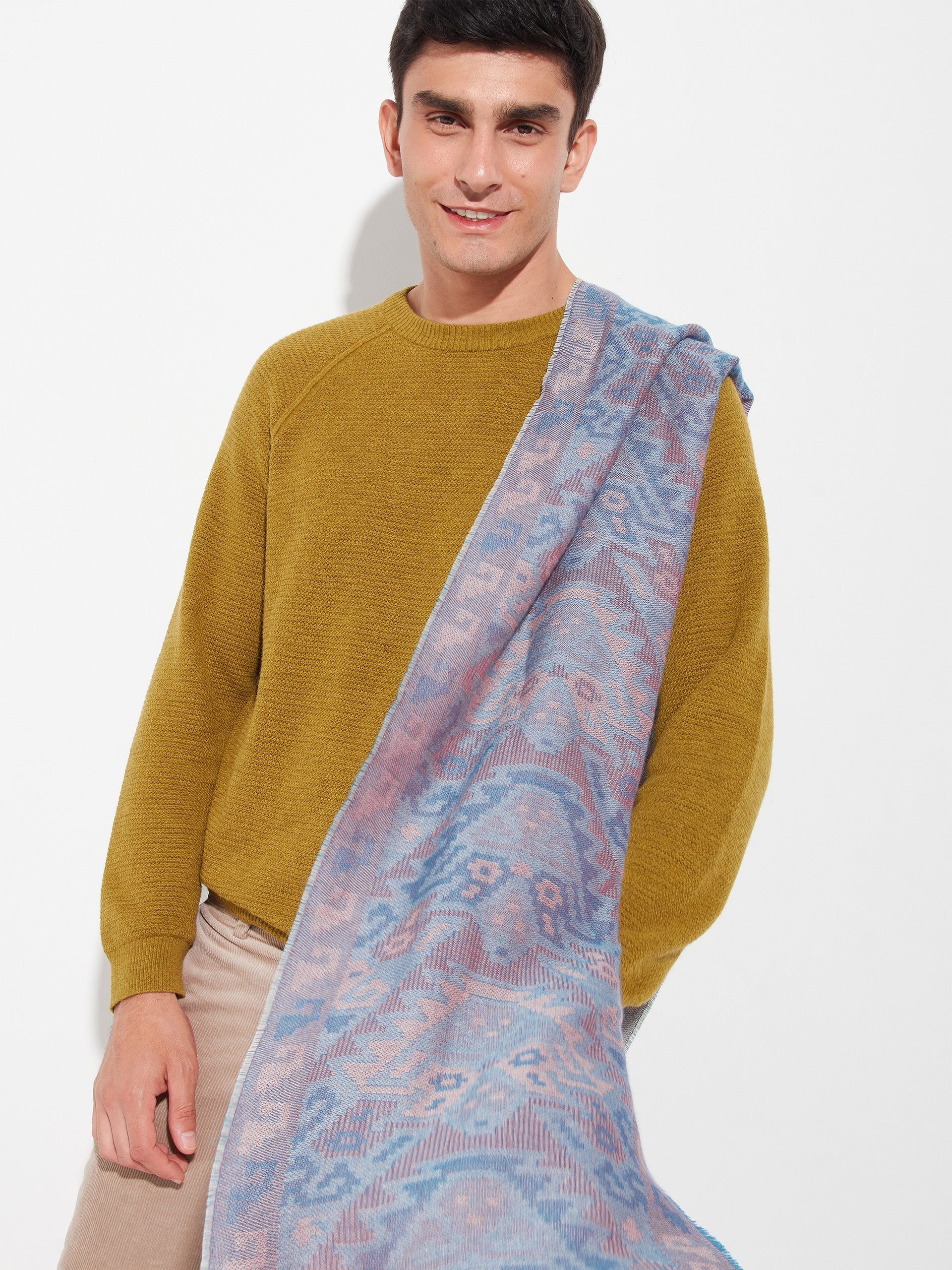 Chalina Chancay 38 en tonalidad azul, elaborada en 70% baby alpaca y 30% seda, con técnica Jacquard en doble cara. Con una medida de 200/196 x 30 cm, es un accesorio unisex y reversible, inspirado en la Cultura Chancay, que conecta con la memoria ancestral a través de un diseño auténticamente cultural. | Material predominante: Baby Alpaca