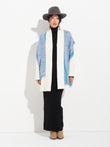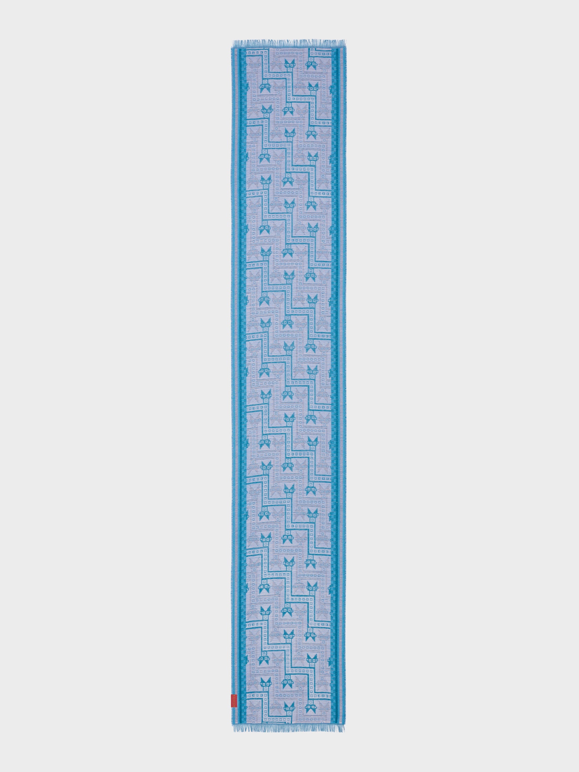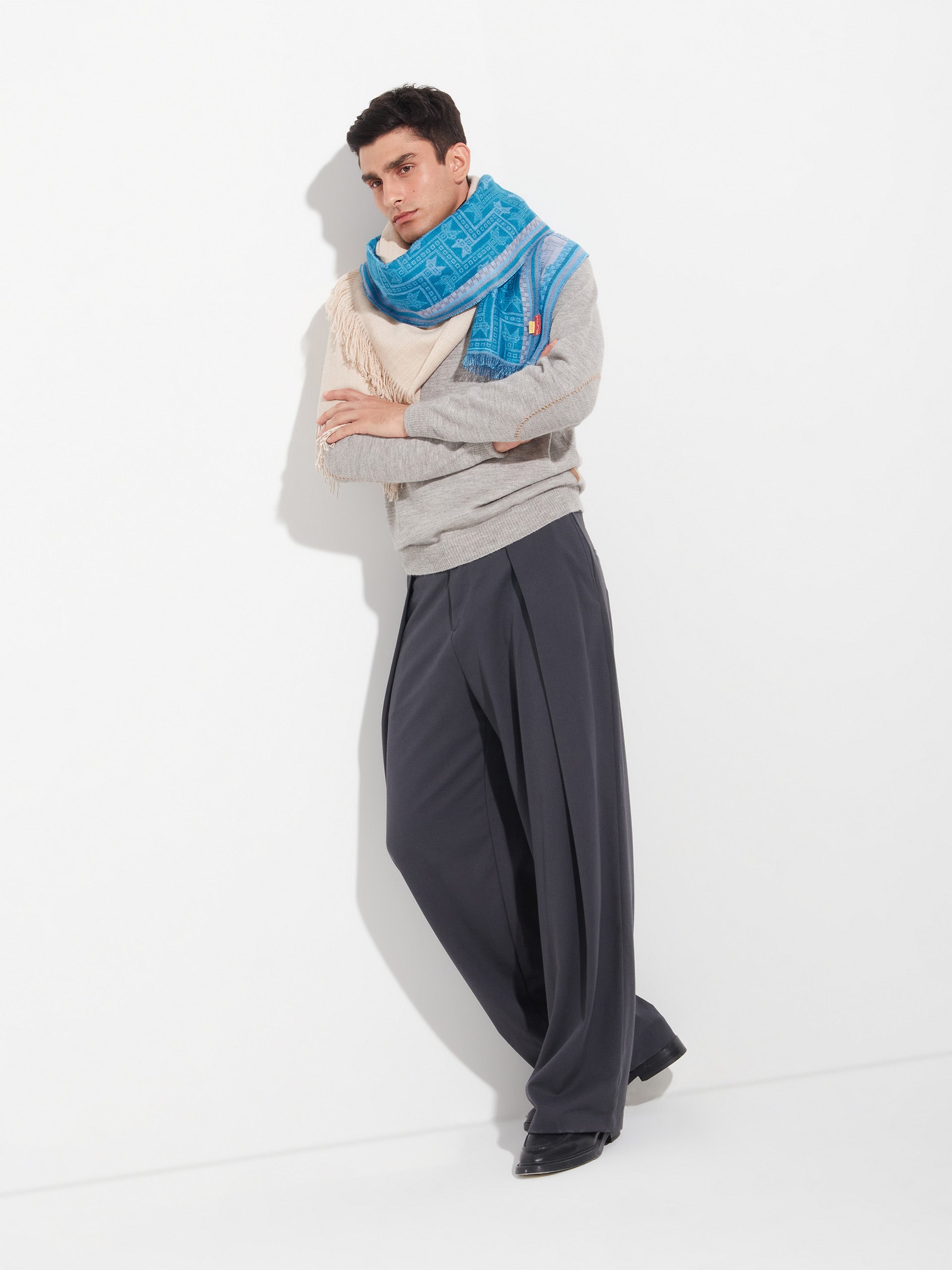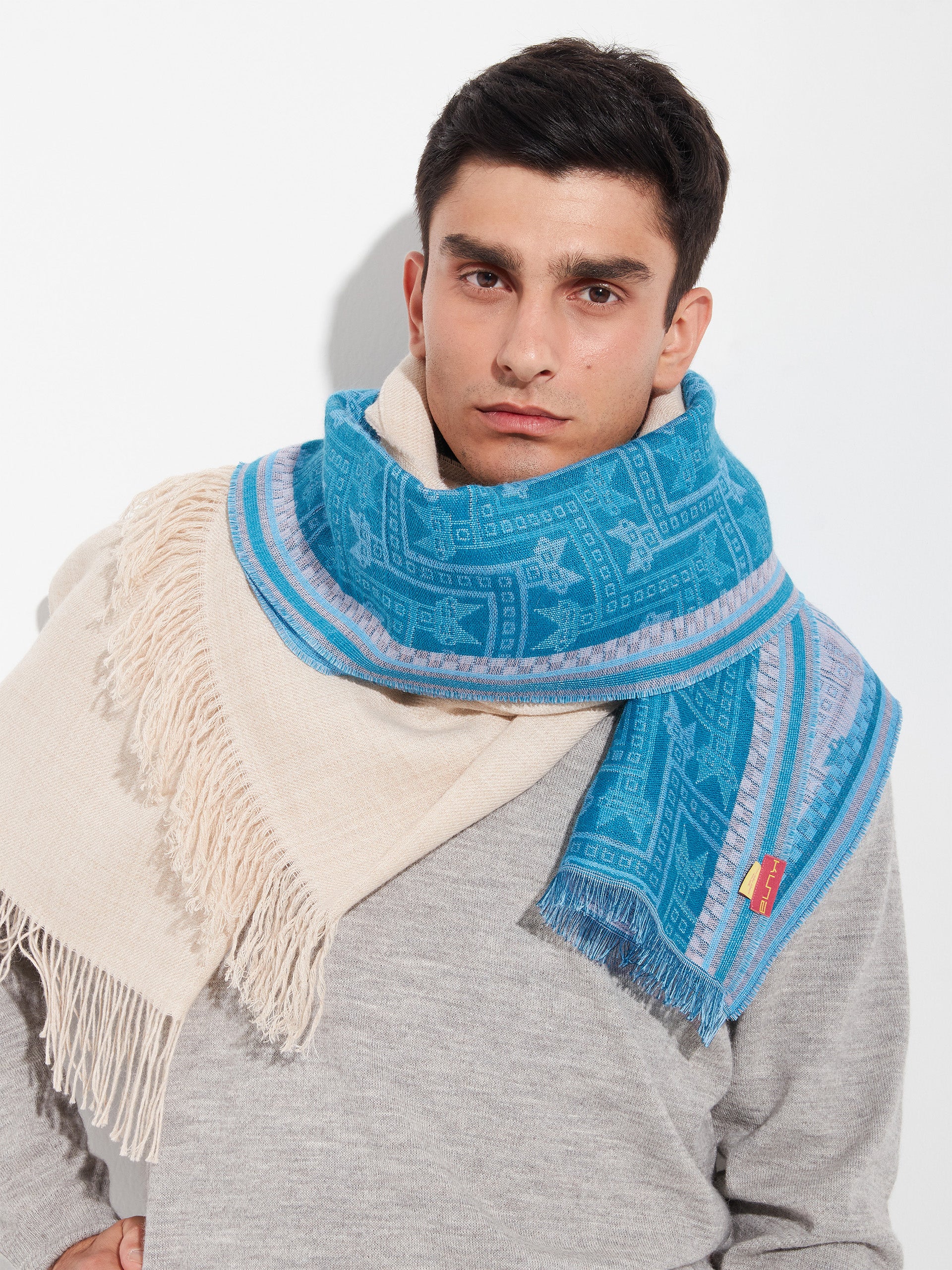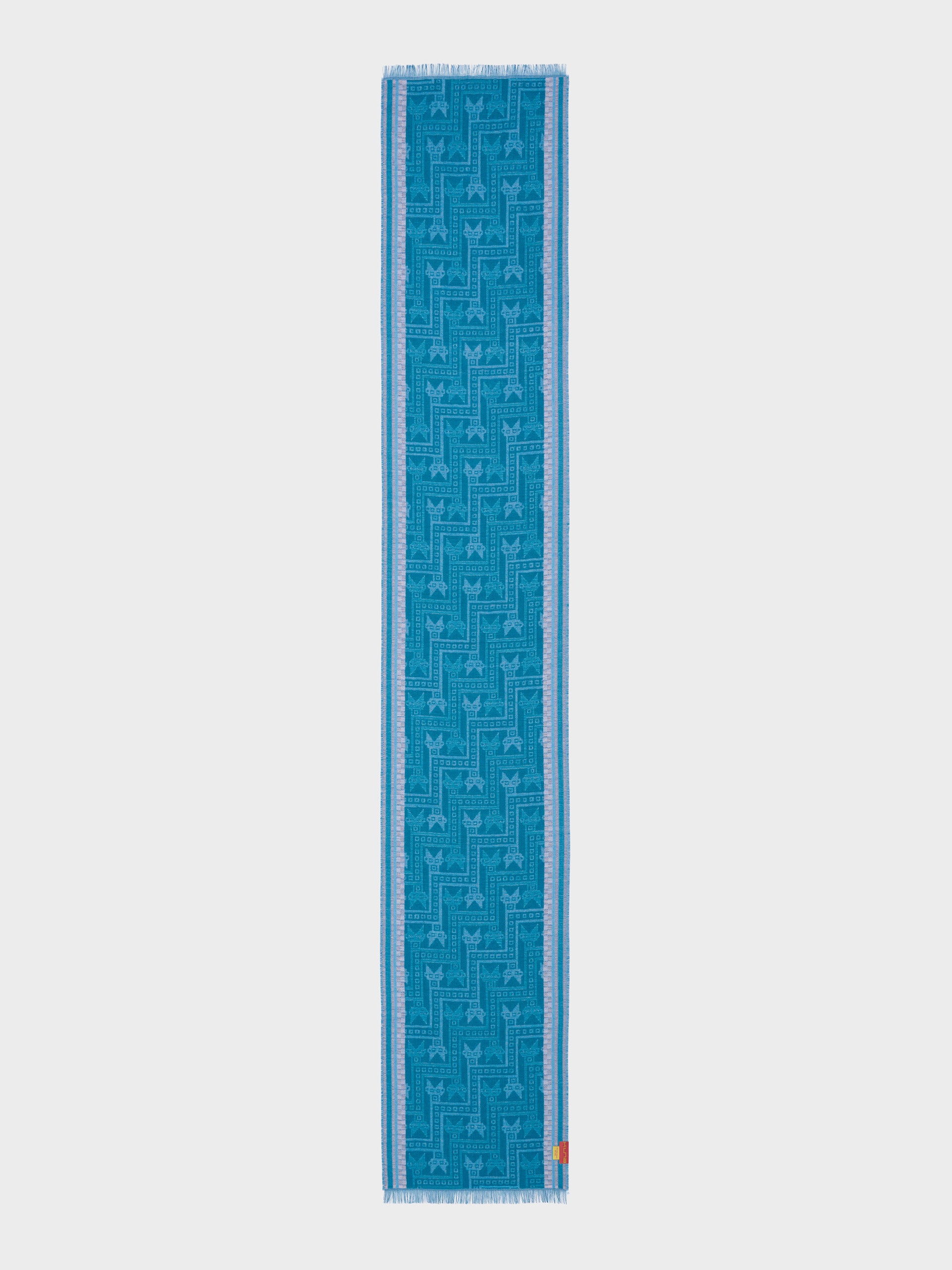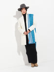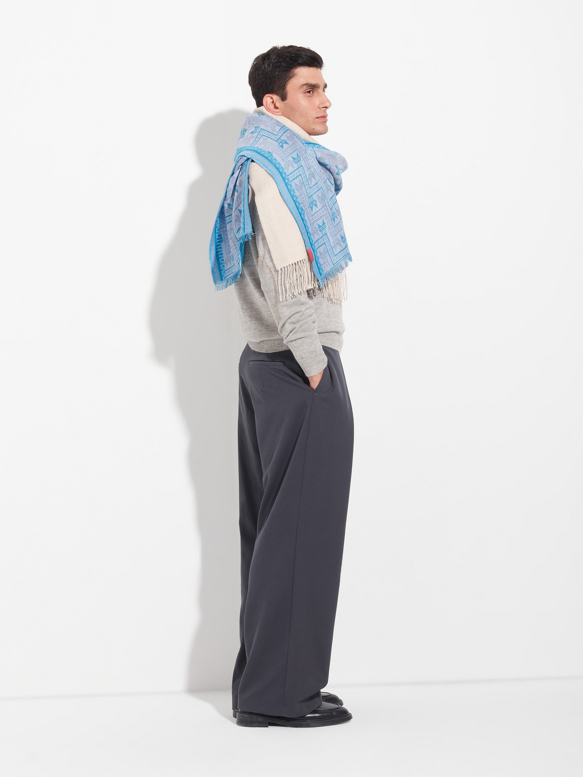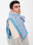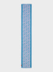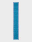 Chalina Chancay 39 en tonalidad azul, elaborada en 70% baby alpaca y 30% seda, con técnica Jacquard en doble tela e inserción de trama oculta. Con una medida de 180/176 x 30 cm, es un accesorio unisex y reversible, inspirado en la Cultura Chancay, que evoca la riqueza de las tradiciones antiguas a través de un diseño con identidad cultural. | Material predominante: Baby Alpaca