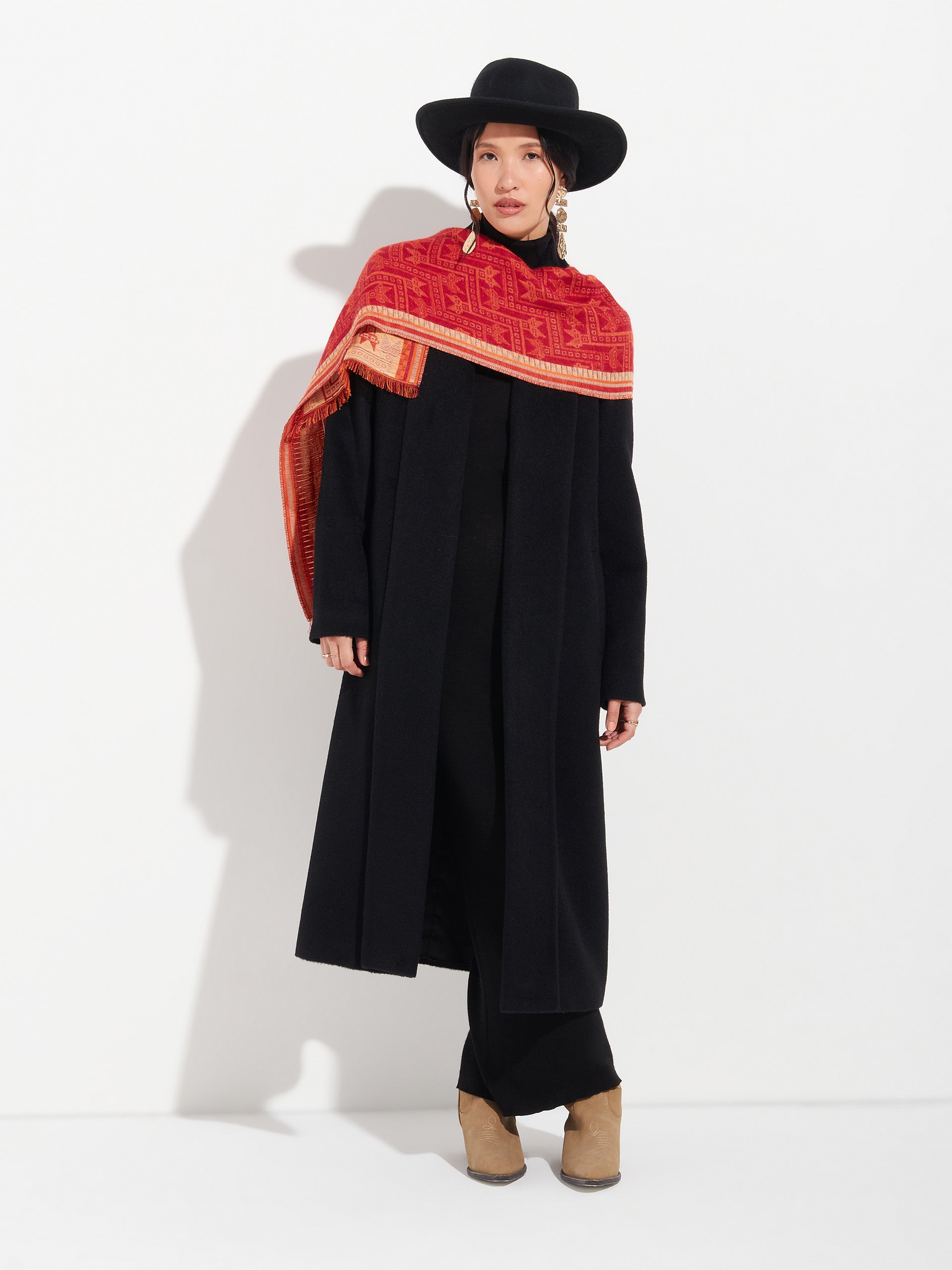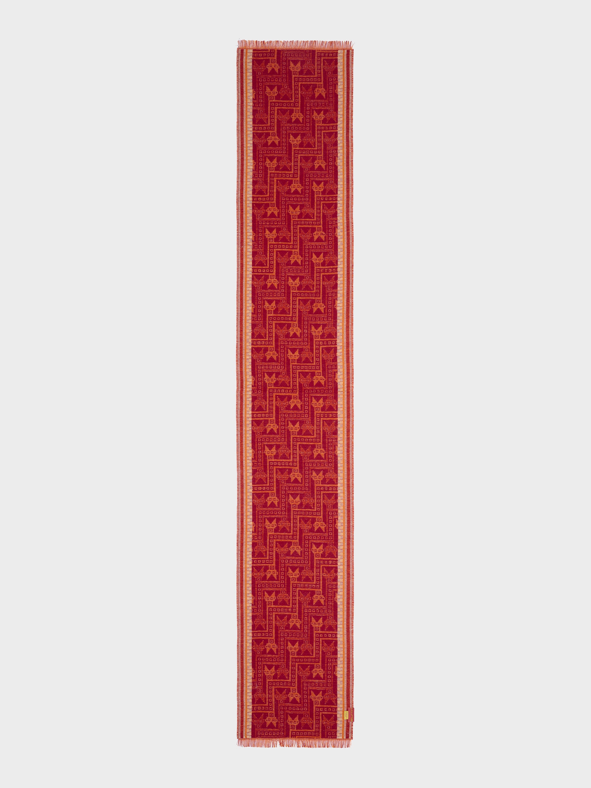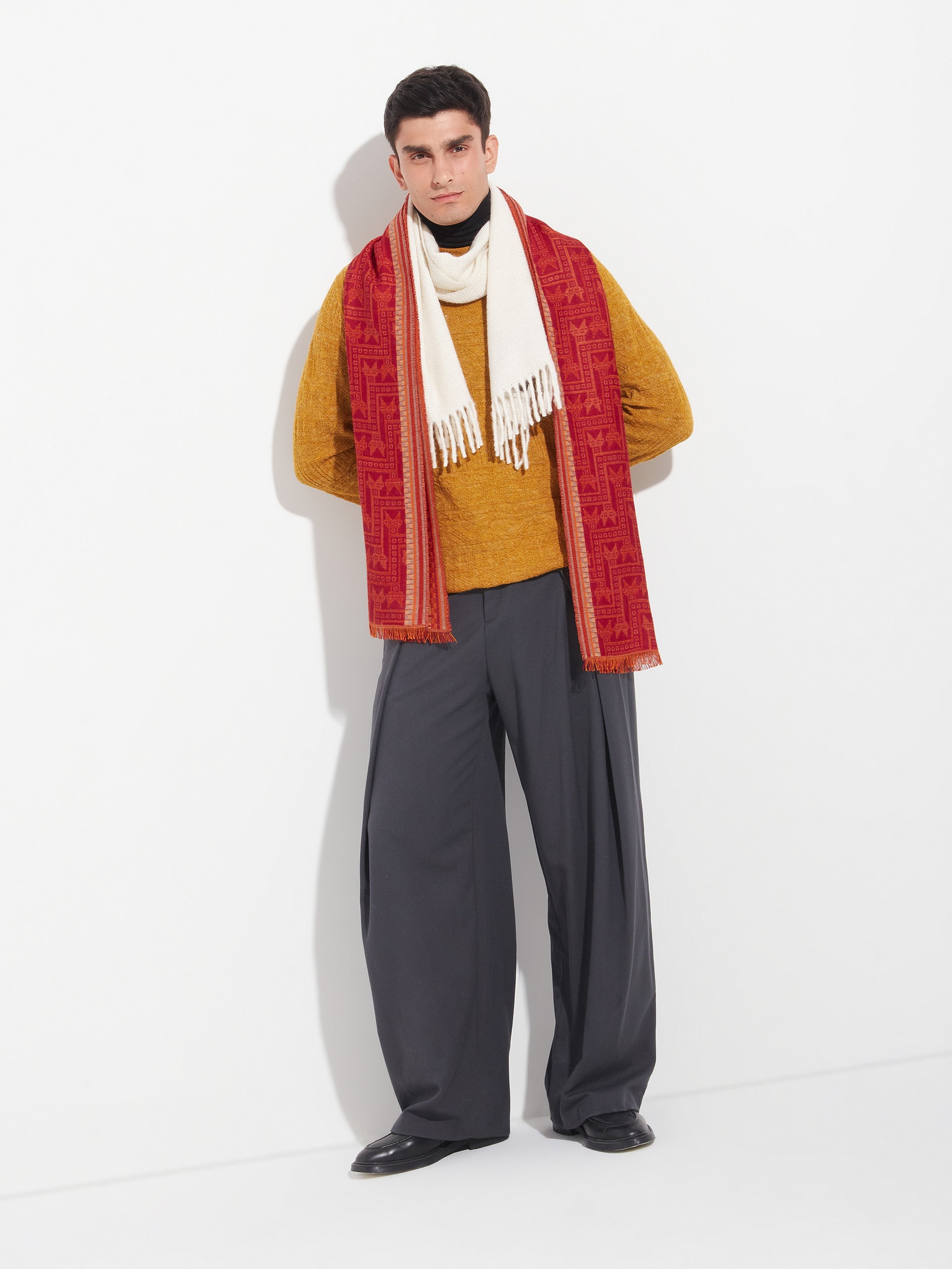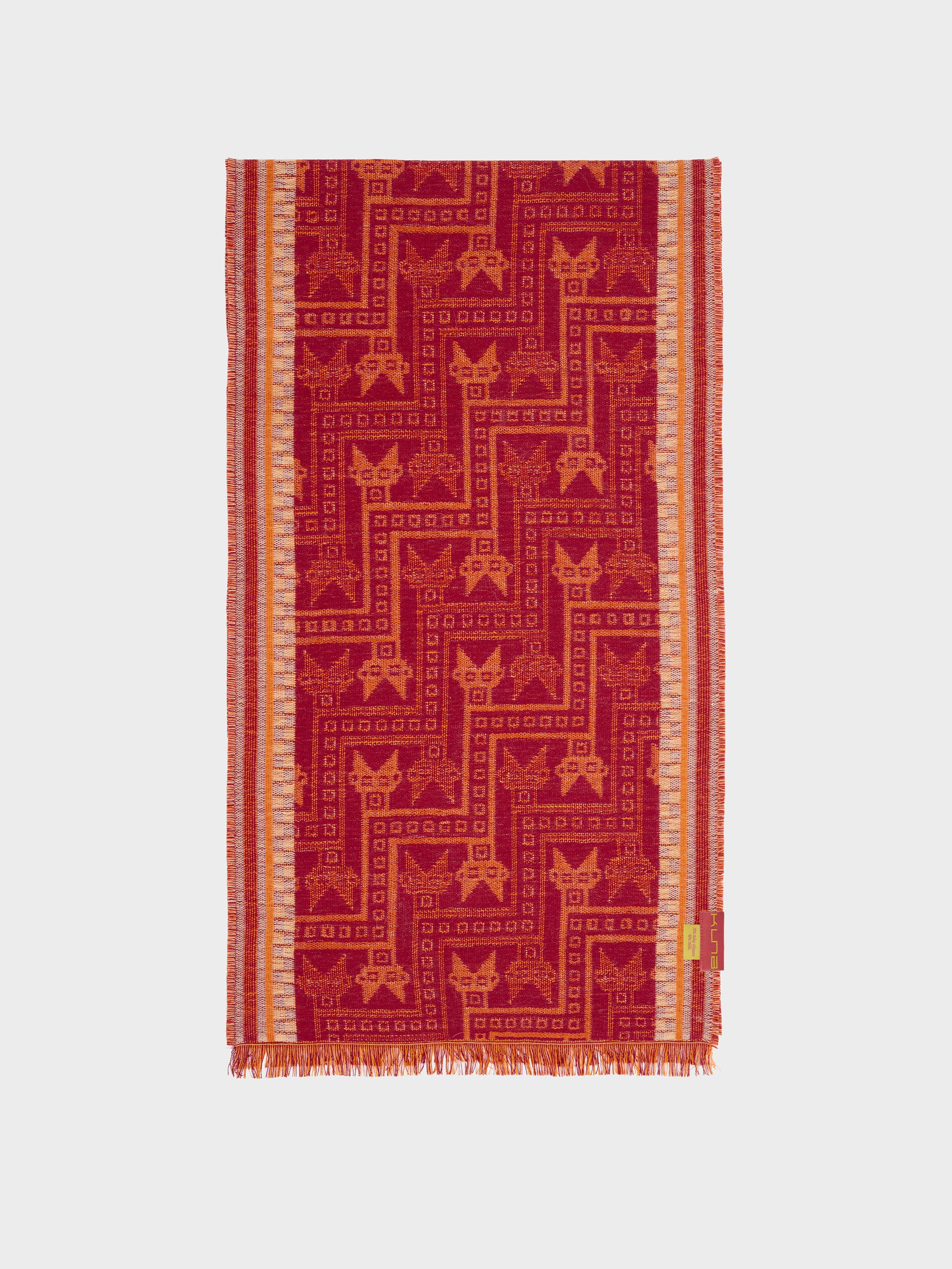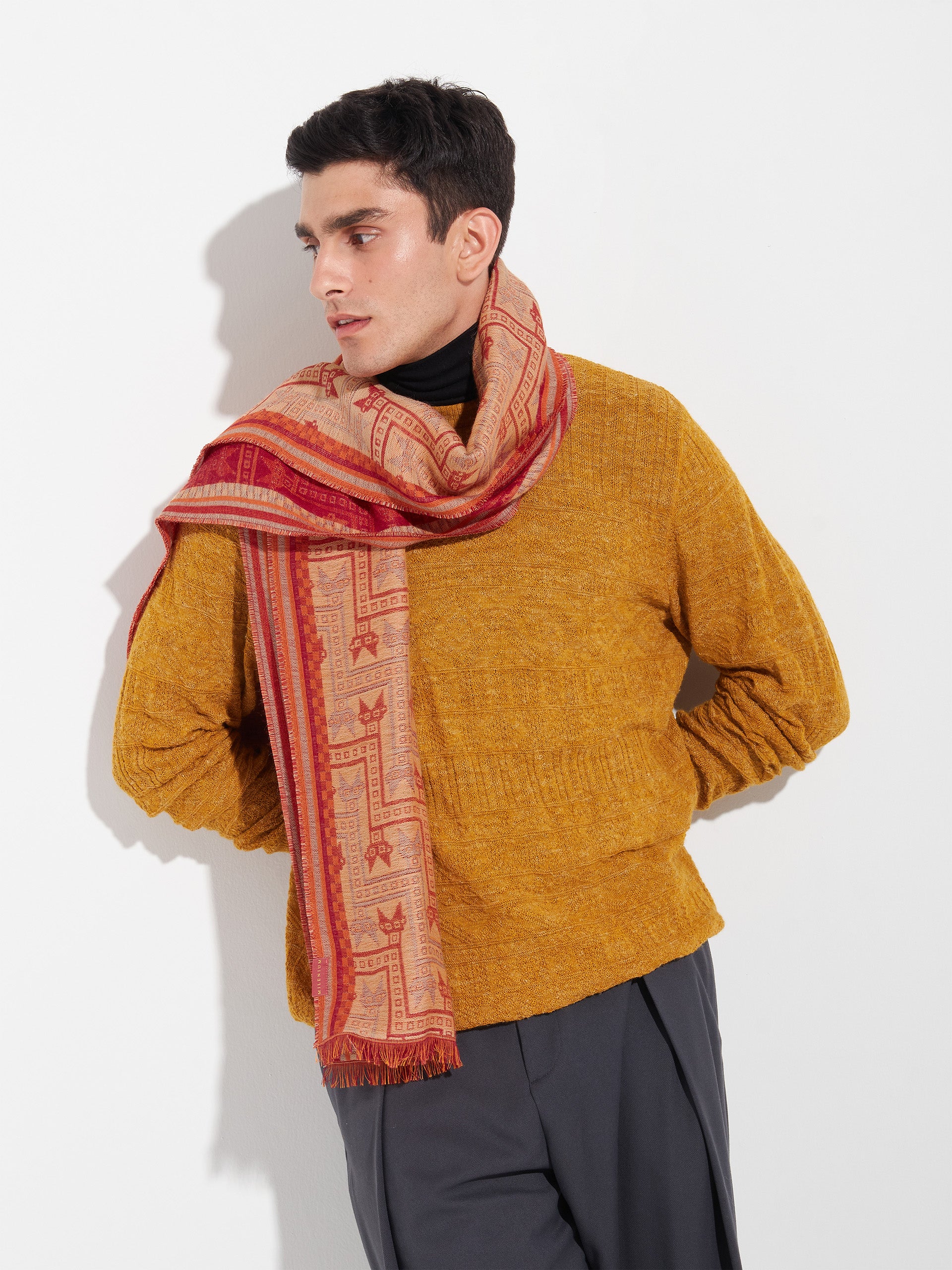 Chalina Chancay 39 en tonalidad rojo, elaborada en 70% baby alpaca y 30% seda, con técnica Jacquard en doble tela e inserción de trama oculta. Con una medida de 180/176 x 30 cm, es un accesorio unisex y reversible, inspirado en la Cultura Chancay, que evoca la riqueza de las tradiciones antiguas a través de un diseño con identidad cultural. | Material predominante: Baby Alpaca