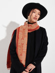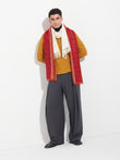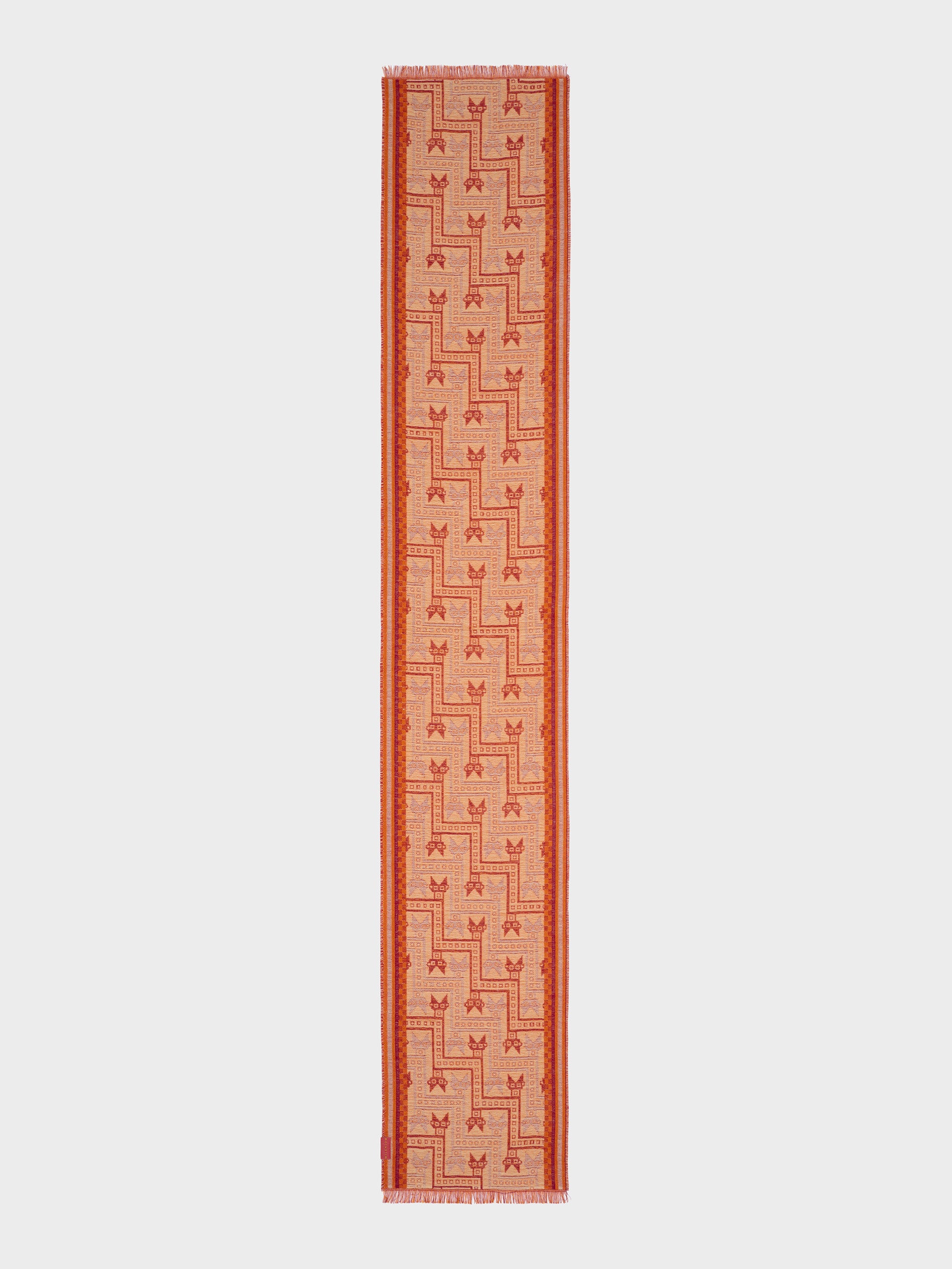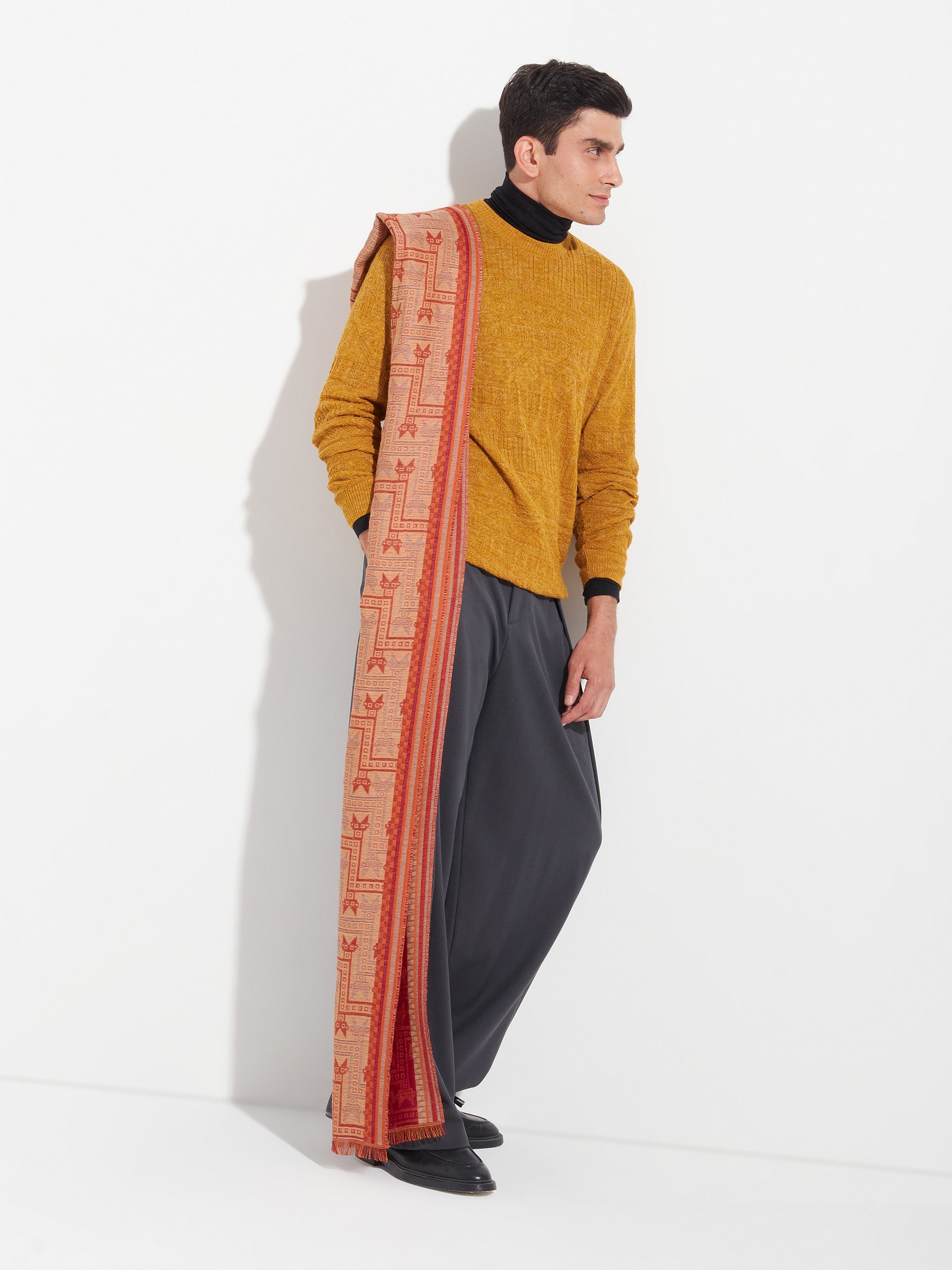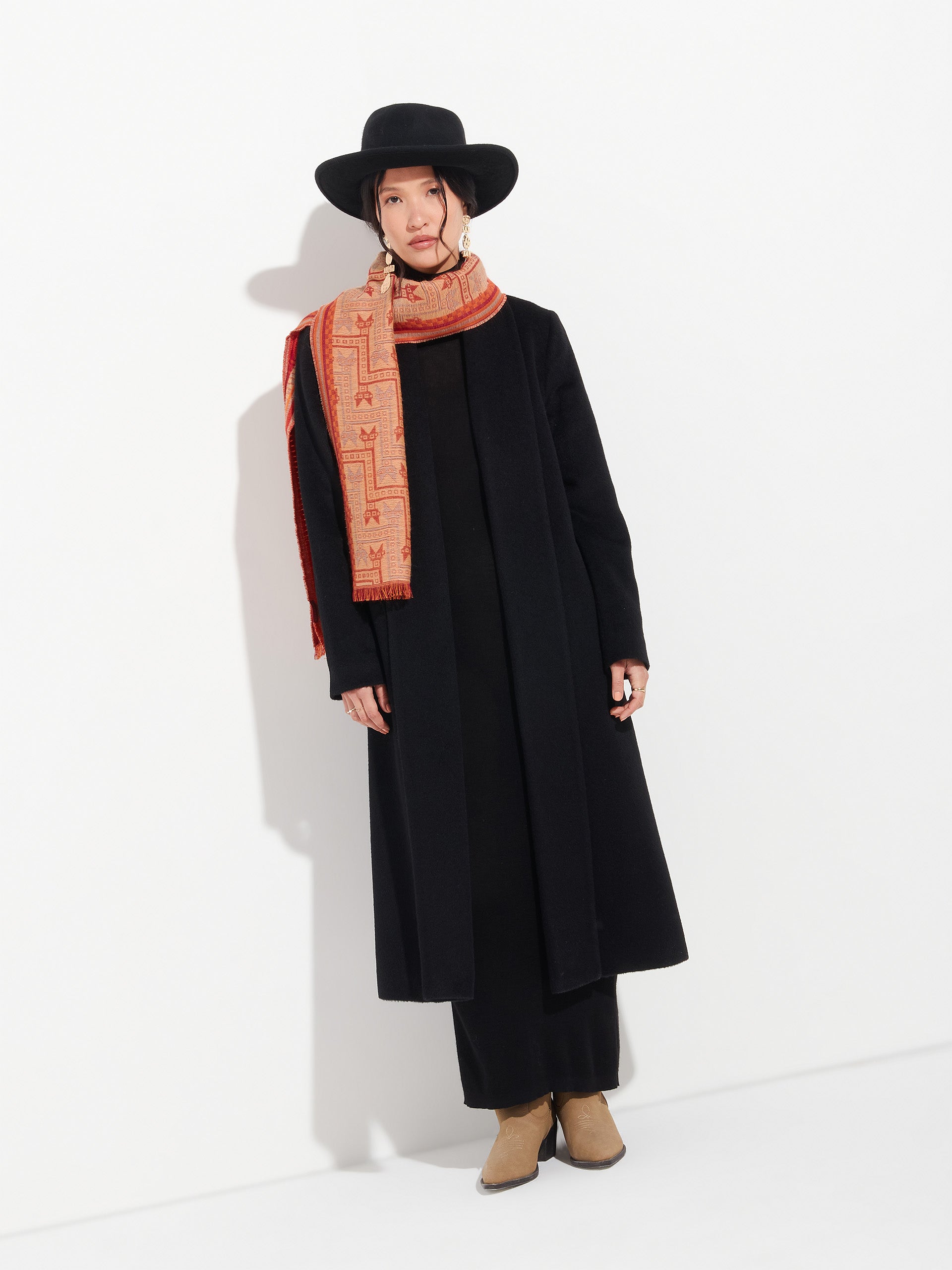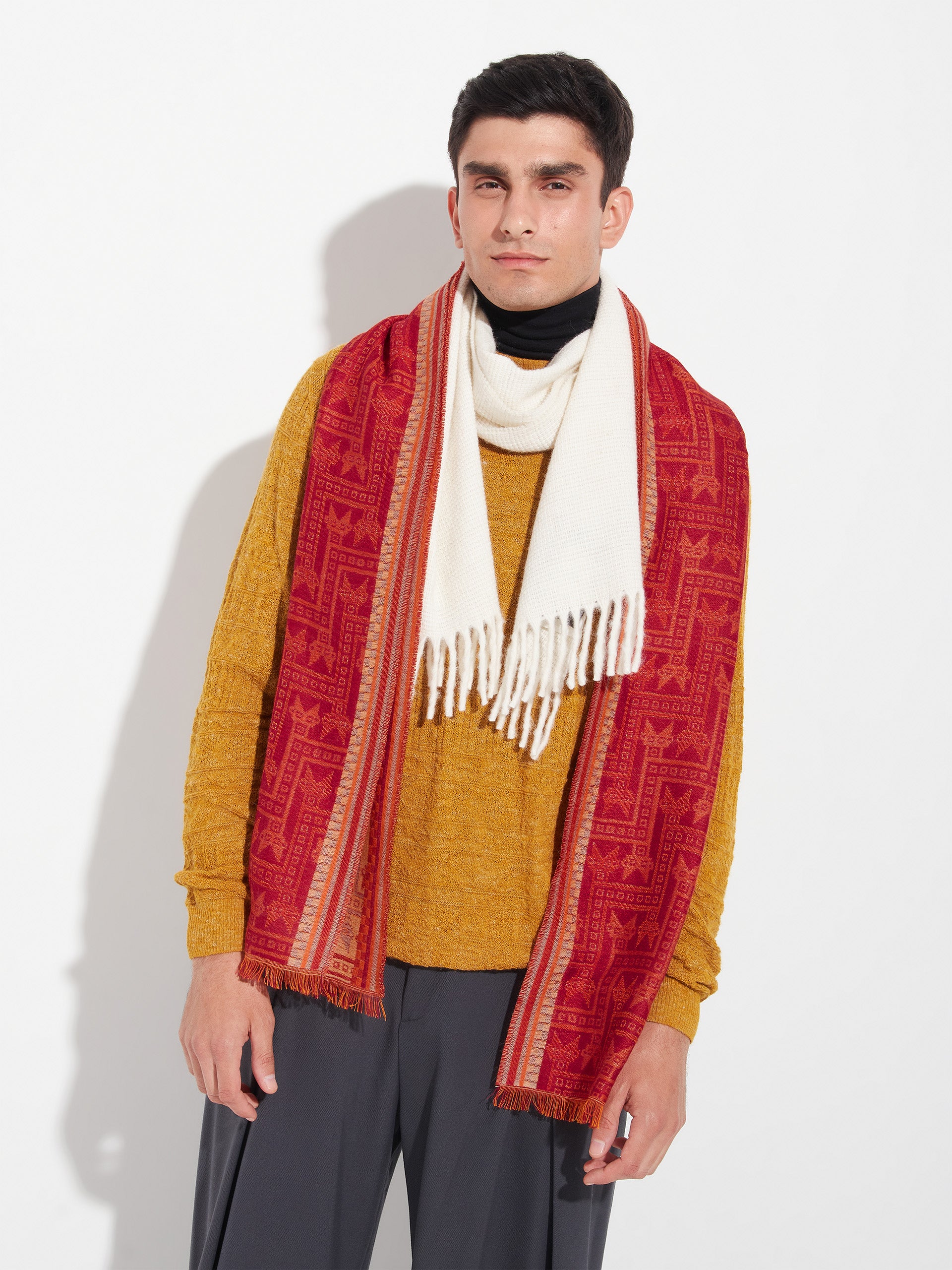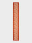 Chalina Chancay 39 en tonalidad rojo, elaborada en 70% baby alpaca y 30% seda, con técnica Jacquard en doble tela e inserción de trama oculta. Con una medida de 180/176 x 30 cm, es un accesorio unisex y reversible, inspirado en la Cultura Chancay, que evoca la riqueza de las tradiciones antiguas a través de un diseño con identidad cultural. | Material predominante: Baby Alpaca