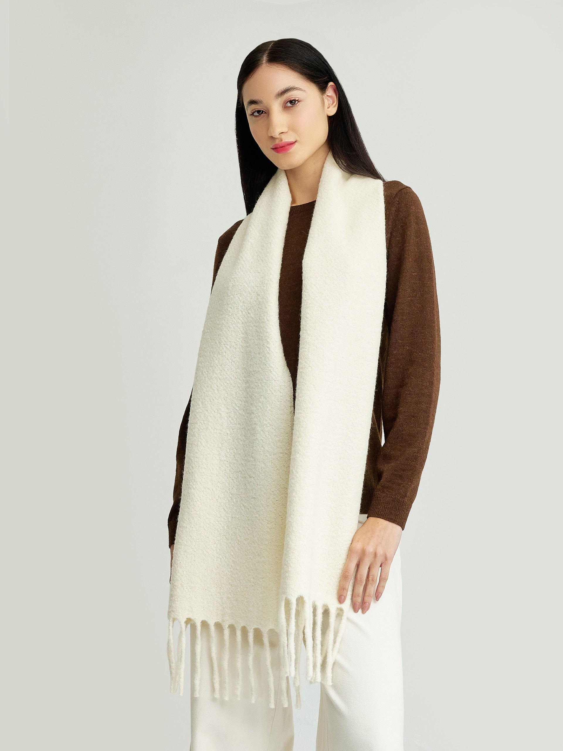 La chalina Yamileth, con su color suave y delicados acabados, representa la máxima expresión de elegancia. Elaborada con exquisita combinación de baby alpaca y lana, esta chalina no solo realza tu estilo, sino que también te envuelve en una suavidad y calidez incomparables. Un complemento que eleva tu presencia con distinción. | Material predominante: Baby Alpaca & Lana
