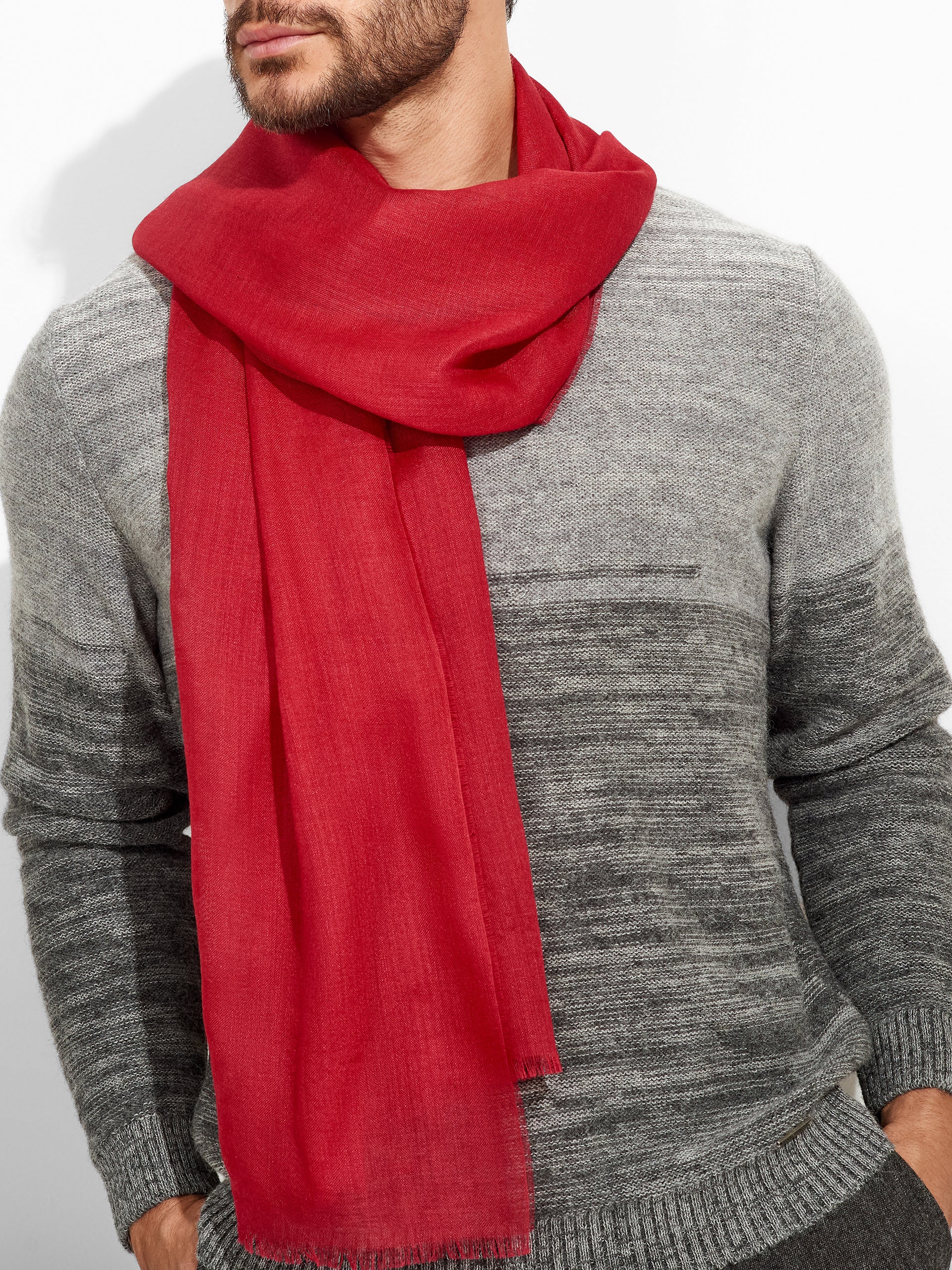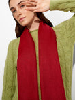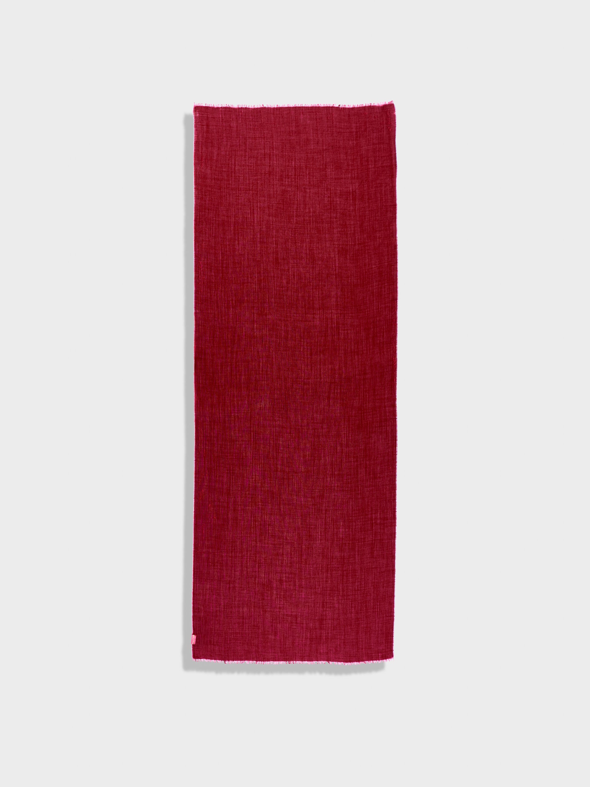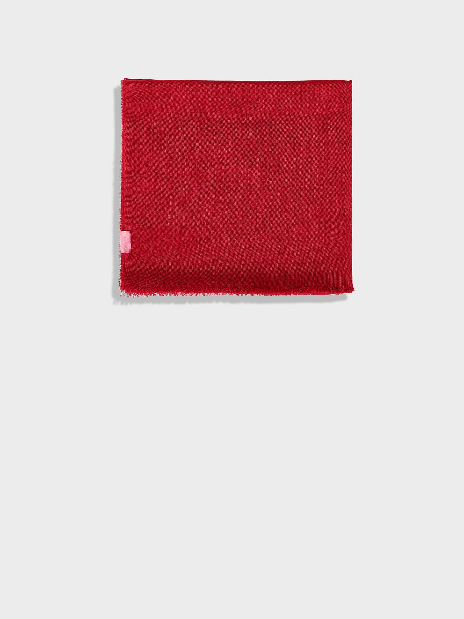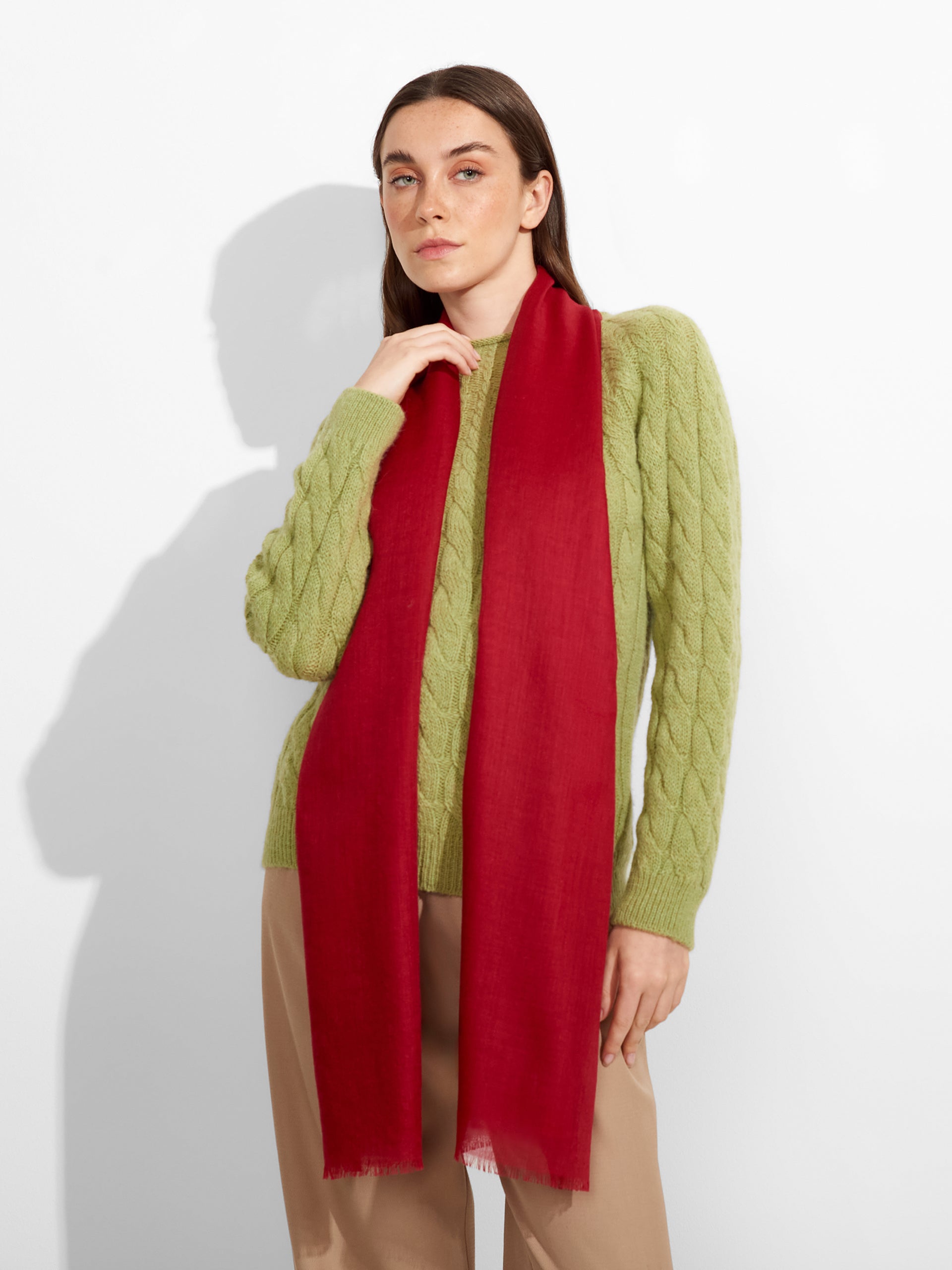 Estola Alondra en tonalidad rojo, de color entero, presenta bordes con flecos finos. Confeccionada en baby alpaca y seda, combina ligereza y suavidad. | Material predominante: Baby Alpaca