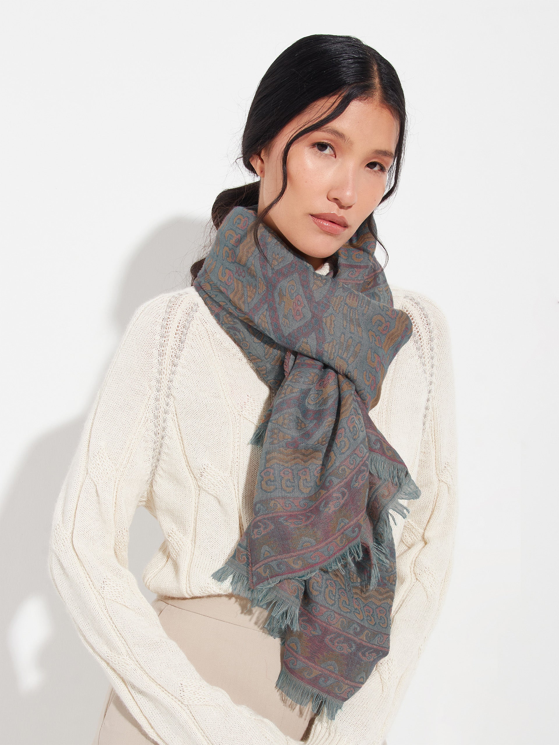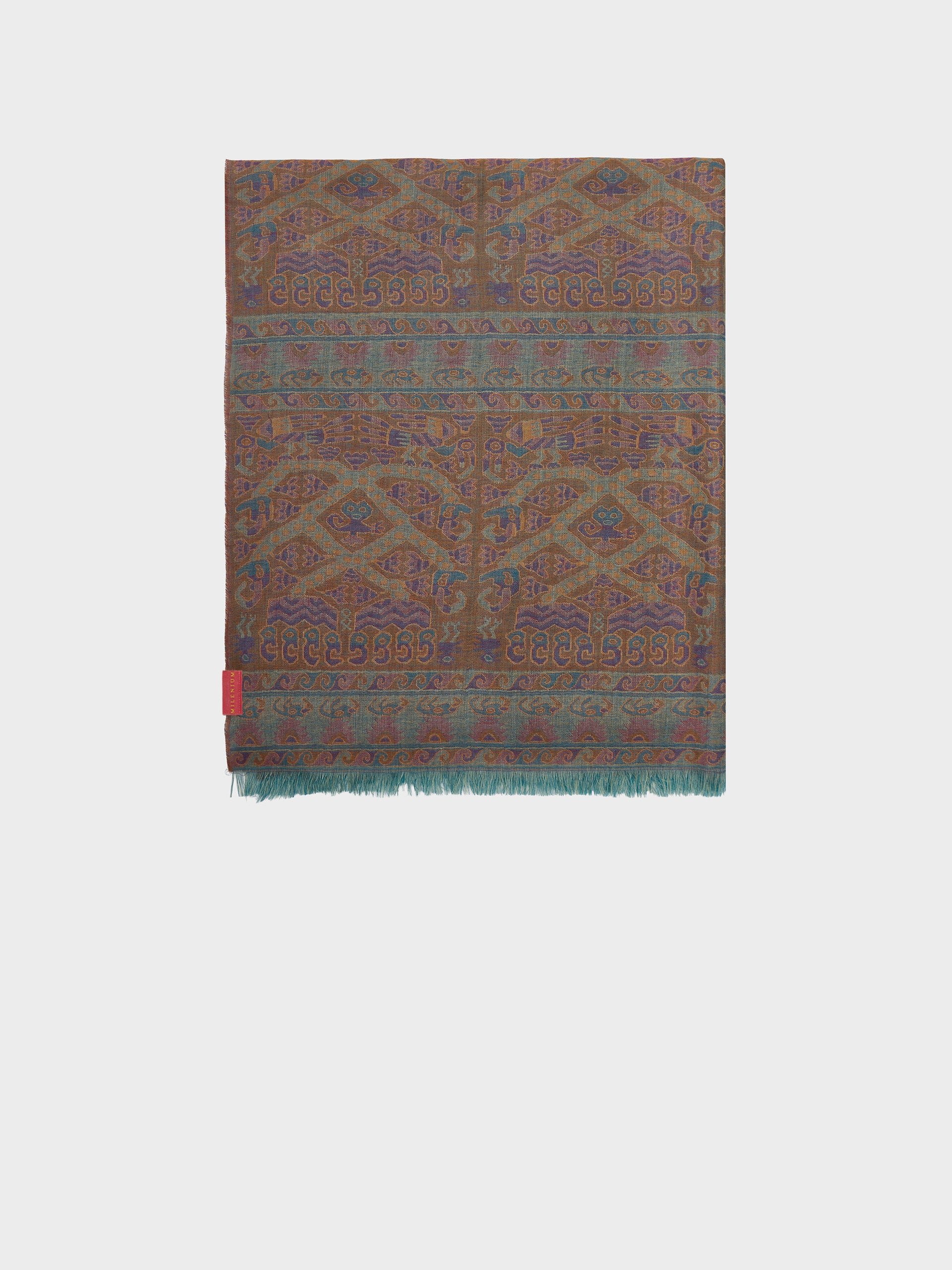 Estola Lambayeque 8 en tonalidad azul, elaborada en 50% Royal alpaca y 50% seda, con técnica Jacquard en doble tela e inserción de trama oculta. Con una medida de 200/196 x 93 cm, es una prenda reversible, inspirada en la Cultura Lambayeque, que mantiene viva la tradición ancestral en un diseño representativo de la identidad cultural. | Material predominante: Royal Alpaca y Seda