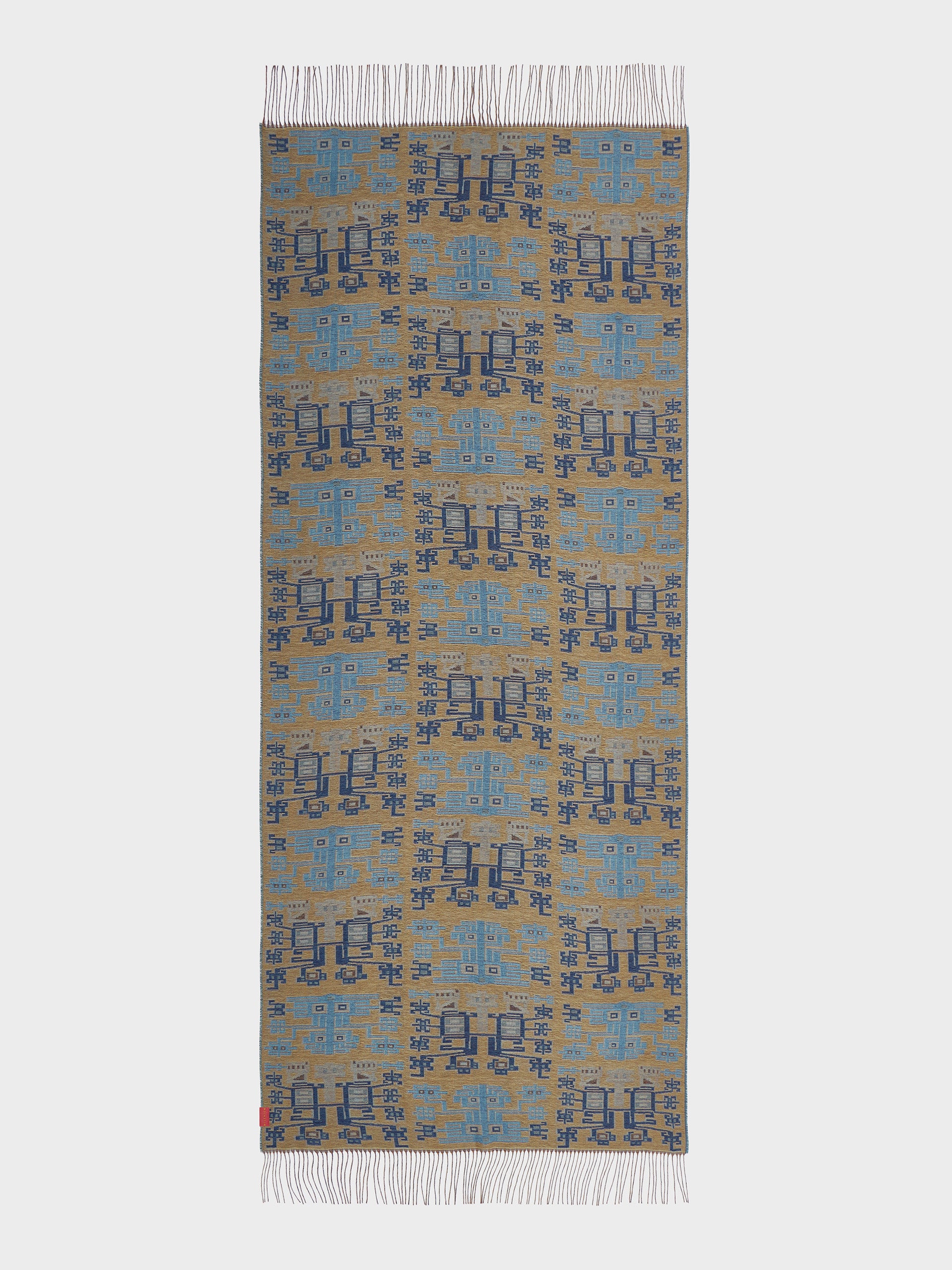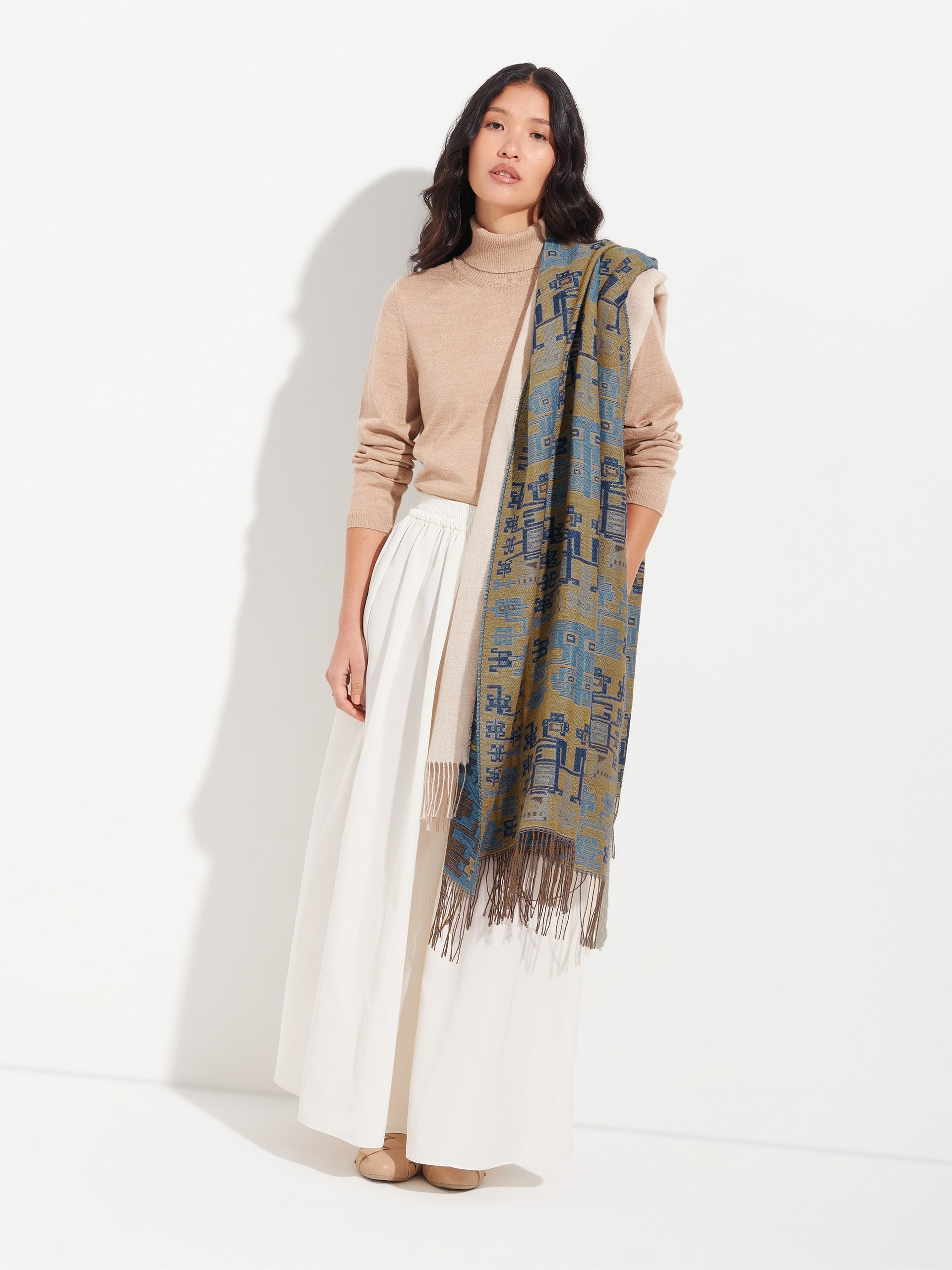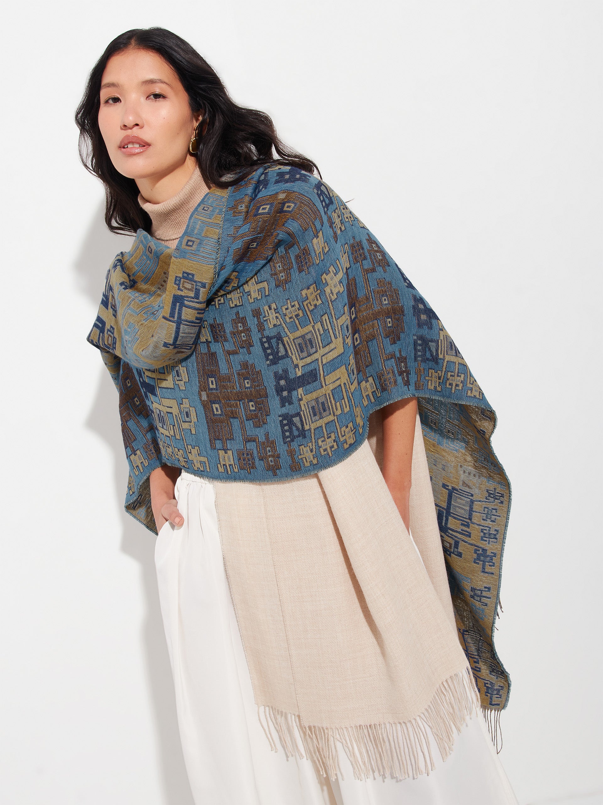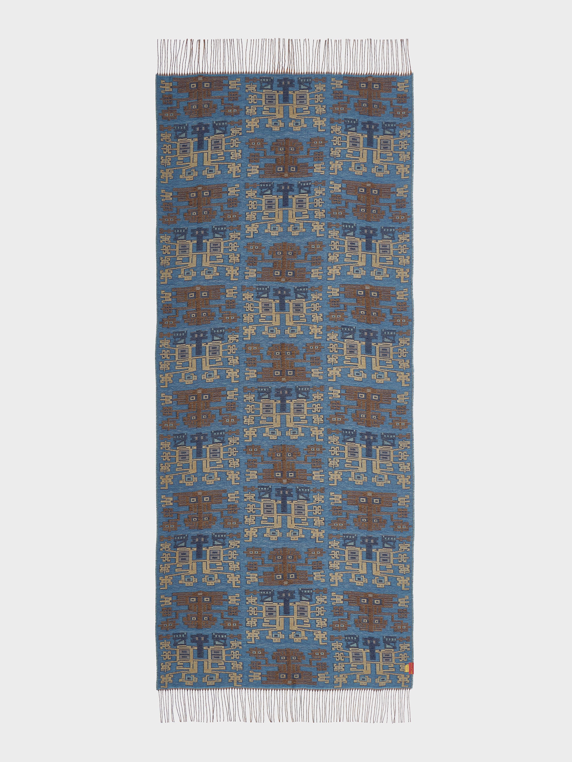 Estola Nazca 52 en tonalidad azul, elaborada en 70% baby alpaca y 30% seda, con técnica Jacquard en doble tela e inserción de trama oculta. Con una medida de 200/180 x 75 cm, es una prenda reversible, inspirada en la Cultura Nazca, que reinterpreta el legado ancestral en un diseño inspirado en la cultura originaria. | Material predominante: Baby Alpaca