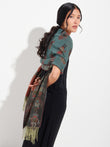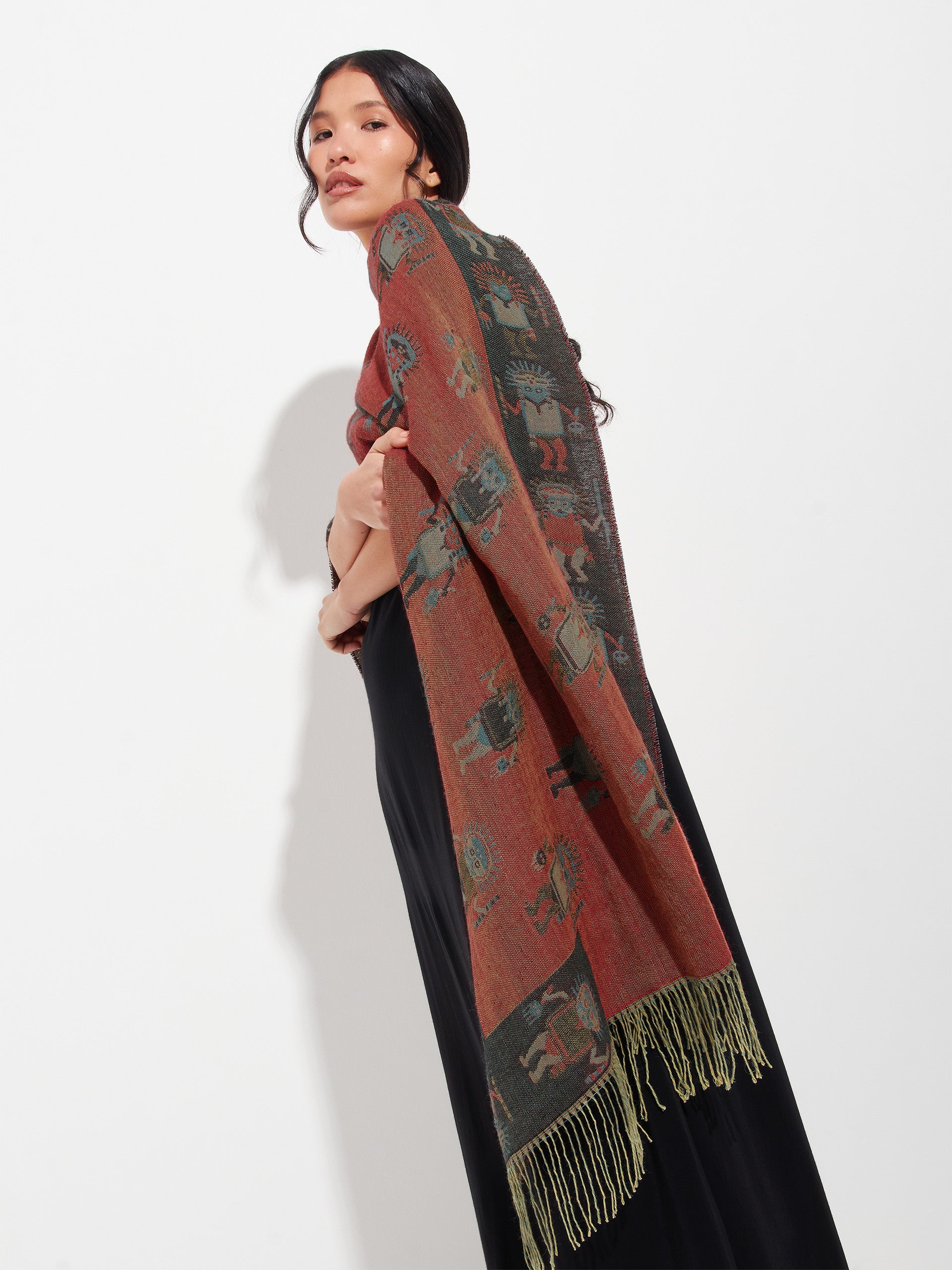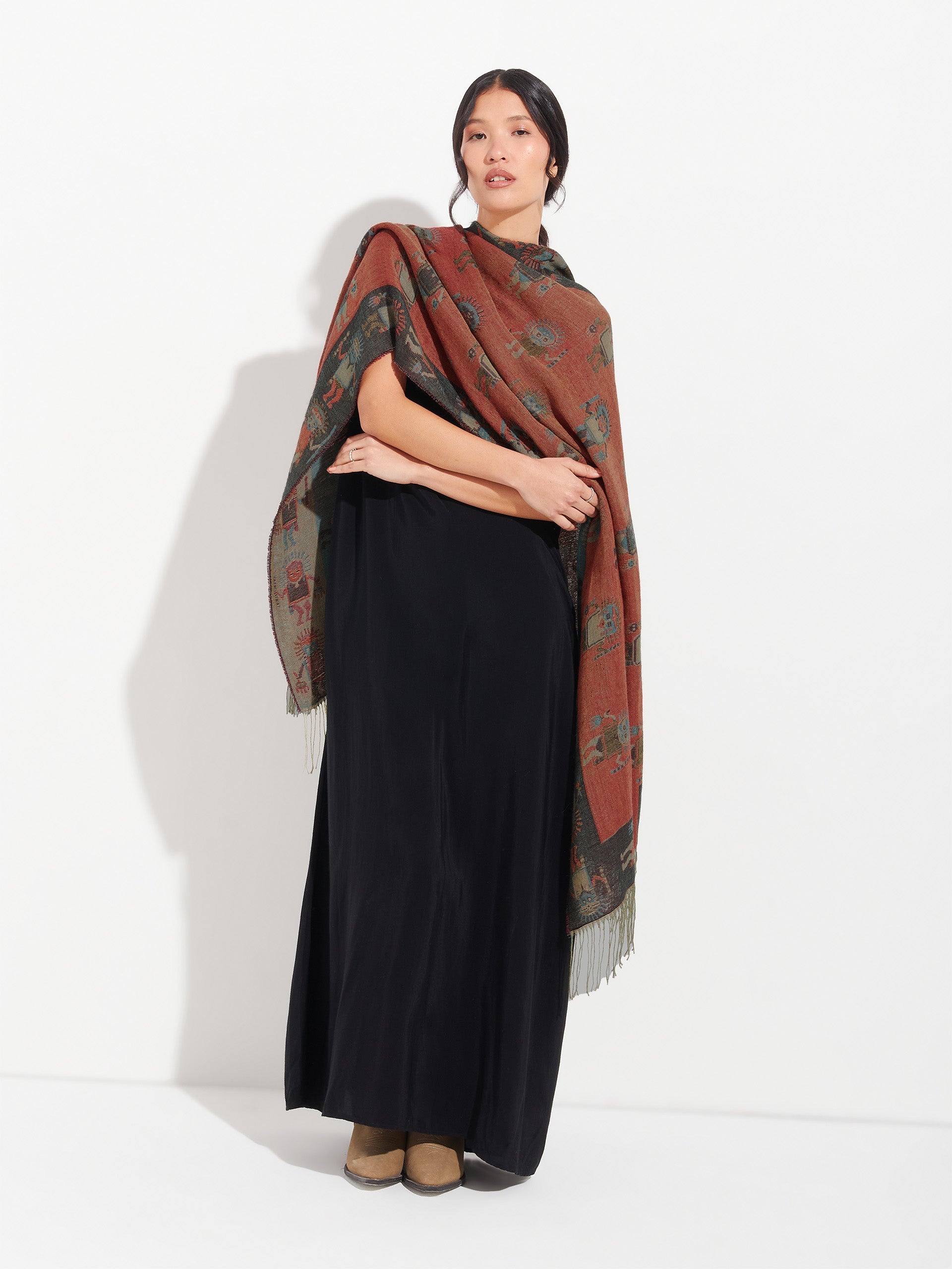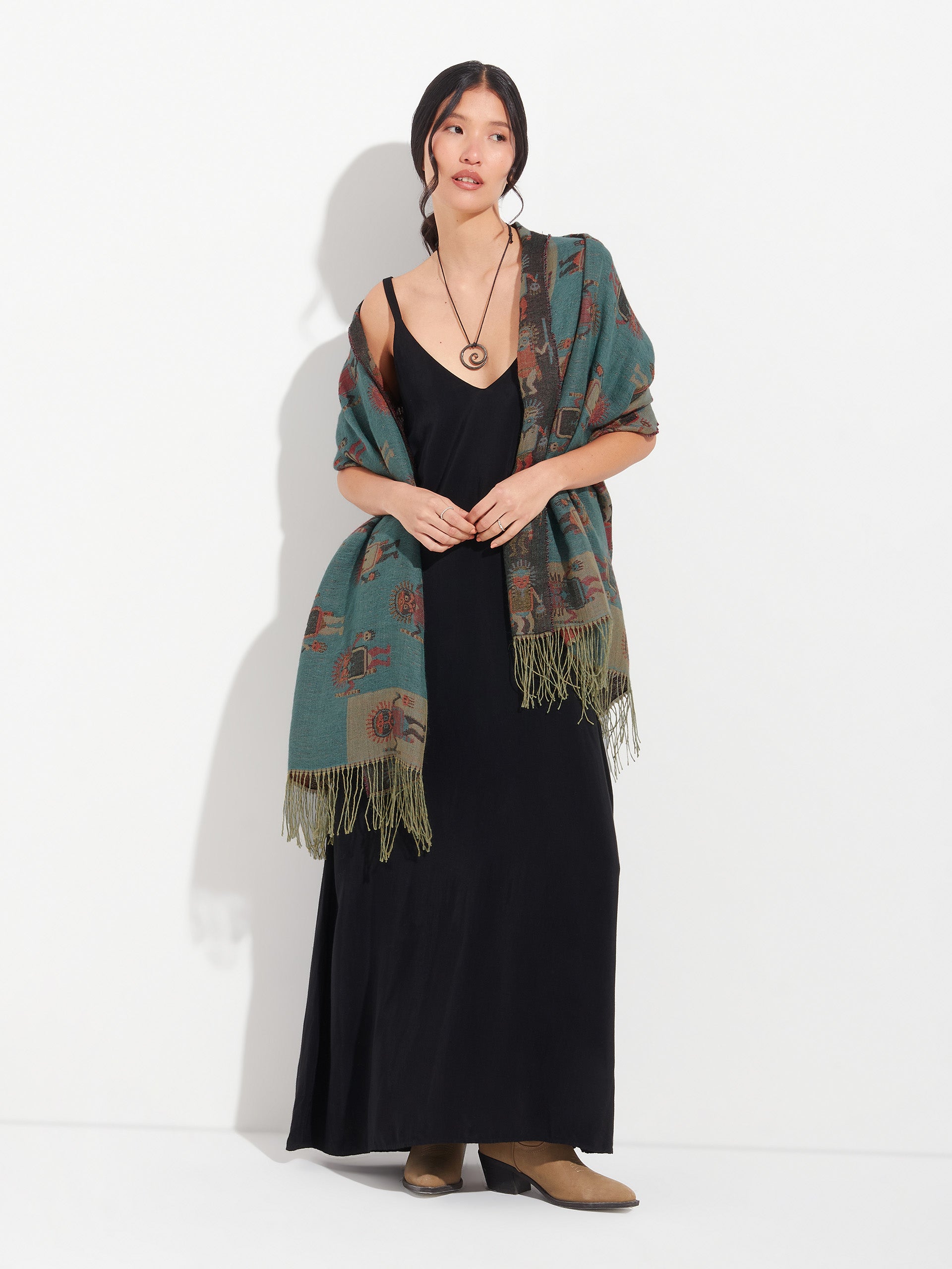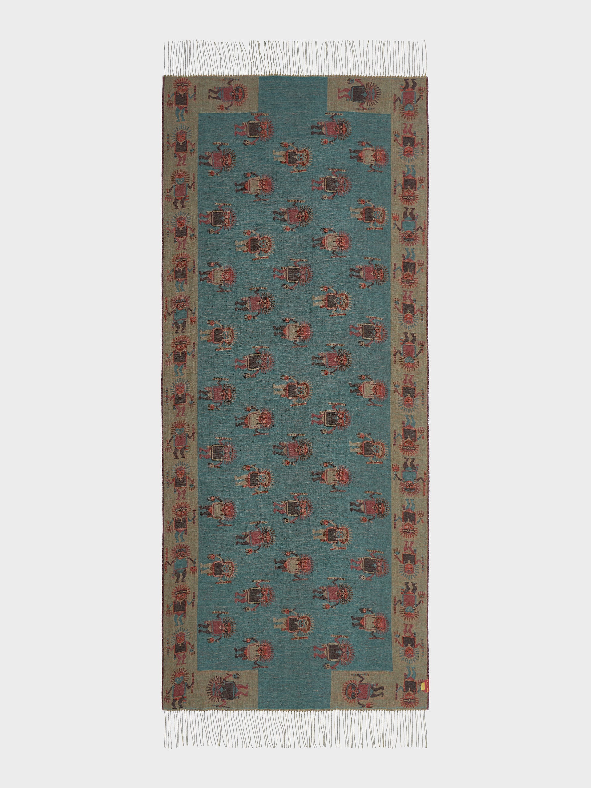 Estola Nazca 53 en tonalidad azul, confeccionada en 70% baby alpaca y 30% seda, trabajada en Jacquard de doble tela con inserción de trama oculta. Sus dimensiones son 200/180 x 75 cm y se trata de una pieza reversible, inspirada en la Cultura Nazca, que revive el legado ancestral a través de un diseño basado en la cultura originaria. | Material predominante: Baby Alpaca