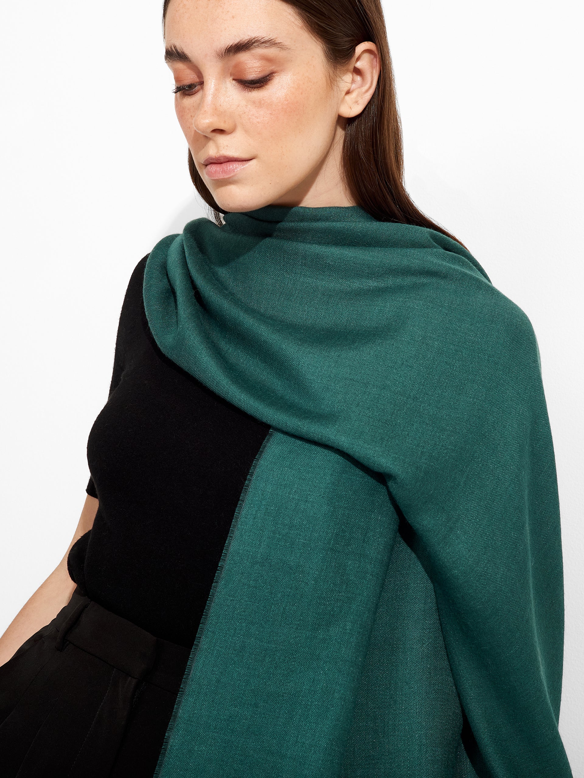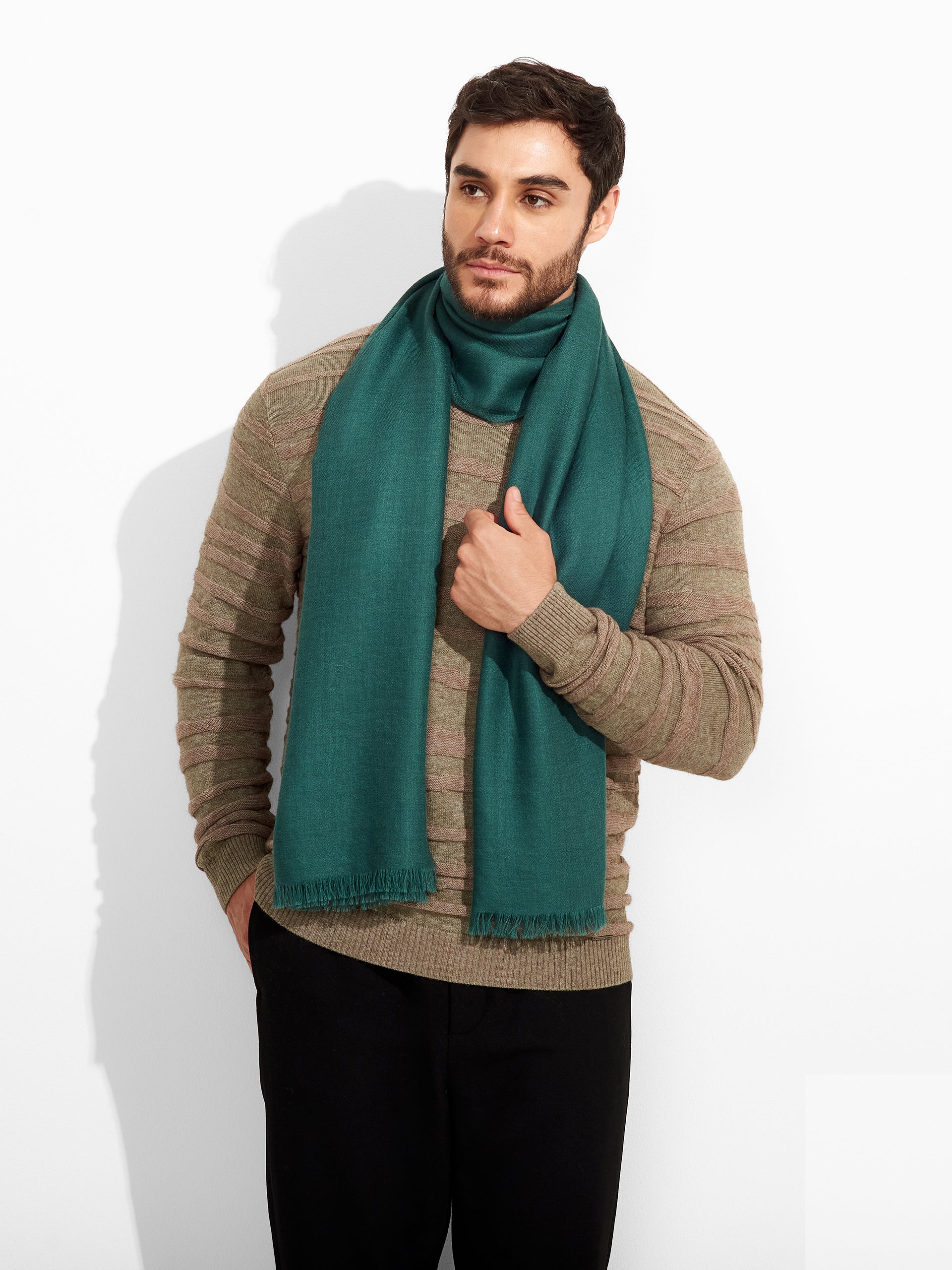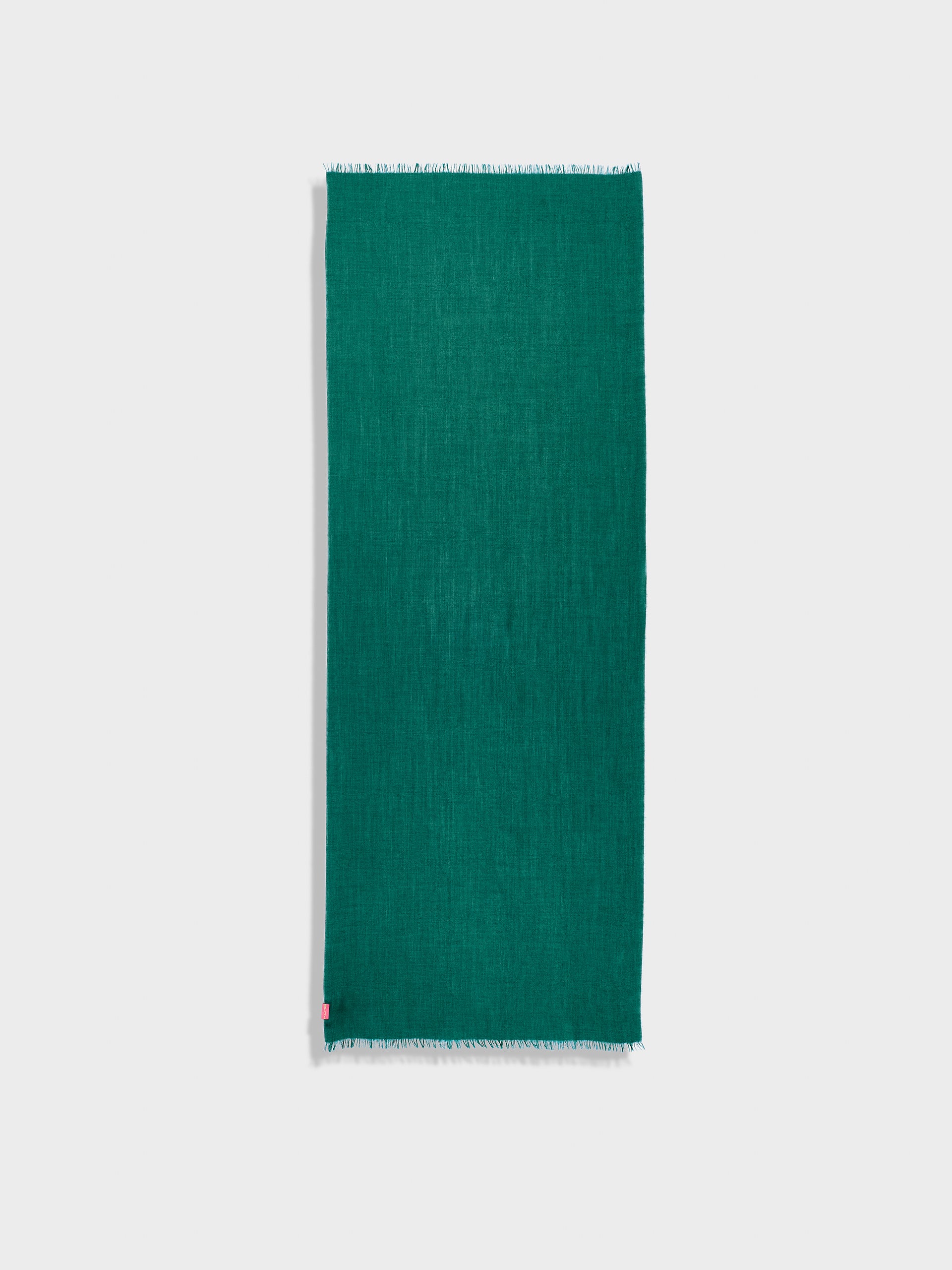 Estola Teaberry en tonalidad verde, de color entero, presenta bordes con flecos finos que aportan un acabado delicado. Confeccionada en baby alpaca y seda. | Material predominante: Baby Alpaca