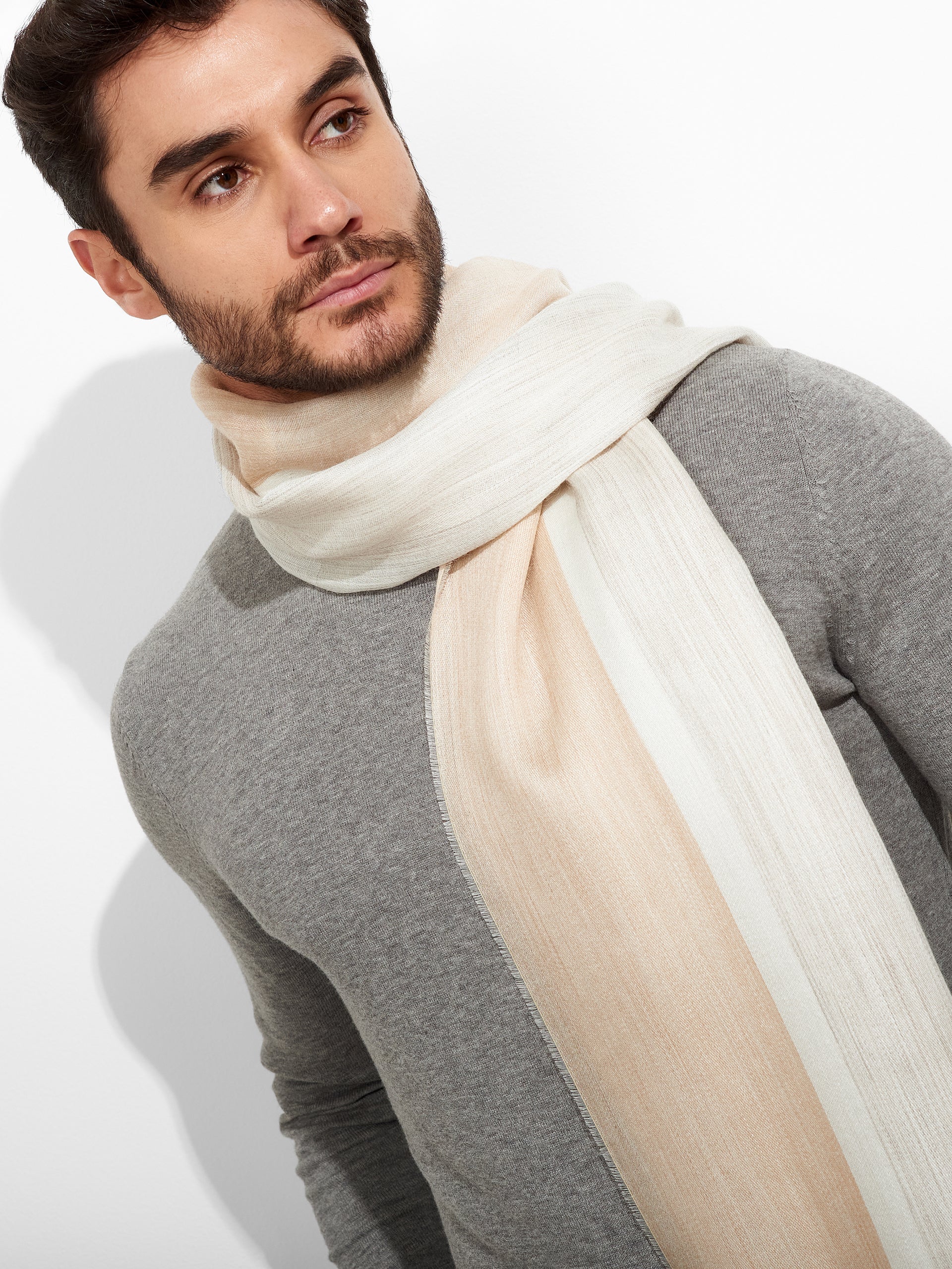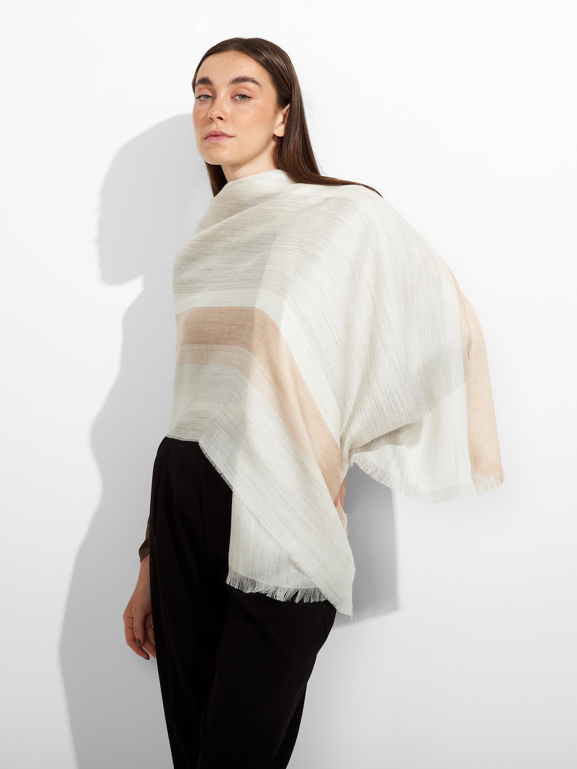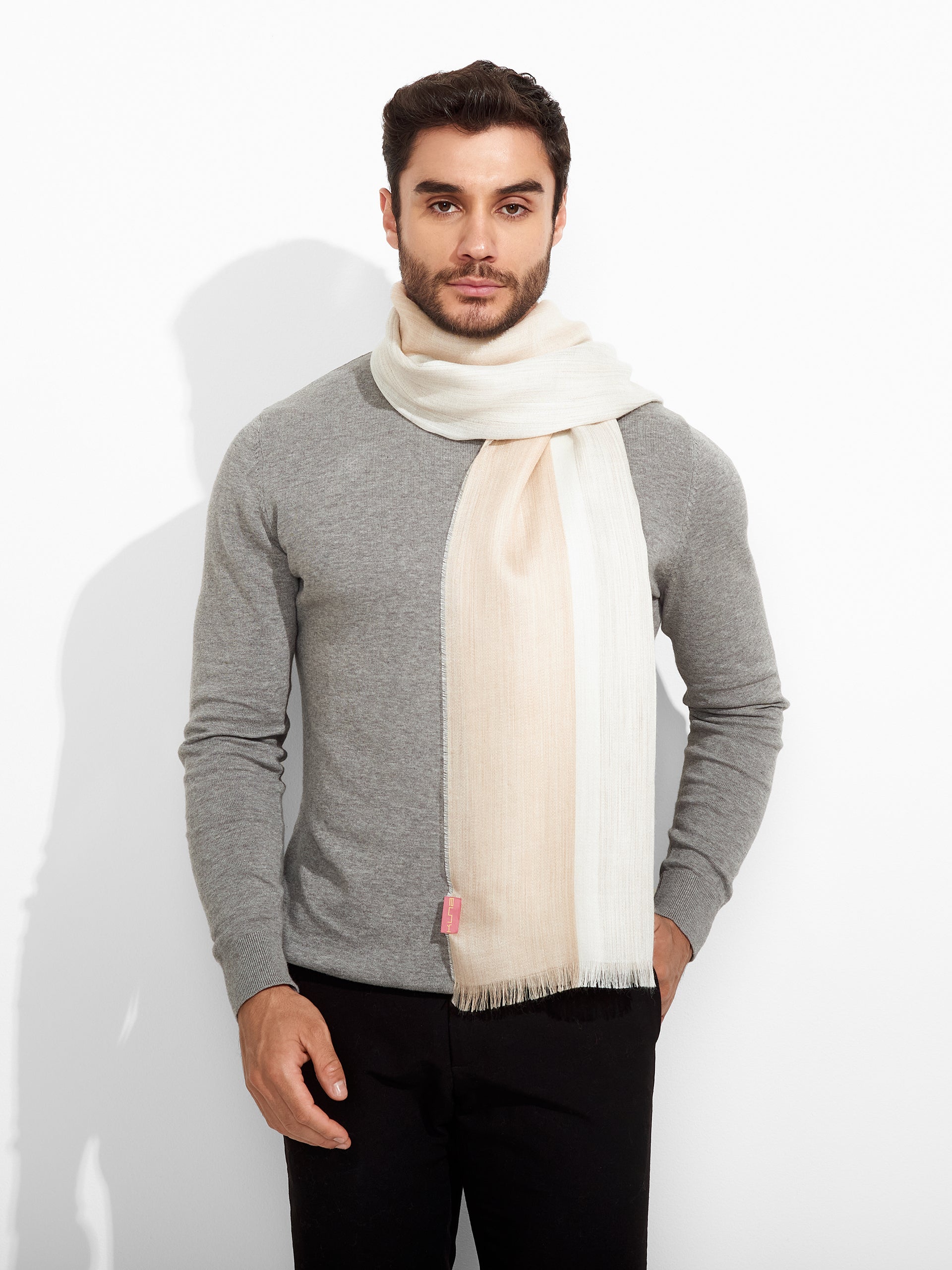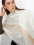 Estola Wicht en tonalidad gris, con diseño de bloques de color verticales, presenta bordes con flecos. Confeccionada en una mezcla de baby alpaca y seda eco, brinda suavidad y calidez. | Material predominante: Baby Alpaca