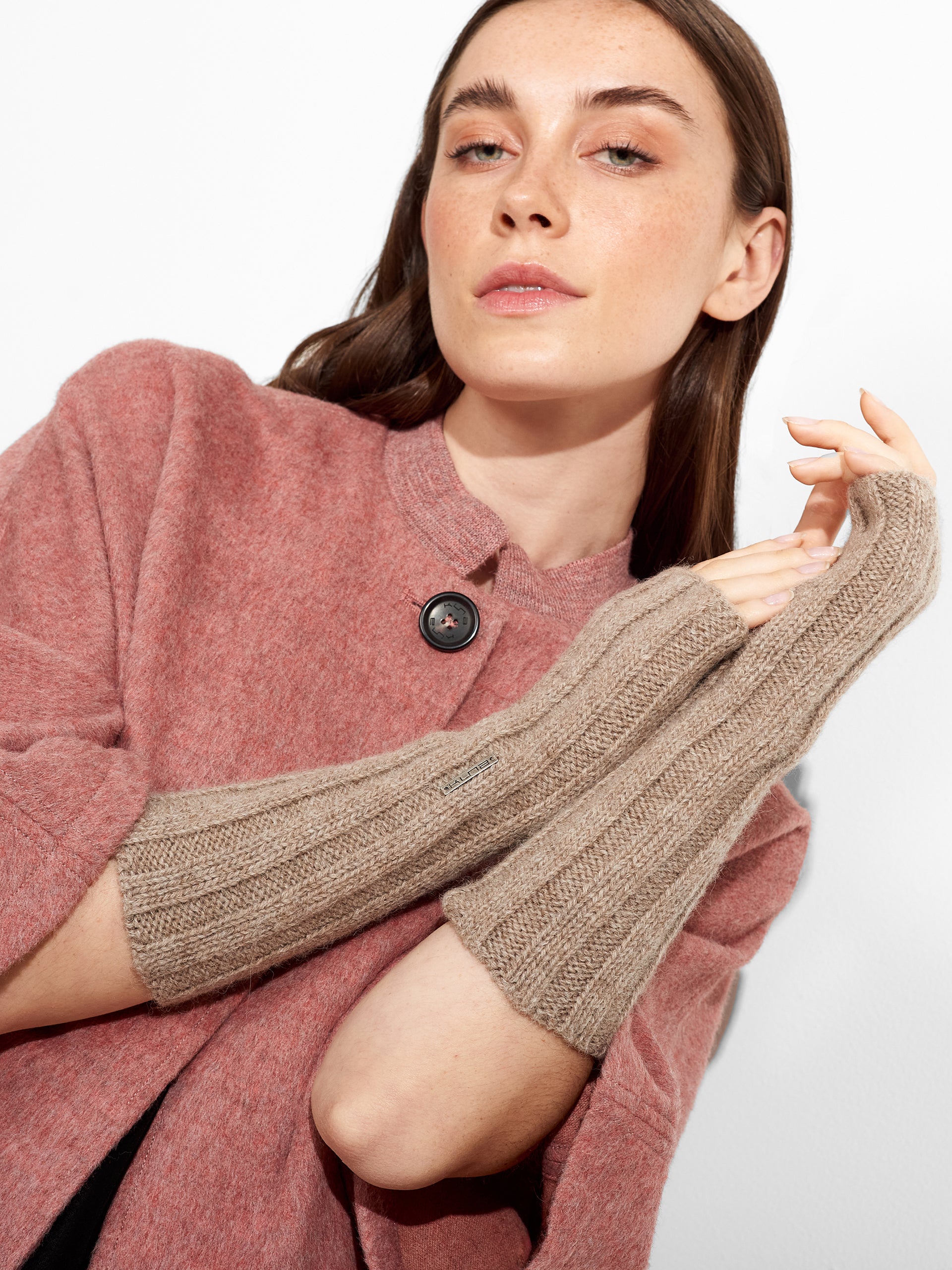 Guantes Zephir en tonalidad marron, confeccionados en tejido de punto con líneas verticales prominentes que aportan textura y estilo. Confeccionado en baby alpaca, brinda suavidad y calidez. | Material predominante: Baby Alpaca