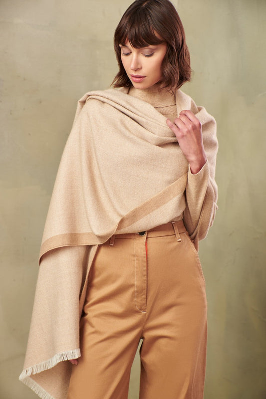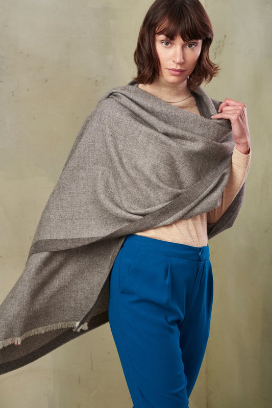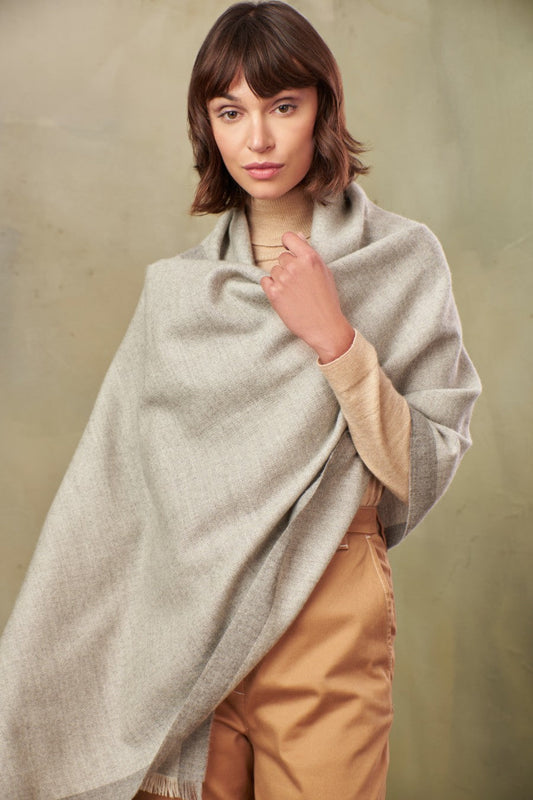 Sobria pashmina de baby alpaca en tonos neutros. Confeccionada de baby alpaca, equilibra cualquier atuendo....