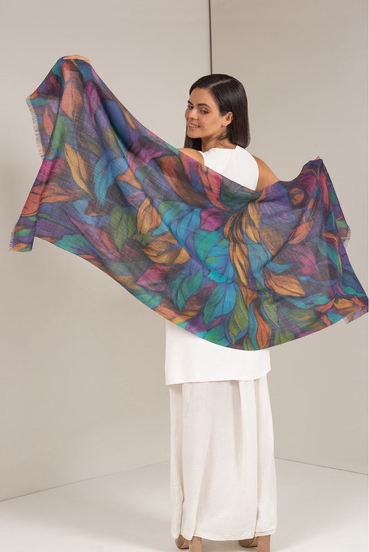 Un delicado diseño en alegres tonalidades enriquece el estilo de esta pashmina de baby alpaca...