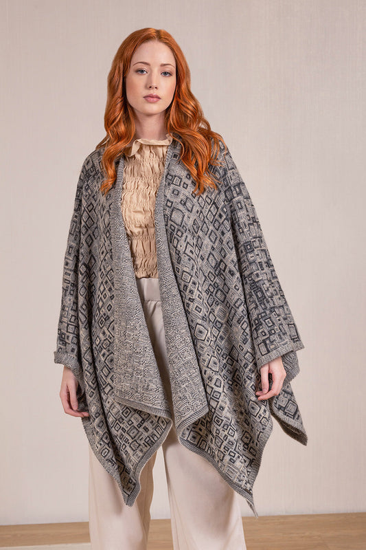 Sofisticación es lo que transmite esta llamativa capa, tejido Jacquard de baby alpaca en tonos...