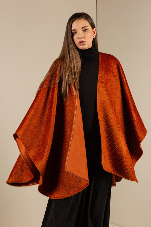 Capa Zareli en tonalidad naranja, confeccionada en baby alpaca y seda. Es una capa doble...
