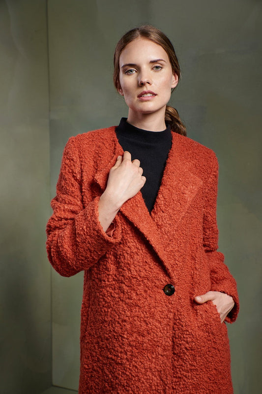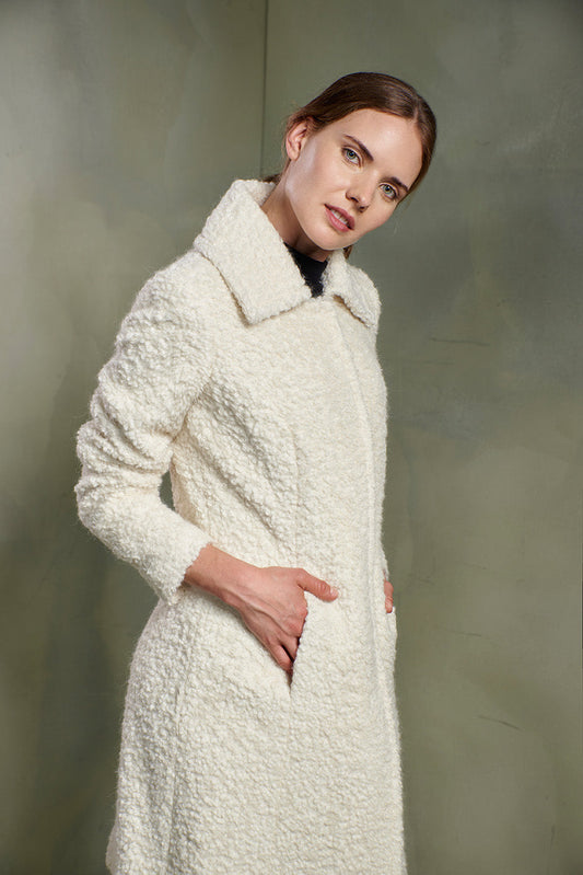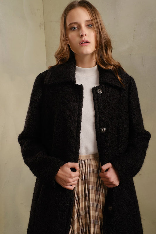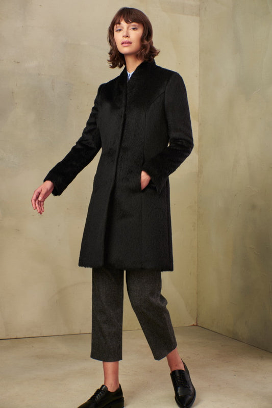 Confeccionado con tela Astrakán de alpaca suri y lana, nuestro abrigo Tranvía es sinónimo de...