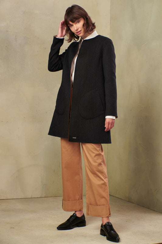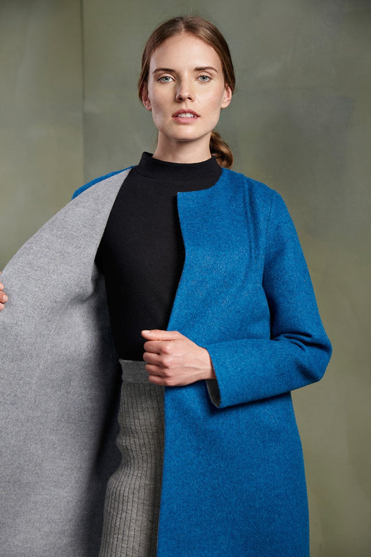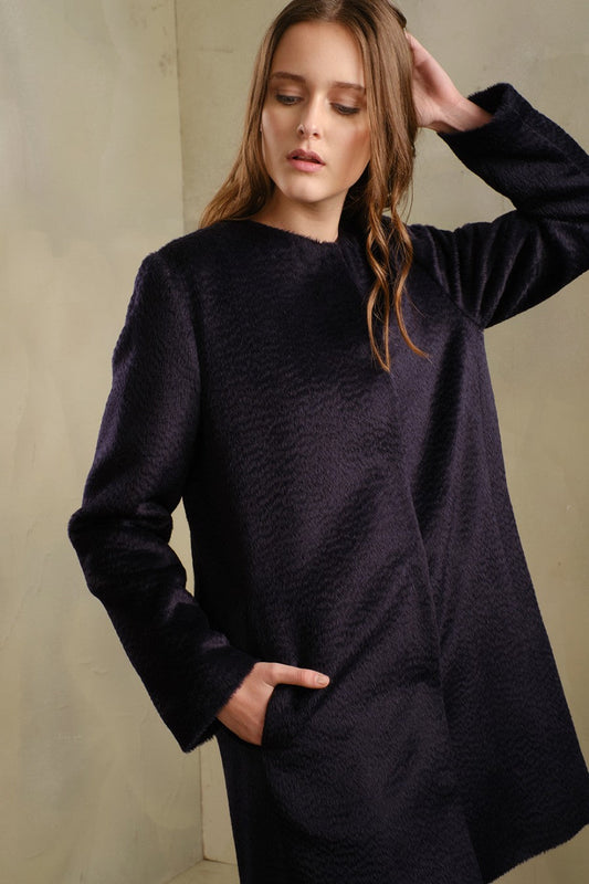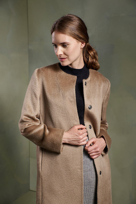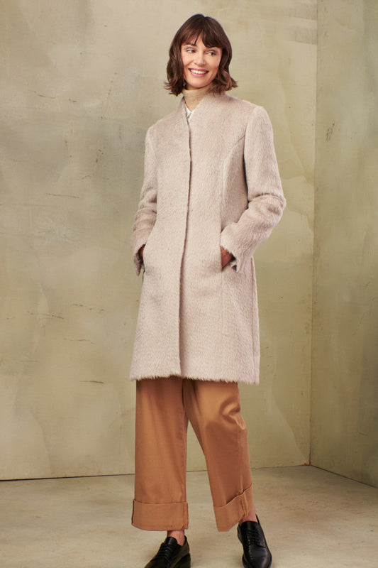 Nuestro abrigo Umblau, elaborado con tela de alpaca suri y cuello en tejido de punto,...