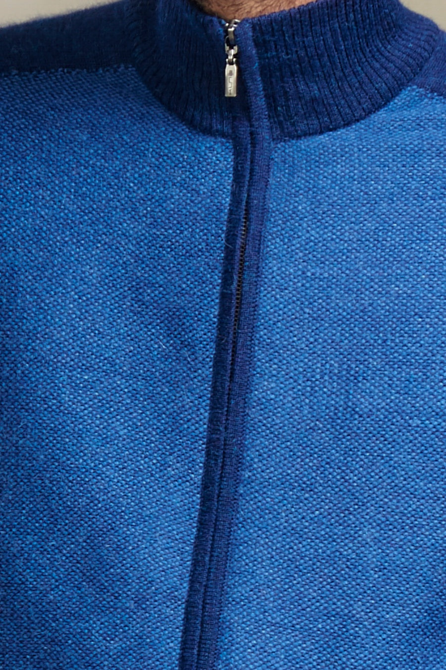 Un clásico cárdigan de punto, ahora presentado con un delantero en color contraste y punto tejido con textura. Tiene cuello alto, cierre metálico y manga ranglan. | Material predominante: Baby Alpaca