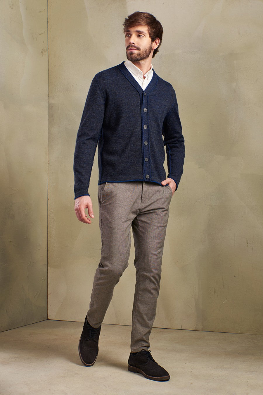 Elegante cárdigan en sobrios tonos, confeccionado con fina fibra de baby alpaca. Cuello en V y botones centrales. | Material predominante: Baby Alpaca