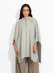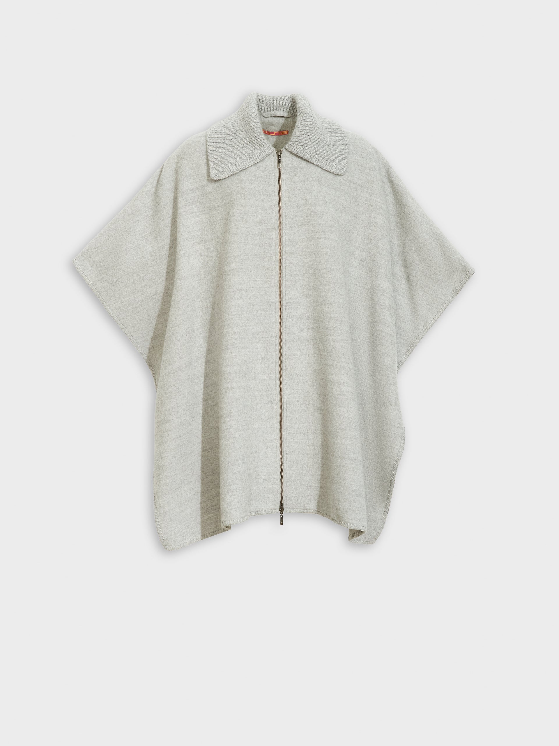 Capa Zendaya en tonalidad marrón, con cierre metálico al frente y cuello aplicado. Presenta un tejido en medio inglés y bordes con acabado orlado. Confeccionada en baby alpaca, lana y nylon. | Material predominante: Baby Alpaca