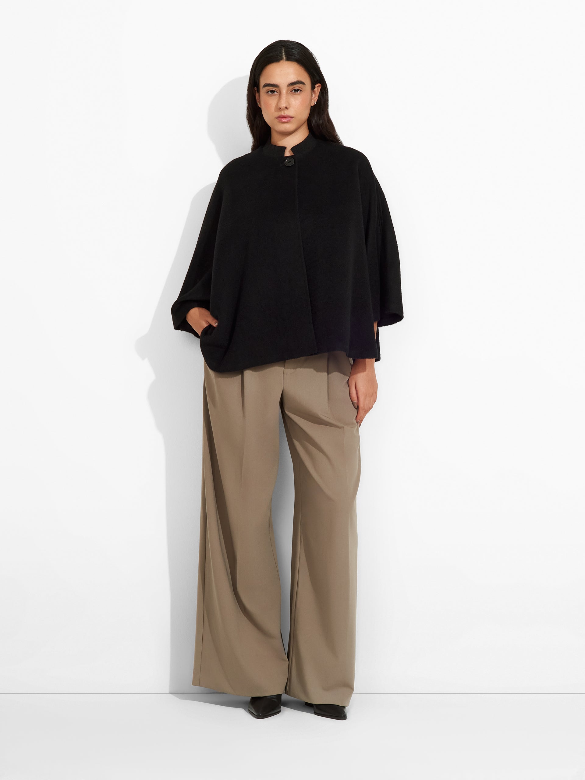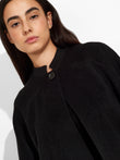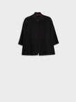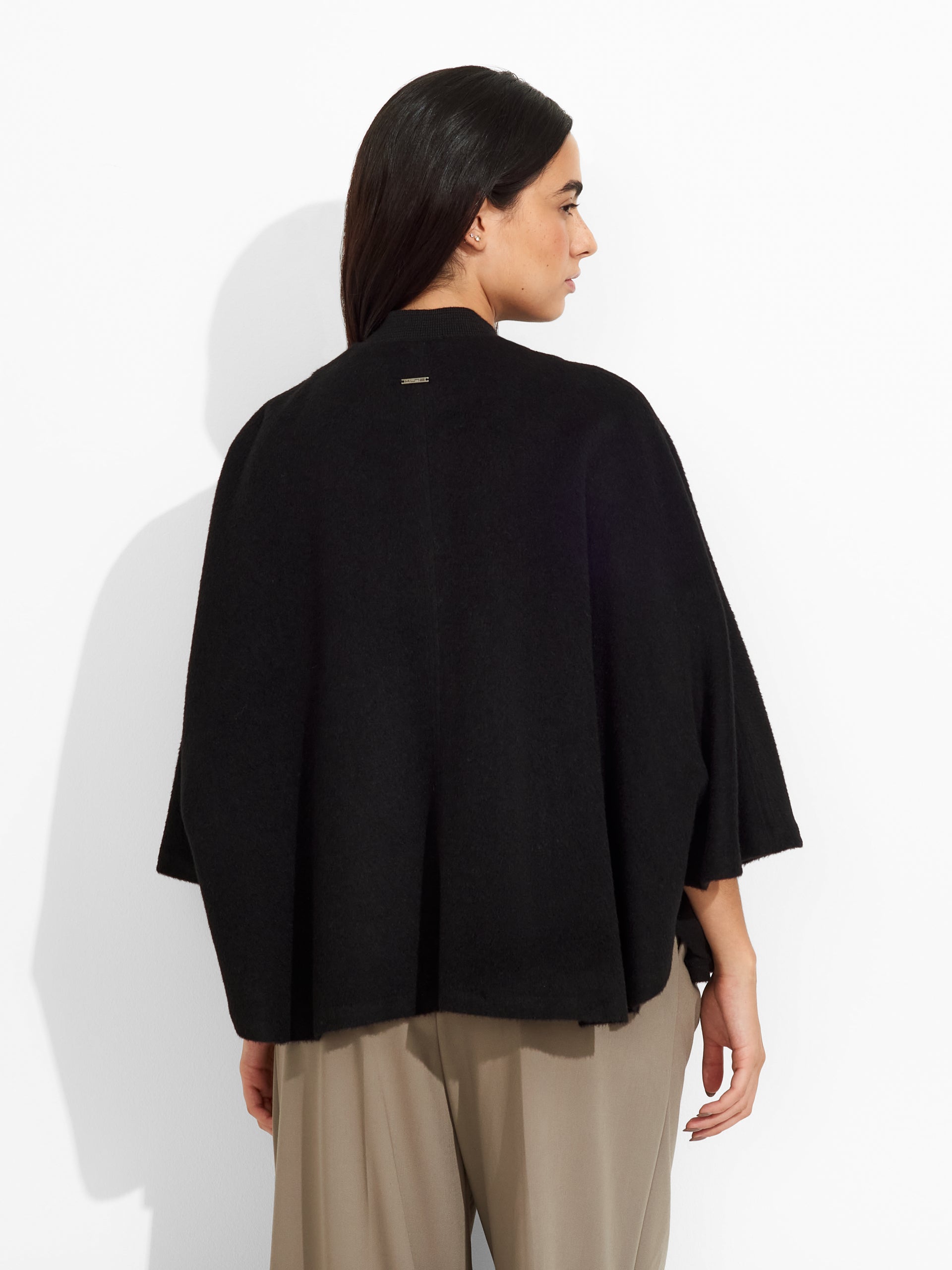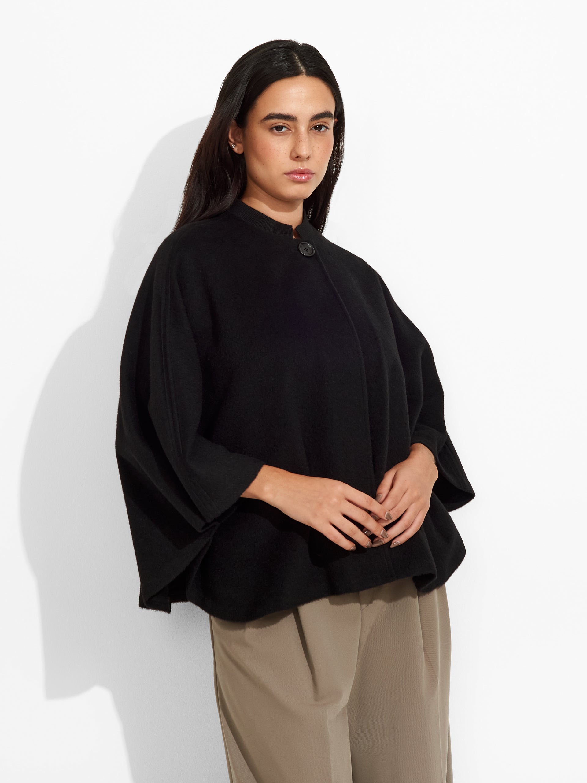 Capa Zenzolin en tonalidad negro, diseñada en color entero con cuello neru y un solo botón de cacho en la parte superior como cierre, tejido en punto milano. Confeccionada en una mezcla de baby alpaca y lana. | Material predominante: Baby Alpaca