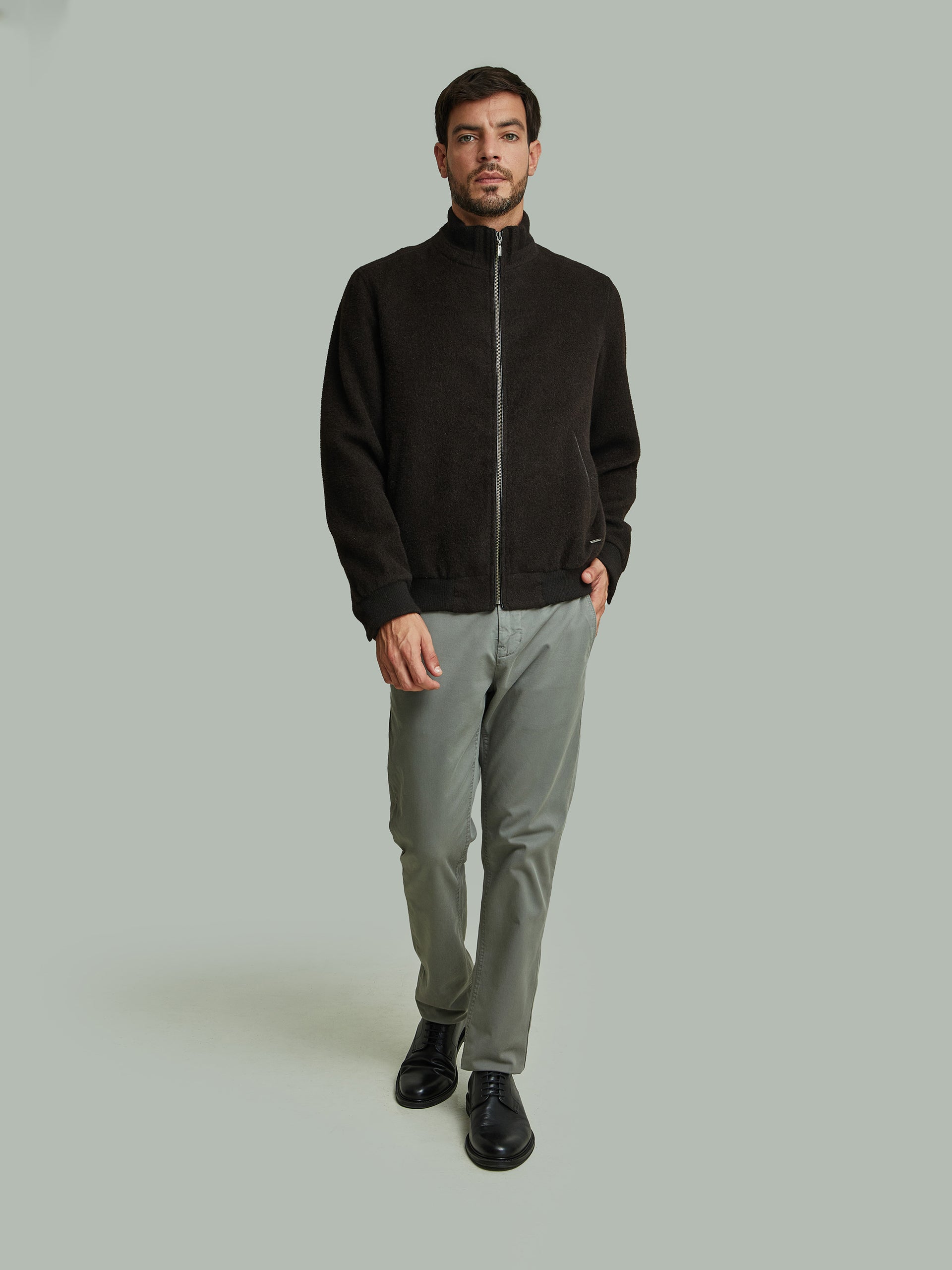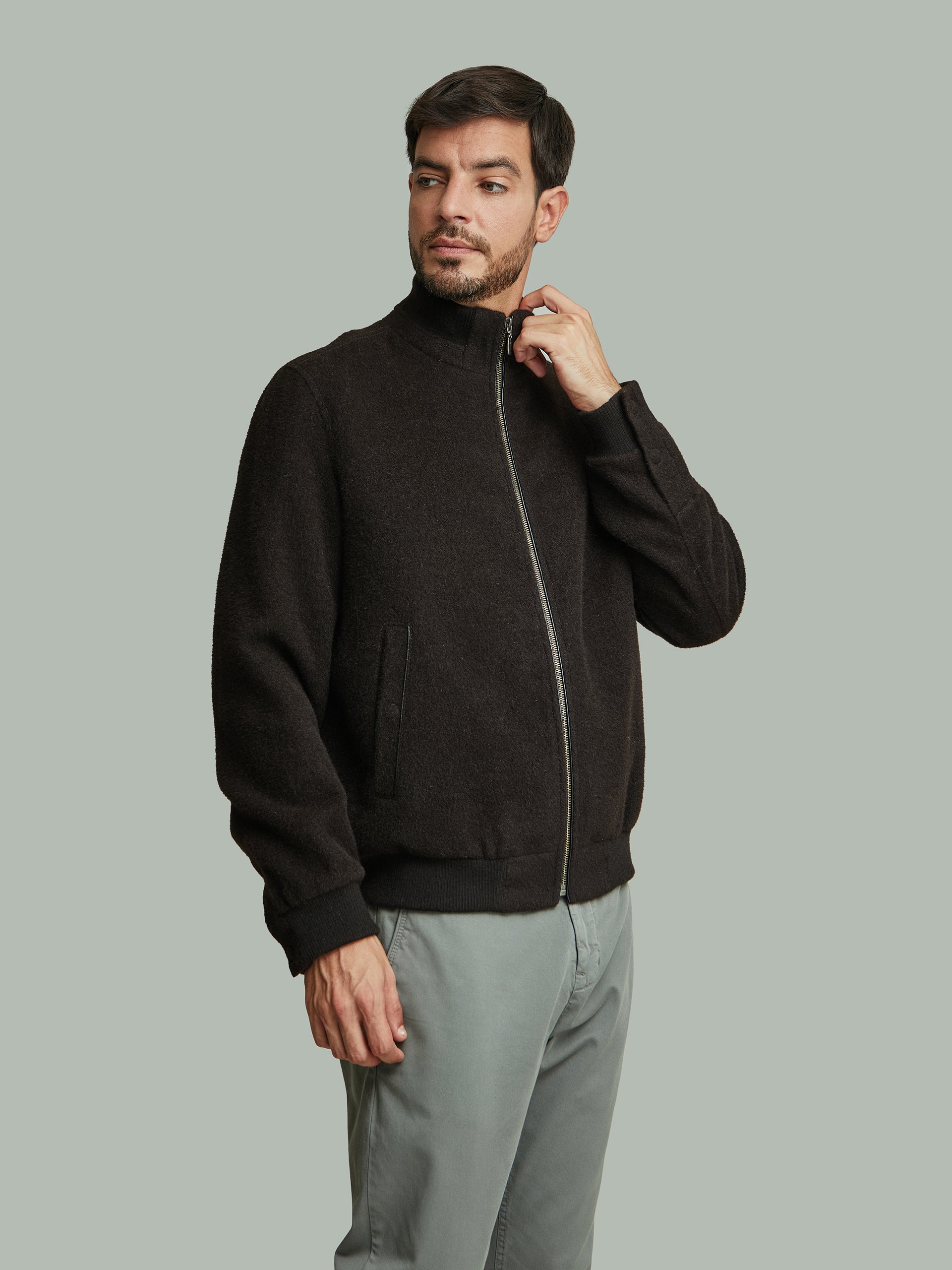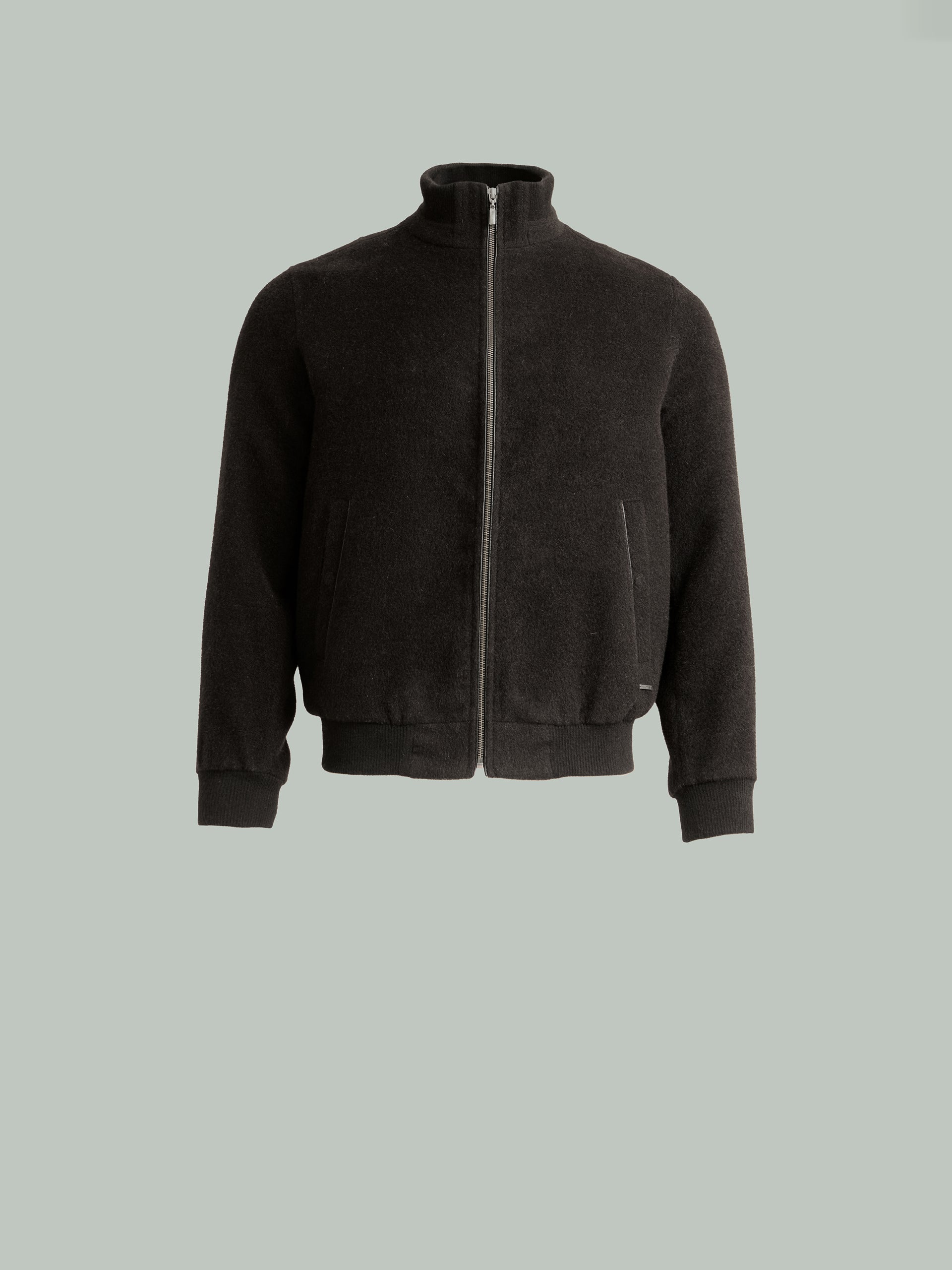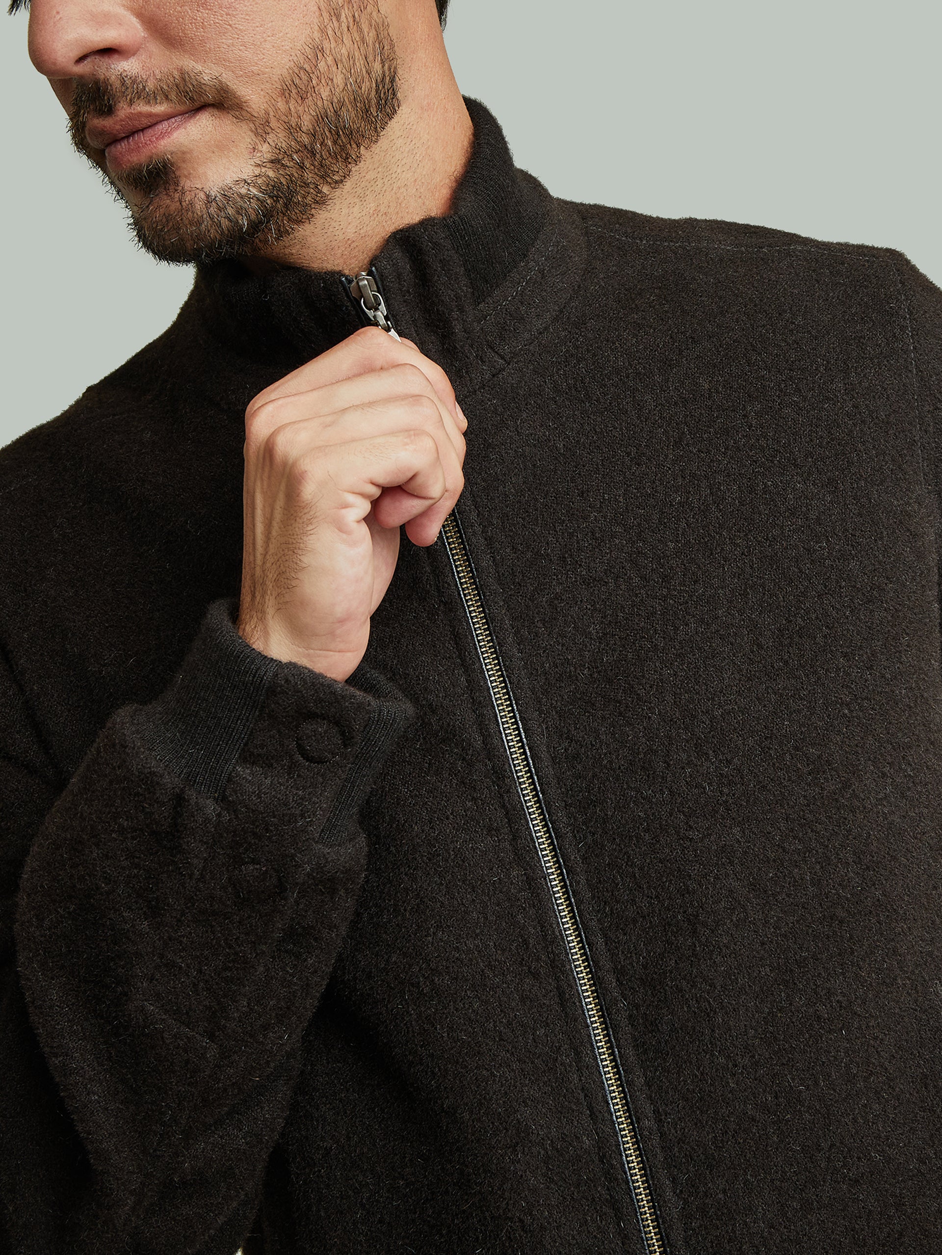 Icónica chaqueta bomber confeccionada con tela de alpaca negra 100% natural. Una prenda sin procesos de teñido y con acabados de lujo. Refinado y ultra cómodo | Material predominante: Black Alpaca