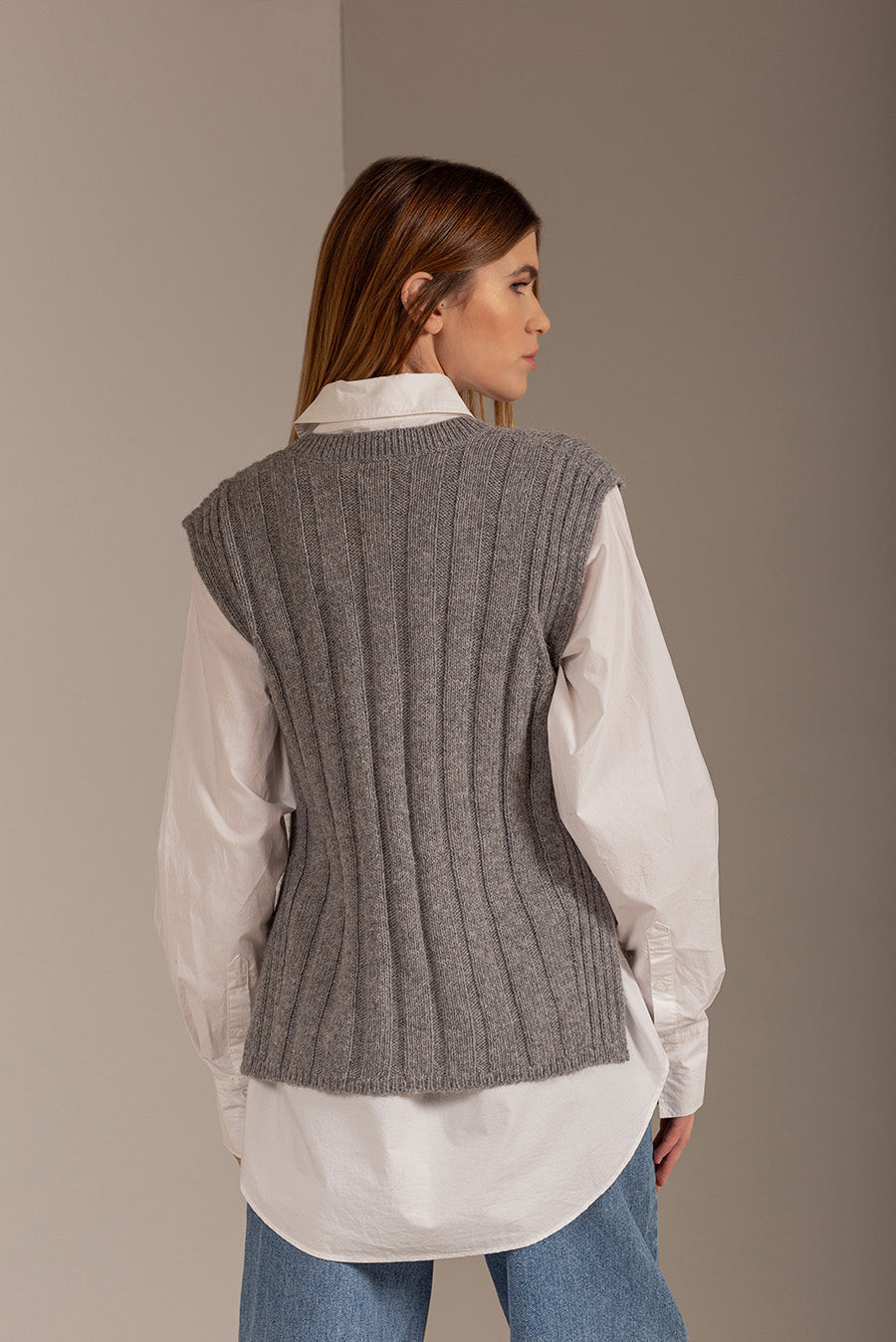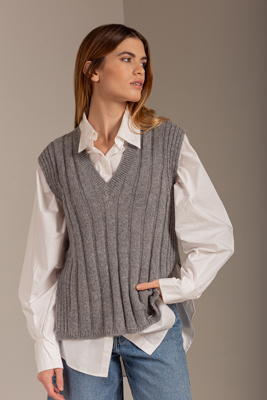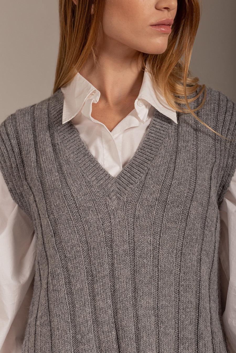 De corte sencillo y altamente versátil. Elaborado en 100% baby alpaca, este chaleco tiene el estilo de moda que estás buscando, combinado con la calidez y suavidad de la fibra. Tiene cuello V y aberturas inferiores en los costados | Material predominante: Baby Alpaca