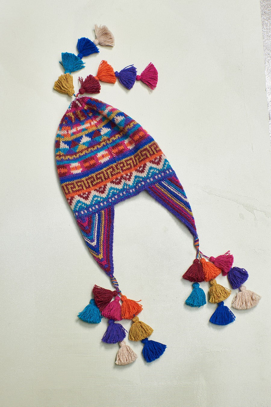 Chullo tejido en finas fibras de baby alpaca. Complemento de diseños simétricos y pompones que alegrarán cualquier atuendo. | Material predominante: Baby Alpaca