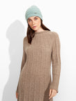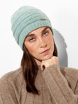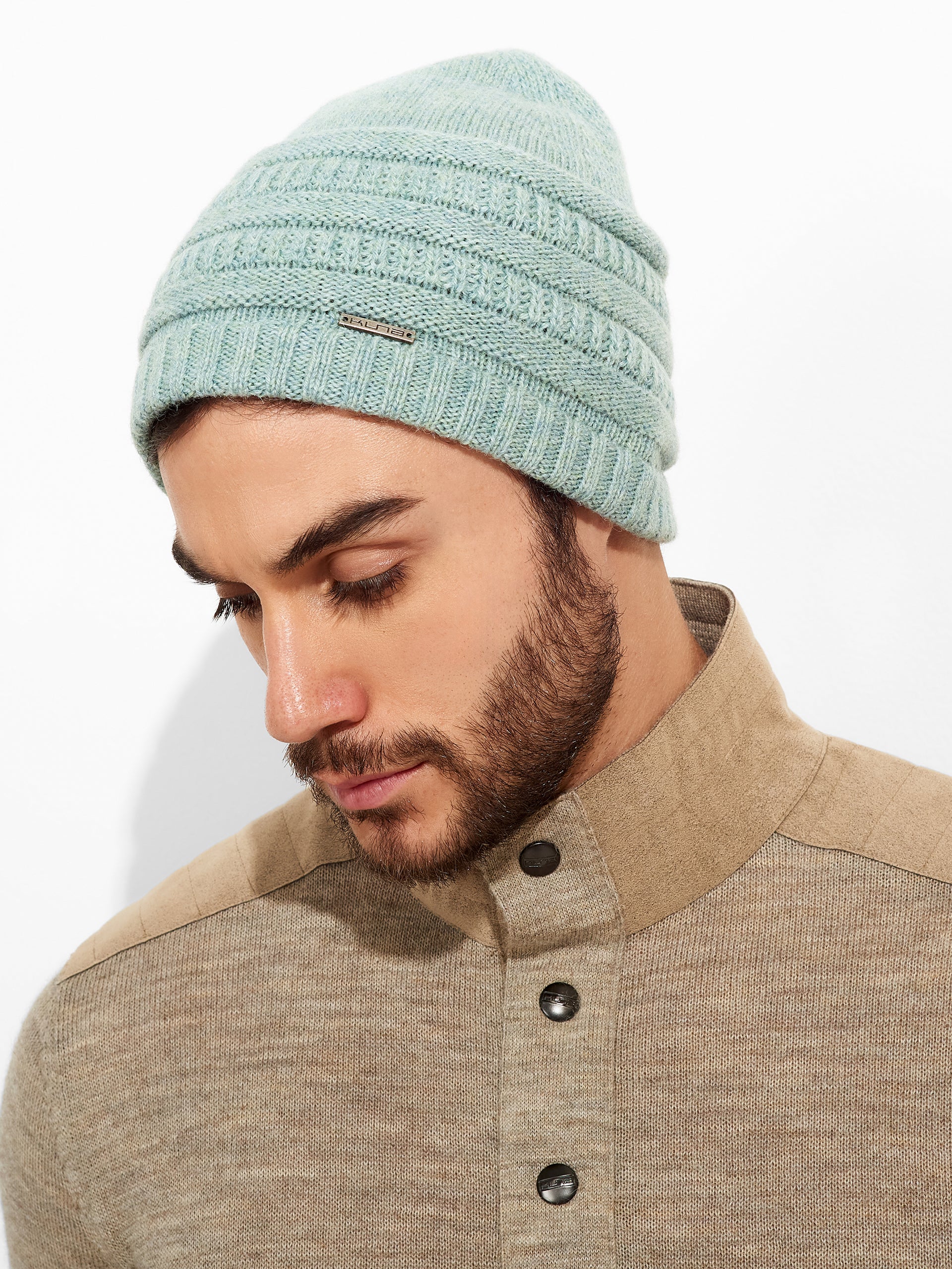 Gorro Zada en tonalidad celeste, presenta un diseño con secciones horizontales definidas, cada una trabajada en tejido de punto acanalado. Su forma se adapta cómodamente a la cabeza. Confeccionado en baby alpaca, brinda suavidad y calidez. | Material predominante: Baby Alpaca
