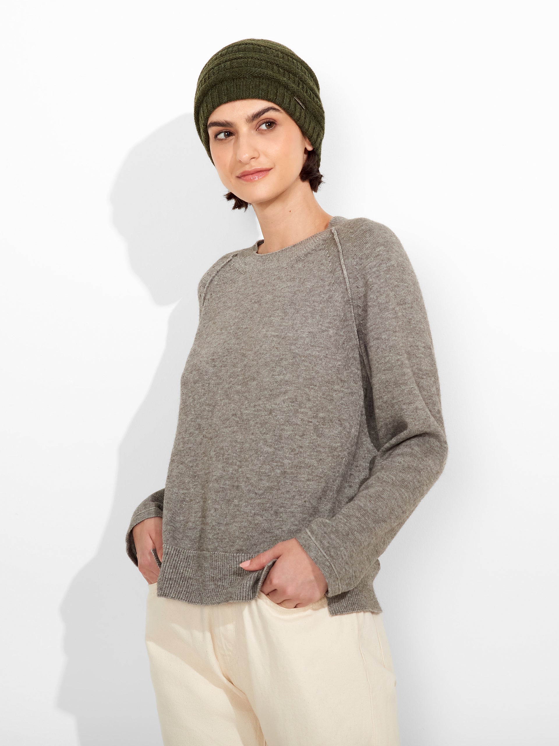 Gorro Zada en tonalidad gris, presenta un diseño con secciones horizontales definidas, cada una trabajada en tejido de punto acanalado. Su forma se adapta cómodamente a la cabeza. Confeccionado en baby alpaca, brinda suavidad y calidez. | Material predominante: Baby Alpaca