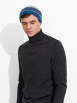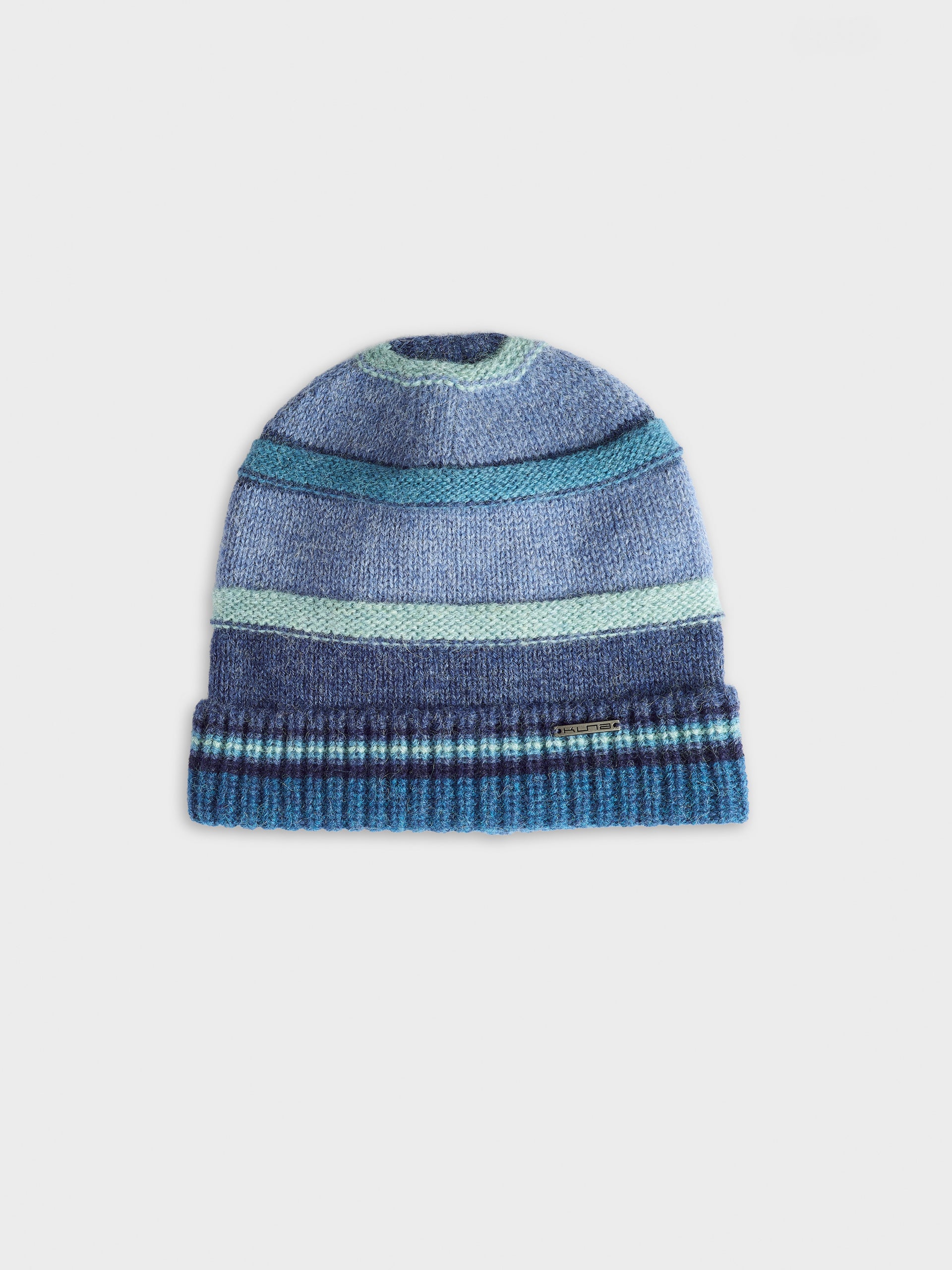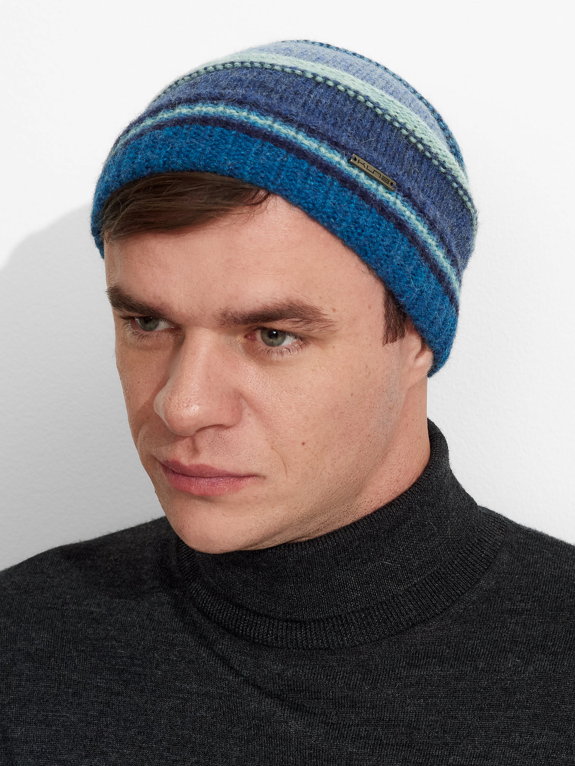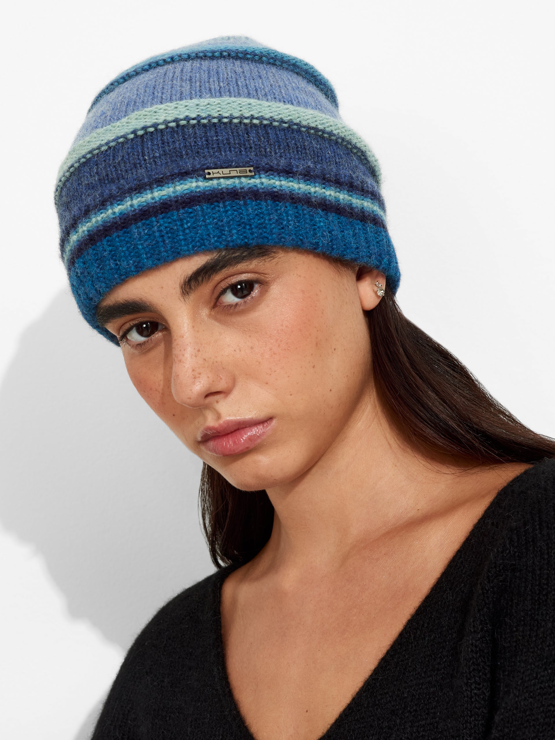 Gorro Zanni en tonalidad azul, con diseño de rayas horizontales que aportan un estilo distintivo. Presentan un ajuste ceñido. Confeccionados en baby alpaca, ofrecen suavidad, calidez y confort. | Material predominante: Baby Alpaca