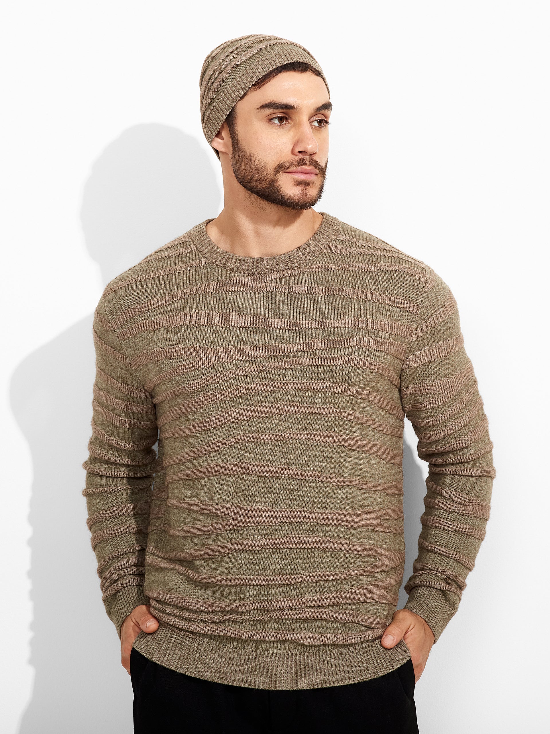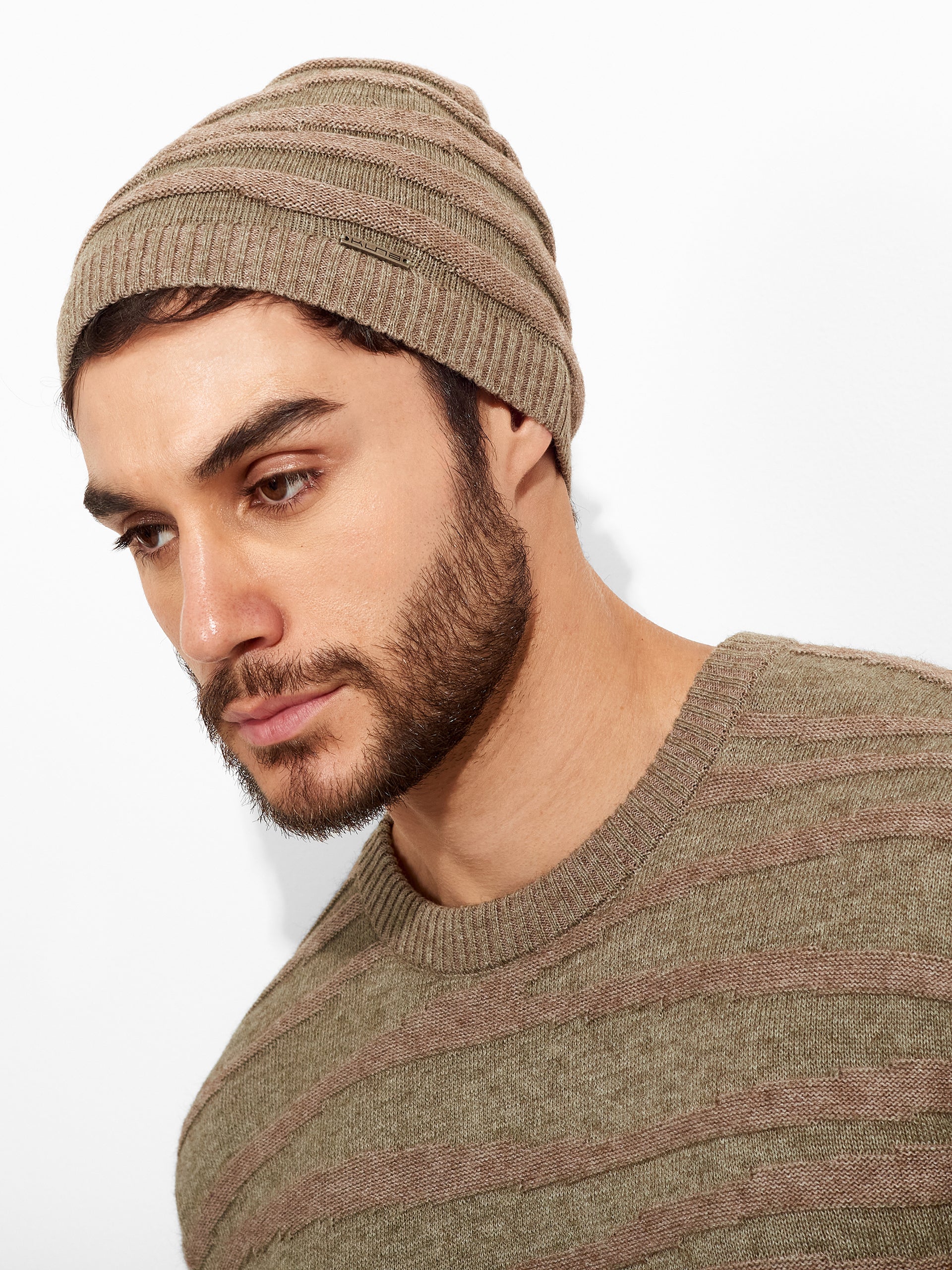 Gorro Zion en tonalidad beige, confeccionado en tejido de punto con secciones horizontales de textura variable y un sutil patrón ondulado. El borde inferior presenta un tejido acanalado en dirección vertical que asegura un ajuste ceñido. Hecho en una mezcla de algodón y baby alpaca, brinda suavidad y confort. | Material predominante: Algodon
