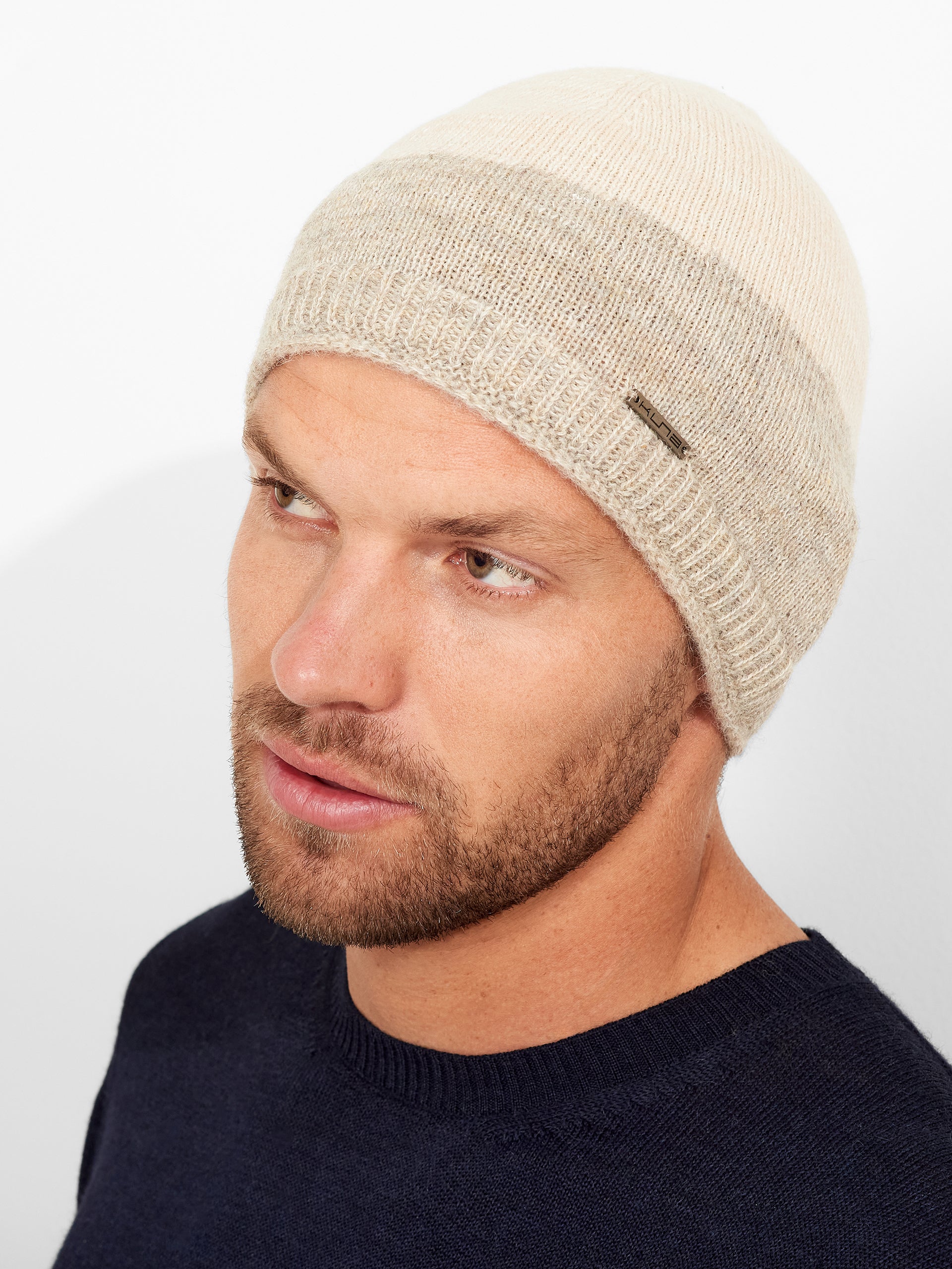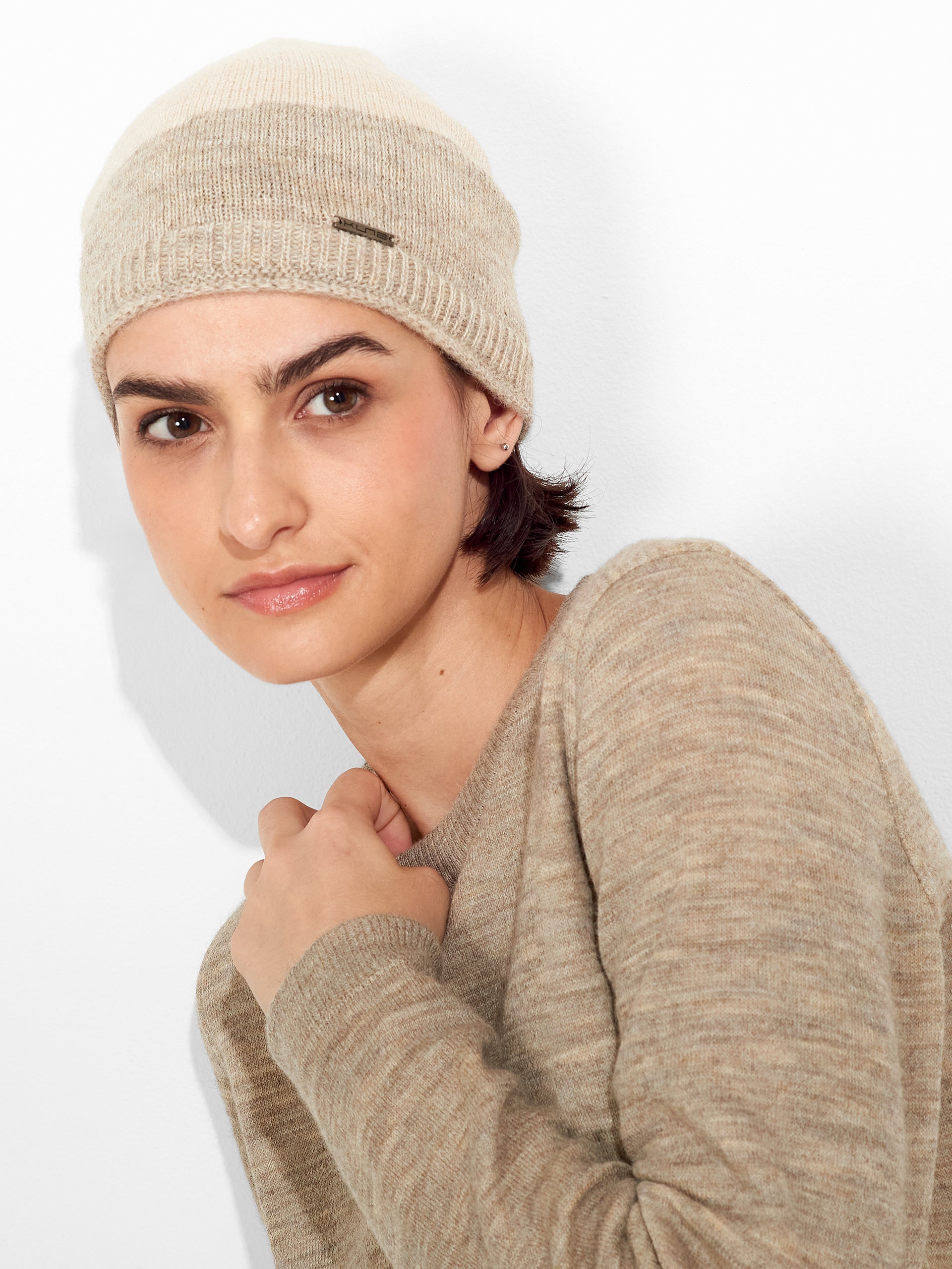 Gorro Zoe en tonalidad beige, tejido en punto con textura diferenciada y un acabado más liso y uniforme. Su diseño se ajusta cómodamente a la cabeza. Confeccionado en baby alpaca, brinda suavidad y calidez. | Material predominante: Baby Alpaca