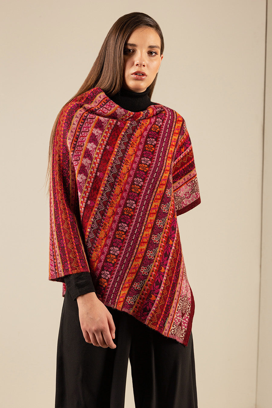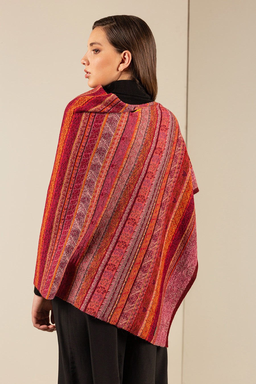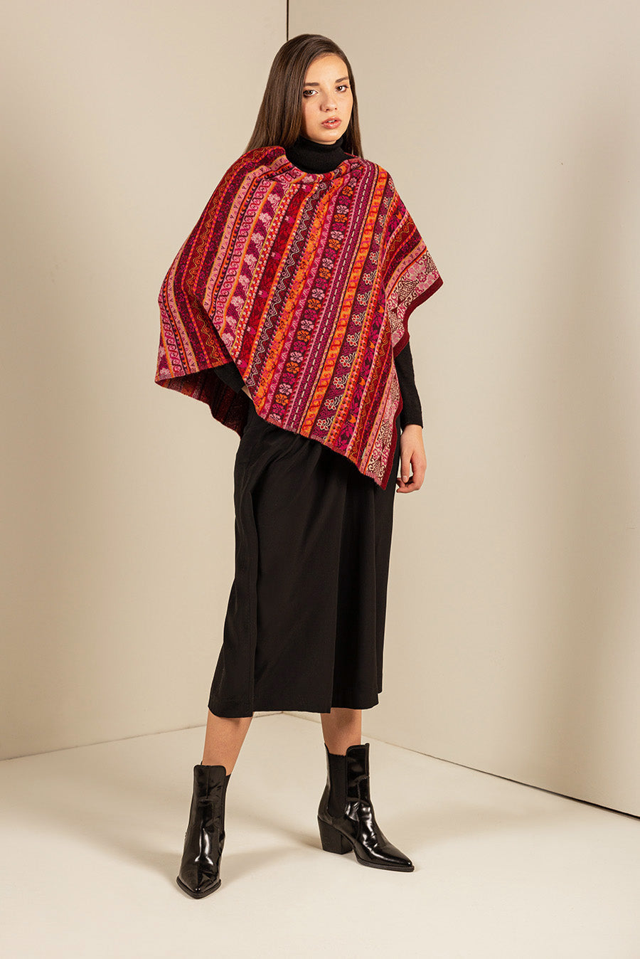 Nuestro poncho Ukali está completamente tejido en un colorido Jacquard con elementos inspirados en los retablos peruanos, una prenda protagonista y diferente para abrigarte con estilo. | Material predominante: Baby Alpaca