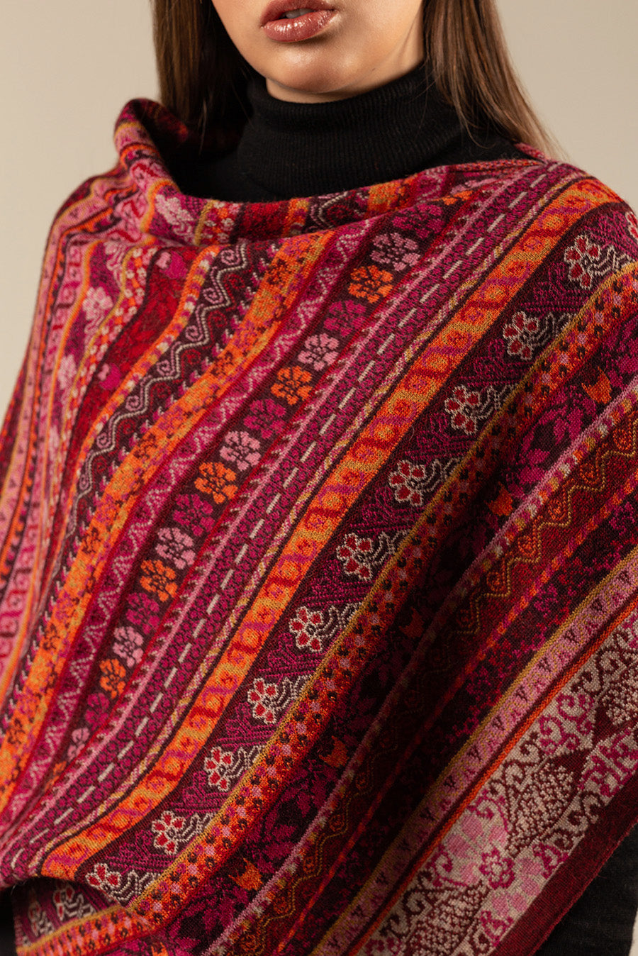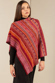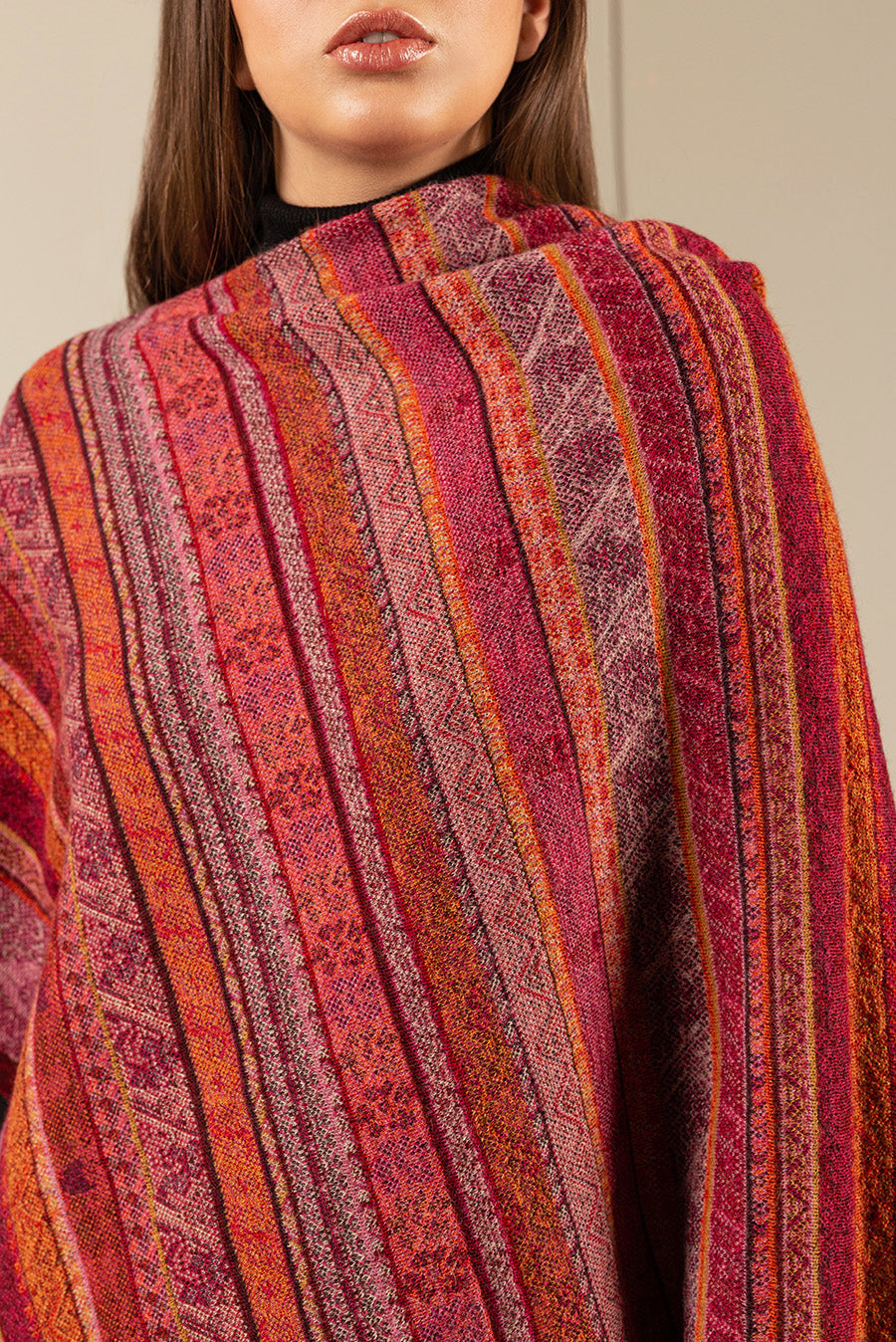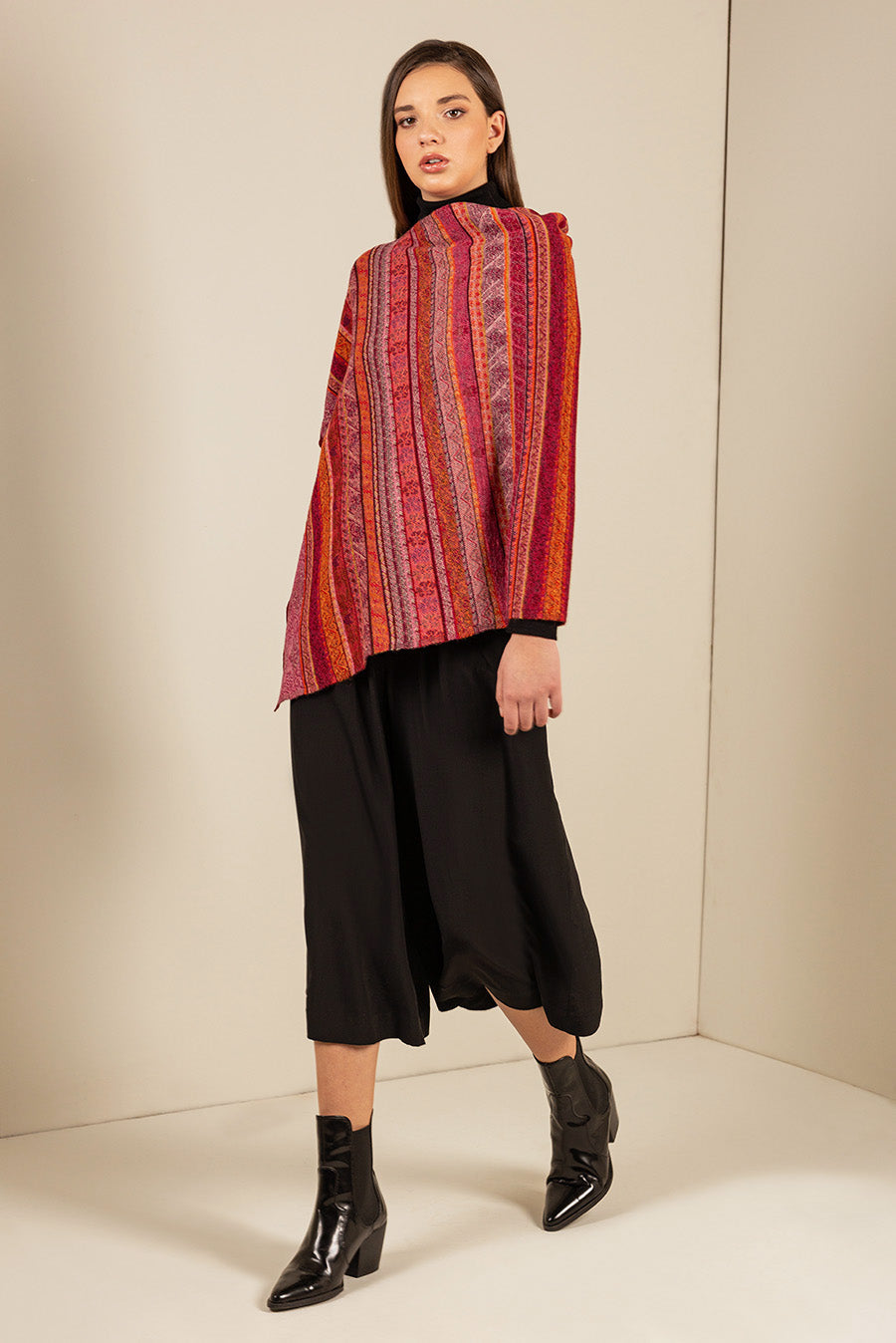 Nuestro poncho Ukali está completamente tejido en un colorido Jacquard con elementos inspirados en los retablos peruanos, una prenda protagonista y diferente para abrigarte con estilo. | Material predominante: Baby Alpaca