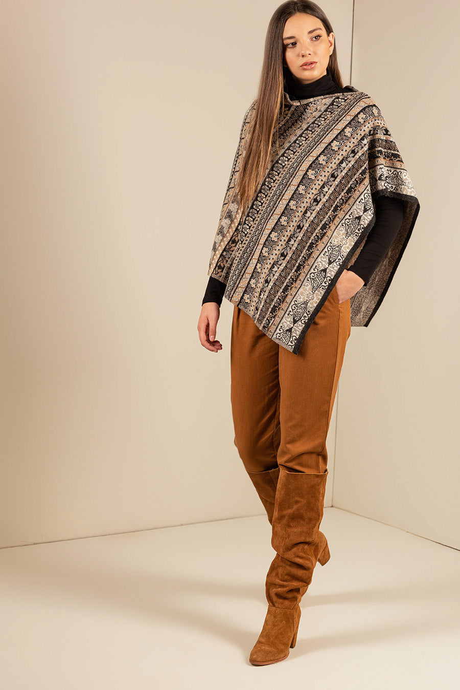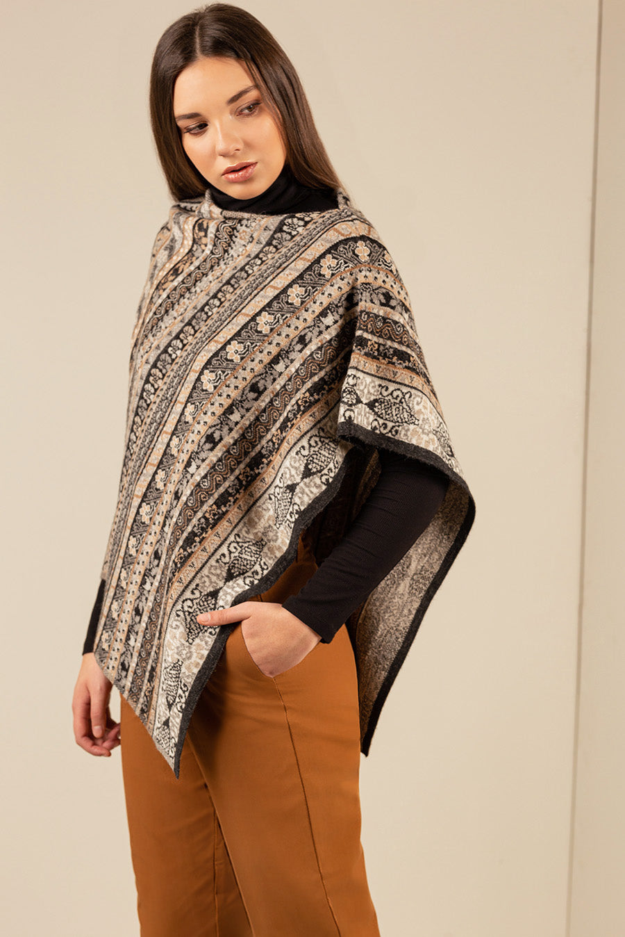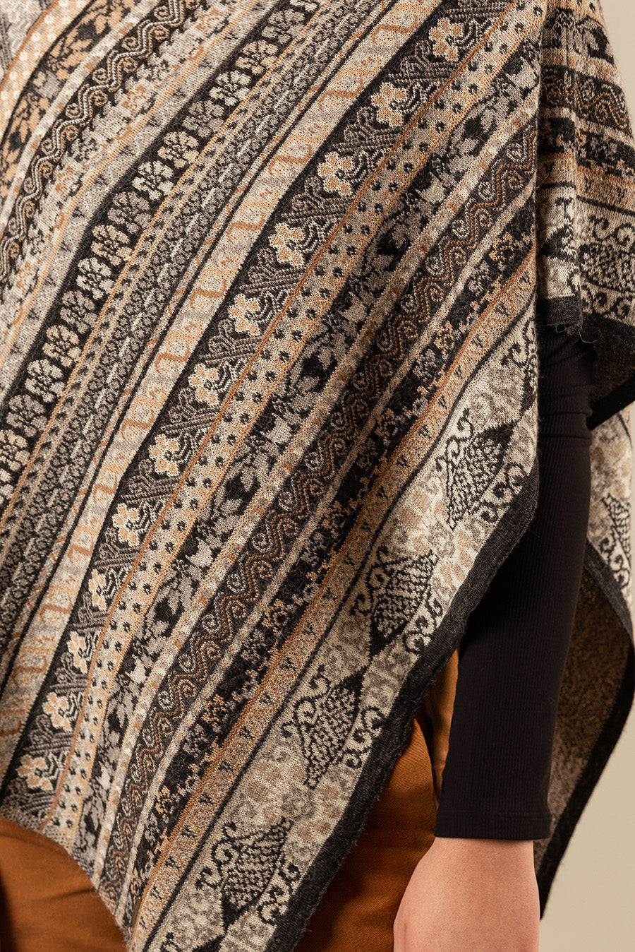 Nuestro poncho Ukali está completamente tejido en un colorido Jacquard con elementos inspirados en los retablos peruanos, una prenda protagonista y diferente para abrigarte con estilo. | Material predominante: Baby Alpaca