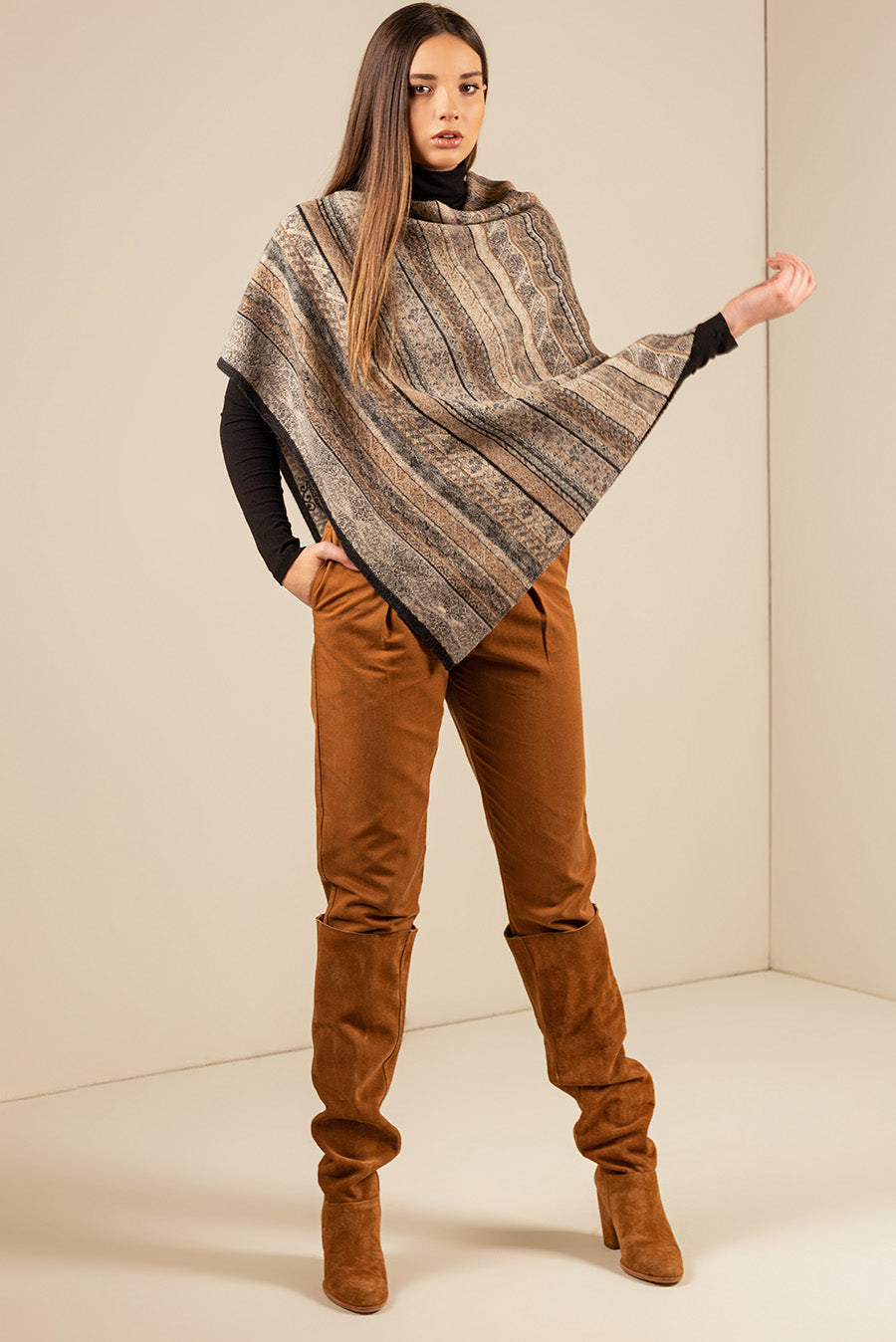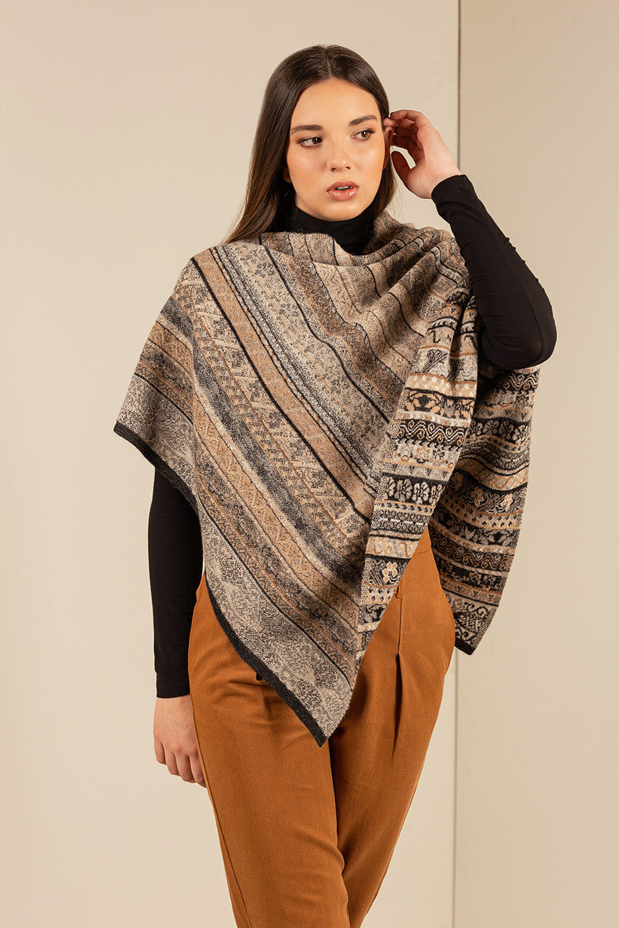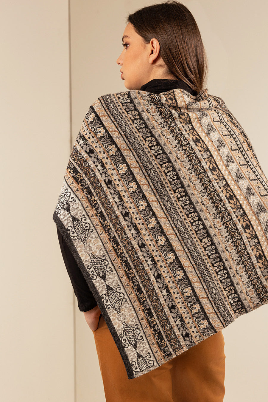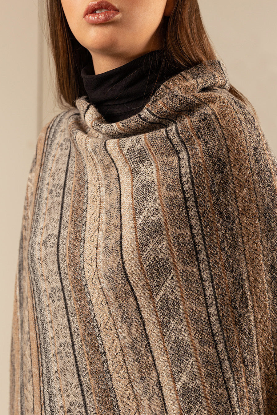 Nuestro poncho Ukali está completamente tejido en un colorido Jacquard con elementos inspirados en los retablos peruanos, una prenda protagonista y diferente para abrigarte con estilo. | Material predominante: Baby Alpaca