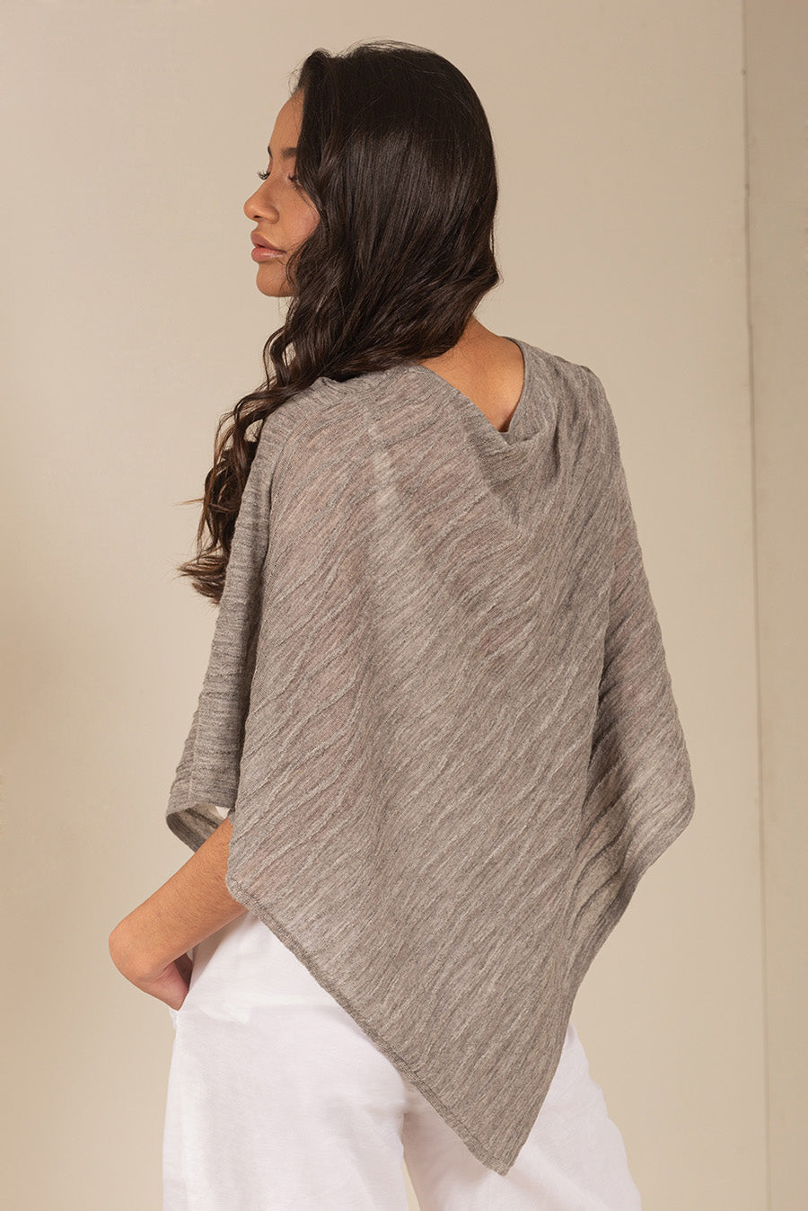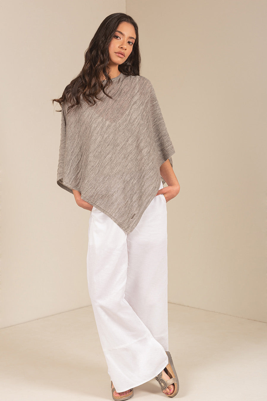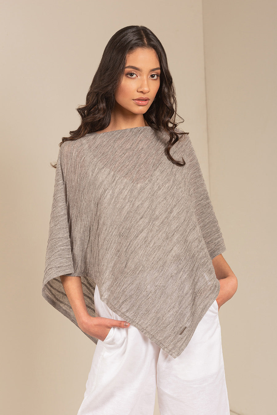 Inspirado en una apacible brisa de verano, nuestro poncho Ustinov, elaborado con hilado de baby alpaca y seda, evoca la suavidad de una caricia gracias a su agradable textura y ligera caída. | Material predominante: Baby Alpaca