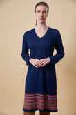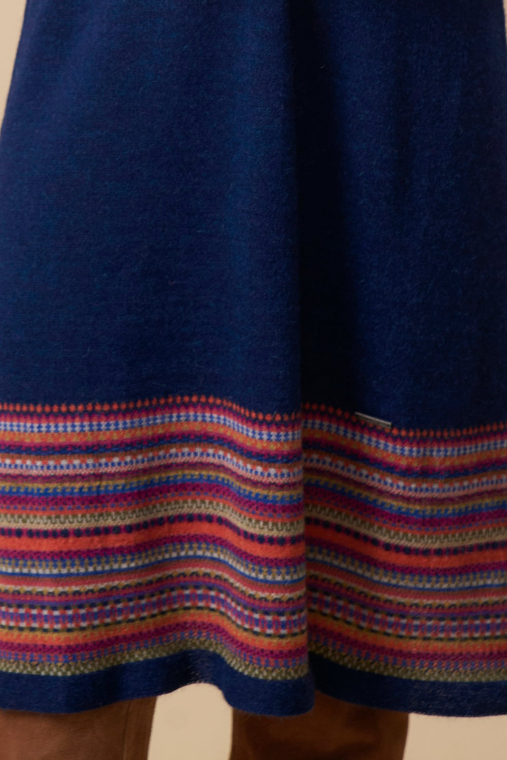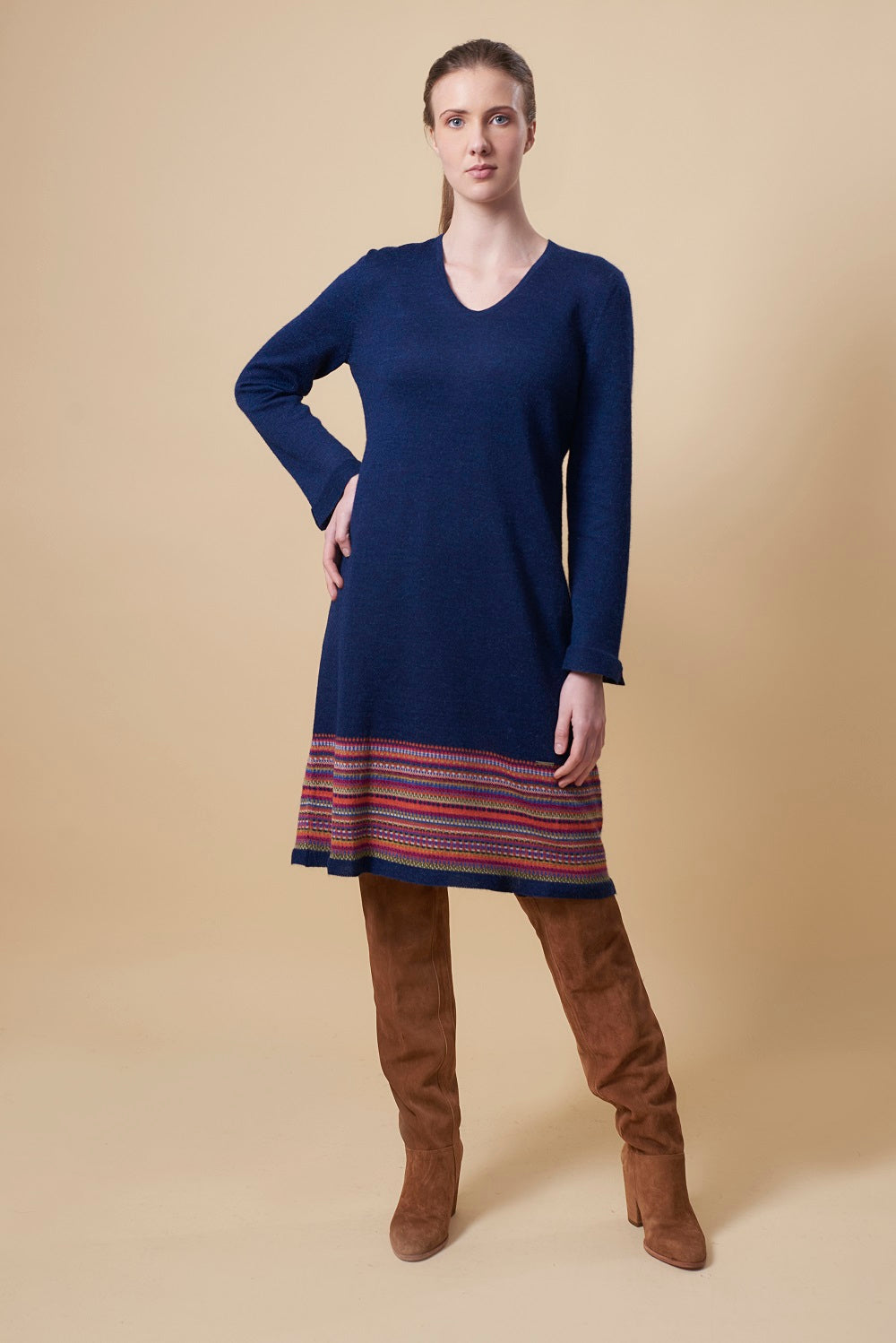 Nuestro cómodo y suave vestido hecho en 100% baby alpaca, cautiva por su elegante caída y vistoso diseño étnico plasmado en Jacquard ubicado en la parte inferior de la prenda. Combínalo con botas es ideal para lucirlo en esta fría temporada. | Material predominante: Baby Alpaca