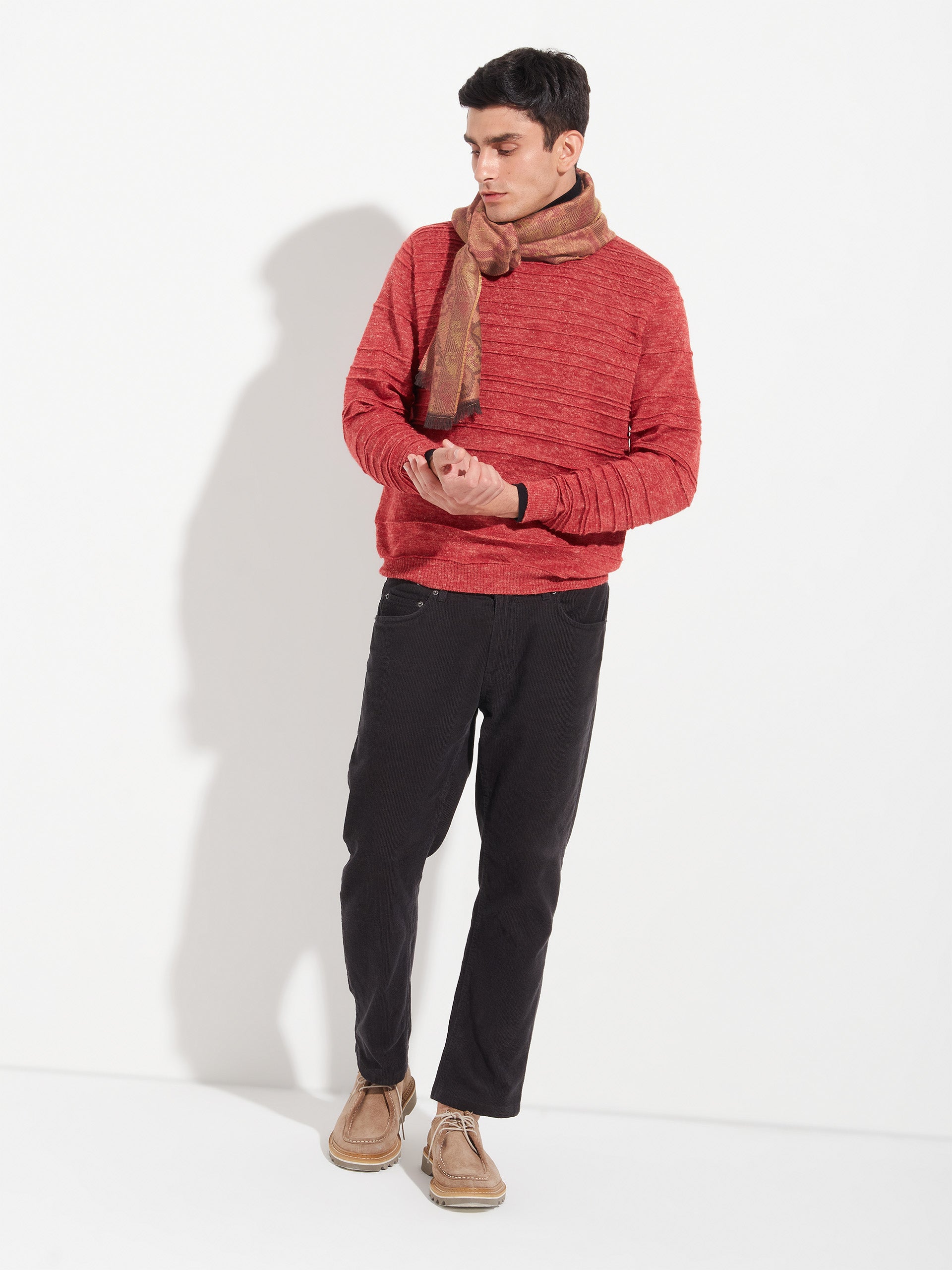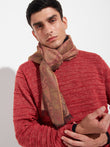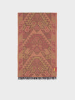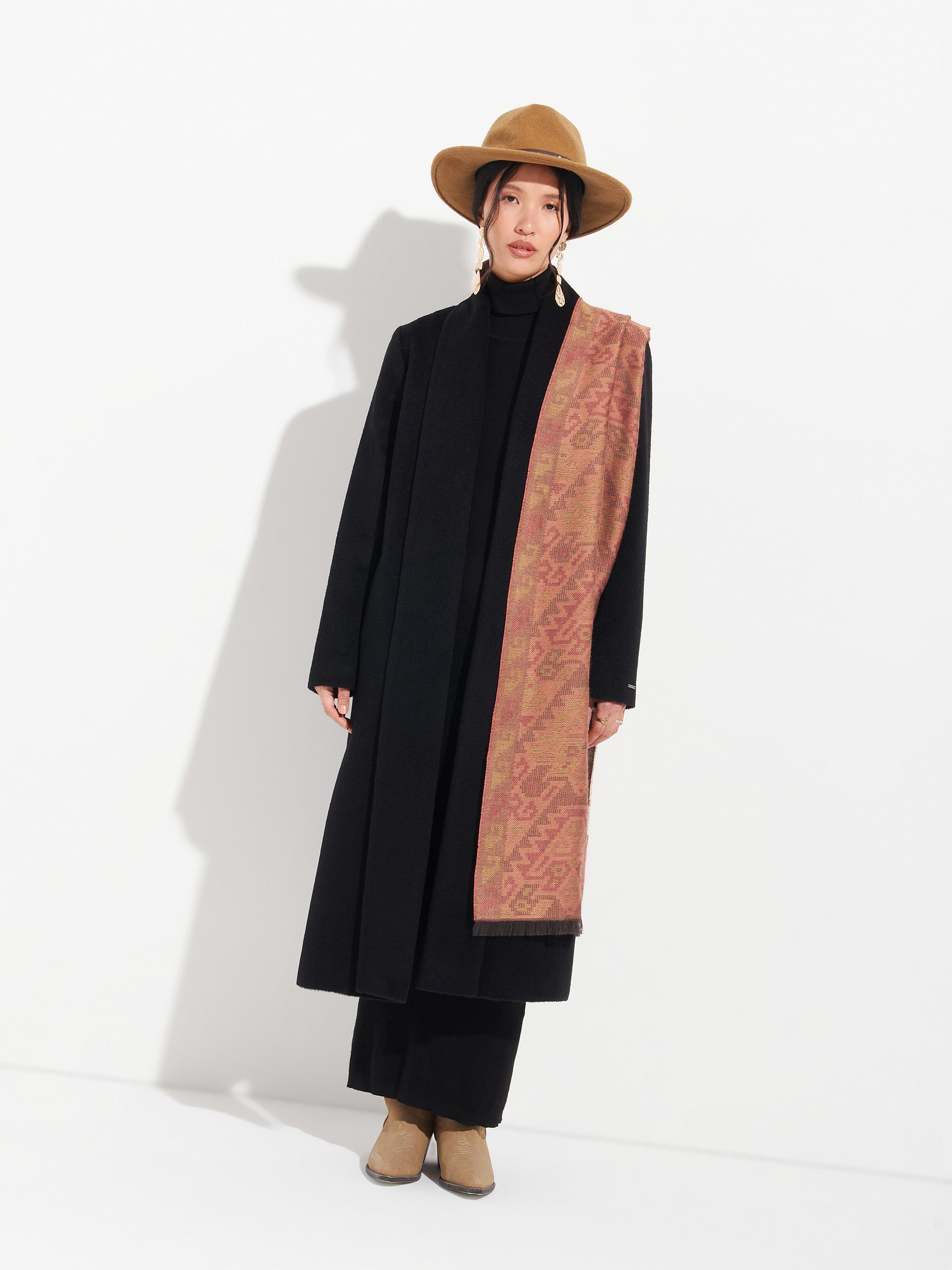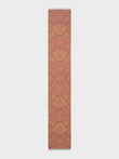 Chalina Chancay 38 en tonalidad naranja, elaborada en 70% baby alpaca y 30% seda, con técnica Jacquard en doble cara. Con una medida de 200/196 x 30 cm, es un accesorio unisex y reversible, inspirado en la Cultura Chancay, que conecta con la memoria ancestral a través de un diseño auténticamente cultural. | Material predominante: Baby Alpaca