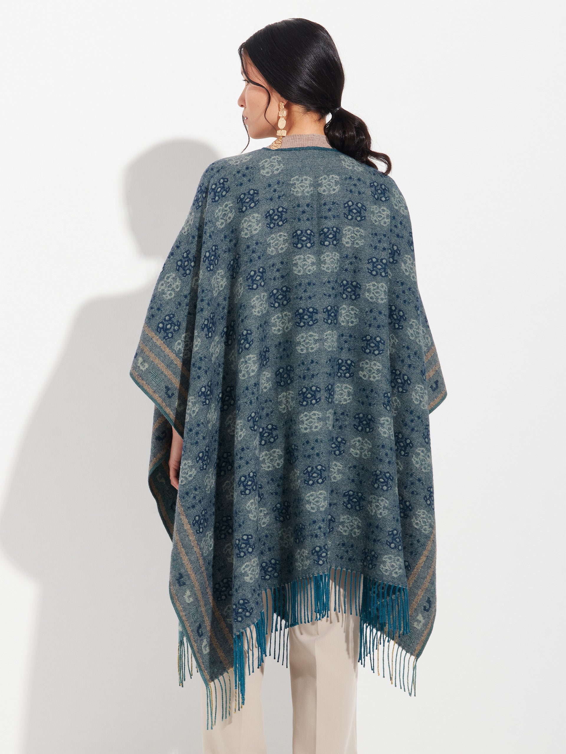 Poncho Chancay 35 en tonalidad azul, elaborado en 100% baby alpaca con técnica Jacquard en doble cara. Es una prenda reversible, inspirada en la Cultura Chancay, que mantiene viva la tradición ancestral en un diseño representativo de la identidad cultural. | Material predominante: Baby Alpaca