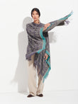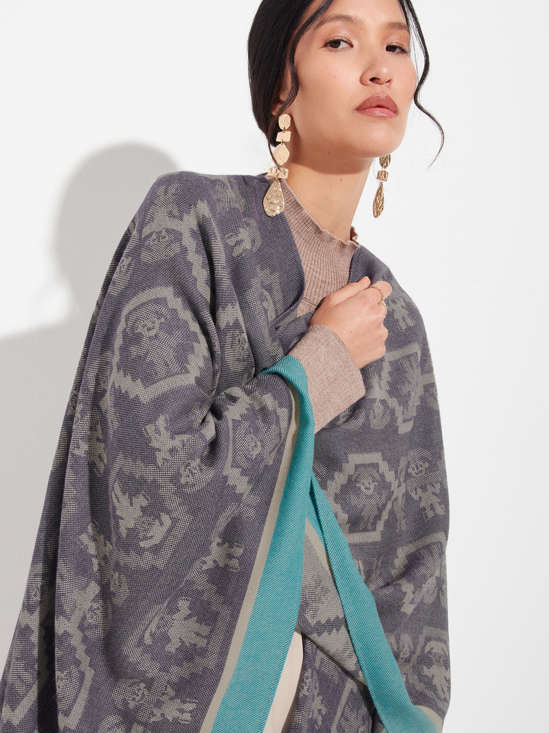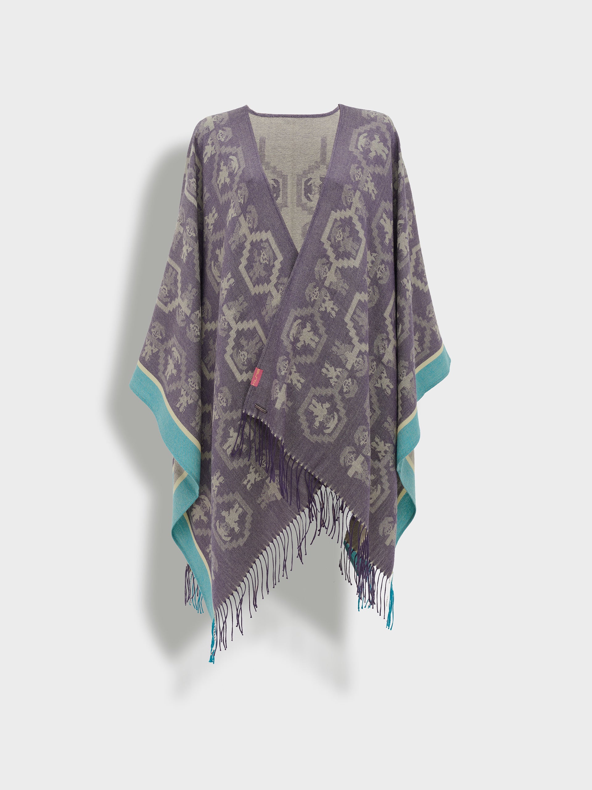 Poncho Chimu 12 en tonalidad morado, elaborado en 100% Alpaca Royal con técnica Jacquard satín (tela simple). Es una prenda reversible, inspirada en la Cultura Chimú, que refleja el valor de la tradición ancestral a través de un diseño lleno de identidad cultural. | Material predominante: Royal Alpaca