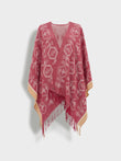 Poncho Chimu 12 en tonalidad rojo, elaborado en 100% Alpaca Royal con técnica Jacquard satín (tela simple). Es una prenda reversible, inspirada en la Cultura Chimú, que refleja el valor de la tradición ancestral a través de un diseño lleno de identidad cultural. | Material predominante: Royal Alpaca
