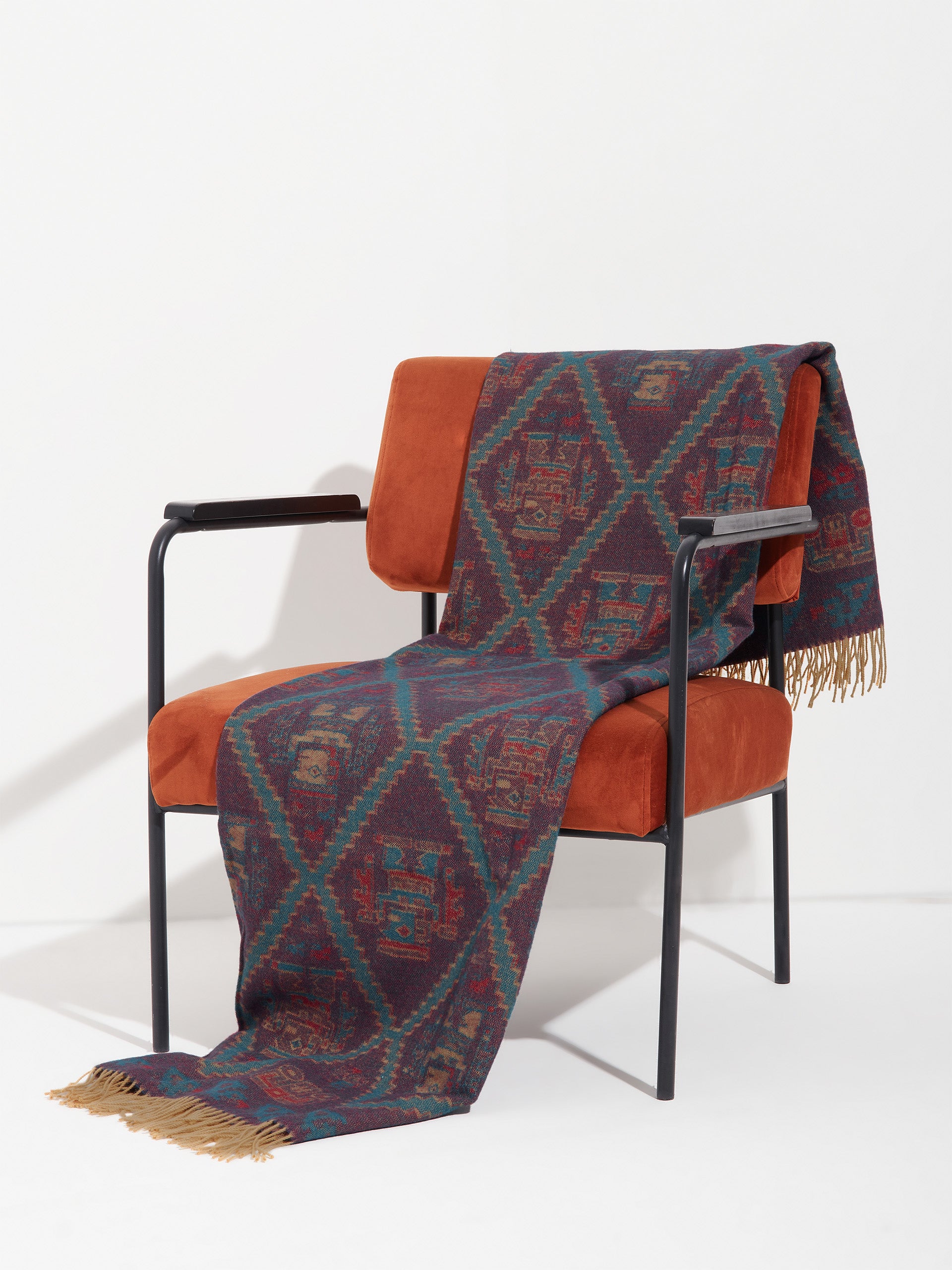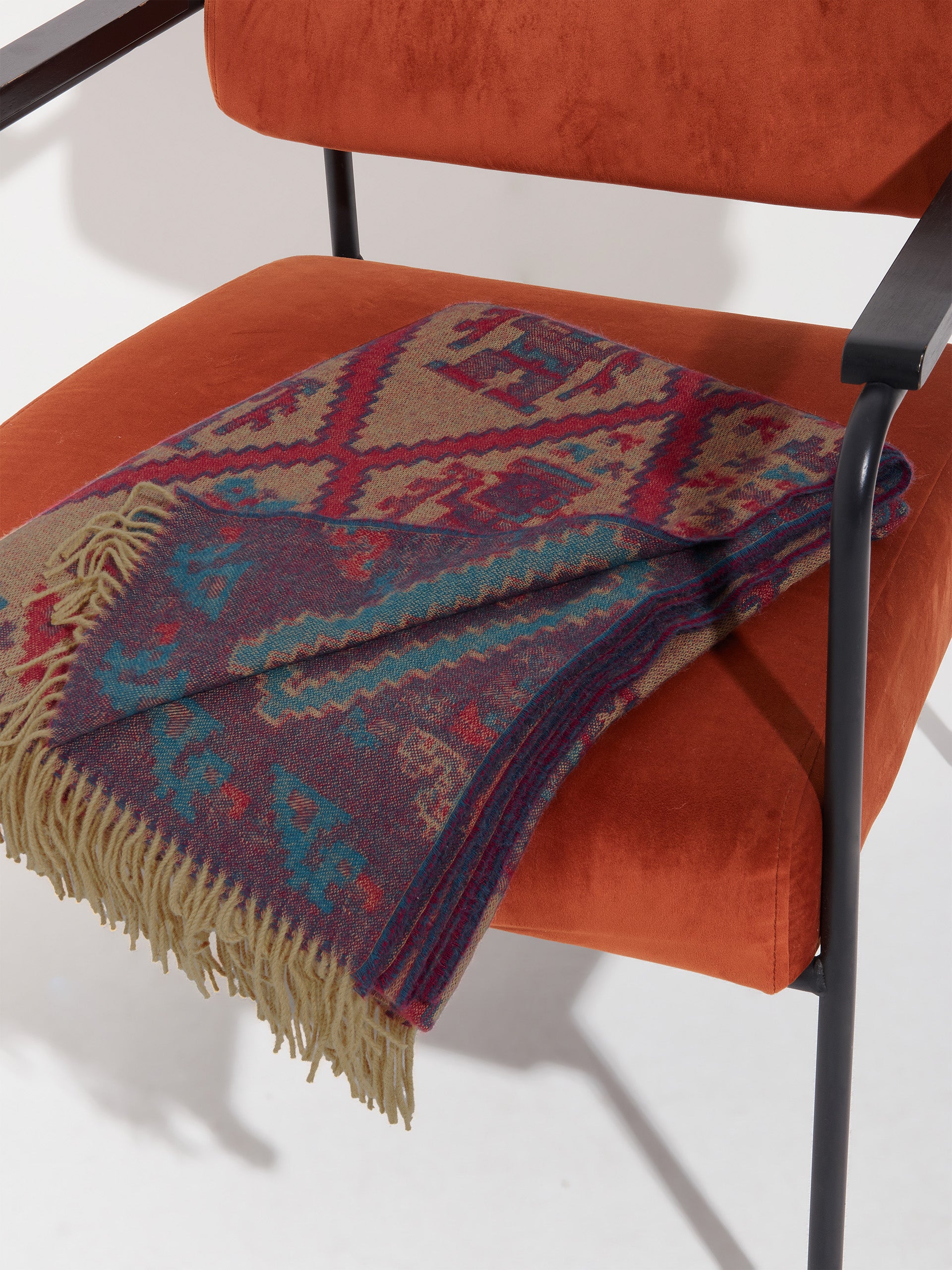 Manta Mochica 2 en tonalidad amarillo, elaborada en 100% baby alpaca con técnica Jacquard en doble cara. Con una medida de 200/184 x 145 cm, está inspirada en la Cultura Mochica, que reinterpreta el legado ancestral en un diseño inspirado en la cultura originaria. | Material predominante: Baby Alpaca